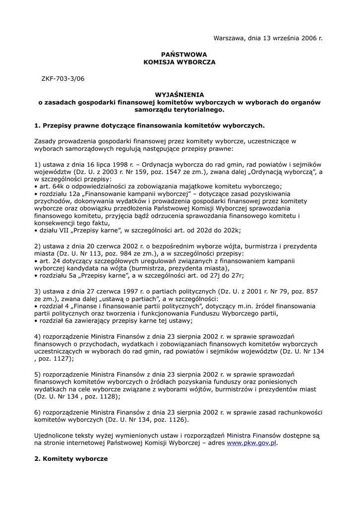 Warszawa, dnia 13 września 2006 r. PAŃSTWOWA KOMISJA WYBORCZA ZKF-703-3/06 WYJAŚNIENIA o zasadach gospodarki finansowej komitetów wyborczych w wyborach do organów samorządu terytorialnego. 1. Przepisy prawne dotyczące finansowania komitetów wyborczych. Zasady prowadzenia gospodarki finansowej przez komitety wyborcze, uczestniczące w wyborach samorządowych regulują następujące przepisy prawne: 1) ustawa z dnia 16 lipca 1998 r. – Ordynacja wyborcza do rad gmin, rad powiatów i sejmików województw (Dz. U. z 2003 r. Nr 159, poz. 1547 ze zm.), zwana dalej „Ordynacją wyborczą”, a w szczególności przepisy: • art. 64k o odpowiedzialności za zobowiązania majątkowe komitetu wyborczego; • rozdziału 12a „Finansowanie kampanii wyborczej” – dotyczące zasad pozyskiwania przychodów, dokonywania wydatków i prowadzenia gospodarki finansowej przez komitety wyborcze oraz obowiązku przedłożenia Państwowej Komisji Wyborczej sprawozdania finansowego komitetu, przyjęcia bądź odrzucenia sprawozdania finansowego komitetu i konsekwencji tego faktu, • działu VII „Przepisy karne”, w szczególności art. od 202d do 202k; 2) ustawa z dnia 20 czerwca 2002 r. o bezpośrednim wyborze wójta, burmistrza i prezydenta miasta (Dz. U. Nr 113, poz. 984 ze zm.), a w szczególności przepisy: • art. 24 dotyczący szczegółowych uregulowań związanych z finansowaniem kampanii wyborczej kandydata na wójta (burmistrza, prezydenta miasta), • rozdziału 5a „Przepisy karne”, a w szczególności art. od 27j do 27r; 3) ustawa z dnia 27 czerwca 1997 r. o partiach politycznych (Dz. U. z 2001 r. Nr 79, poz. 857 ze zm.), zwana dalej „ustawą o partiach”, a w szczególności: • rozdział 4 „Finanse i finansowanie partii politycznych”, dotyczący m.in. źródeł finansowania partii politycznych oraz tworzenia i funkcjonowania Funduszu Wyborczego partii, • rozdział 6a zawierający przepisy karne tej ustawy; 4) rozporządzenie Ministra Finansów z dnia 23 sierpnia 2002 r. w sprawie sprawozdań finansowych o przychodach, wydatkach i zobowiązaniach finansowych komitetów wyborczych uczestniczących w wyborach do rad gmin, rad powiatów i sejmików województw (Dz. U. Nr 134 , poz. 1127); 5) rozporządzenie Ministra Finansów z dnia 23 sierpnia 2002 r. w sprawie sprawozdań finansowych komitetów wyborczych o źródłach pozyskania funduszy oraz poniesionych wydatkach na cele wyborcze związane z wyborami wójtów, burmistrzów i prezydentów miast (Dz. U. Nr 134 , poz. 1128); 6) rozporządzenie Ministra Finansów z dnia 23 sierpnia 2002 r. w sprawie zasad rachunkowości komitetów wyborczych (Dz. U. Nr 134, poz. 1126). Ujednolicone teksty wyżej wymienionych ustaw i rozporządzeń Ministra Finansów dostępne są na stronie internetowej Państwowej Komisji Wyborczej – adres www.pkw.gov.pl. 2. Komitety wyborcze Prawo zgłaszania kandydatów na radnych oraz kandydatów na wójtów (burmistrzów, prezydentów miast) mają partie polityczne, koalicje partii politycznych, stowarzyszenia i organizacje społeczne oraz wyborcy. Czynności wyborcze w imieniu partii politycznych, koalicji wyborczych partii politycznych, stowarzyszeń i organizacji społecznych oraz wyborców wykonują komitety wyborcze od dnia wydania przez Państwową Komisję Wyborczą albo komisarza wyborczego postanowienia o przyjęciu zawiadomienia o ich utworzeniu. Dopiero po zarejestrowaniu się komitety wyborcze mogą podejmować działania związane z pozyskiwaniem środków finansowych i ich wydatkowaniem. Prawo do prowadzenia kampanii wyborczej na rzecz kandydatów przysługuje, na zasadzie wyłączności, komitetowi wyborczemu (art. 64b Ordynacji wyborczej). Oznacza to, że w okresie kampanii wyborczej wszelkie czynności związane z pozyskiwaniem środków finansowych, dokonywaniem wydatków na organizowanie spotkań przedwyborczych i promocją poszczególnych kandydatów w formie plakatów, ulotek itd. mogą być prowadzone tylko przez komitety wyborcze. Nie mogą takich działań prowadzić sami kandydaci, a także partie polityczne, stowarzyszenia i inne organizacje, których członkiem jest dany kandydat lub jest przez te podmioty popierany. Pełnomocnik finansowy komitetu wyborczego jest odpowiedzialny za prowadzenie gospodarki finansowej komitetu (art. 82a ust. 1 Ordynacji wyborczej), a w szczególności za ewidencjonowanie wpływów i wydatków oraz sporządzenie sprawozdania finansowego i przedłożenie go właściwemu organowi wyborczemu w terminie określonym w art. 84 ust. 2 Ordynacji wyborczej. Pełnomocnik finansowy może upoważnić inne osoby do podejmowania określonych czynności związanych z dokonywaniem wydatków komitetu wyborczego w jego strukturach terenowych. Nie zwalnia to jednak pełnomocnika z odpowiedzialności za całokształt gospodarki finansowej komitetu. Pełnomocnik finansowy ponosi odpowiedzialność karną za zawinione naruszenie zakazów i ograniczeń w pozyskiwaniu i wydatkowaniu środków. W razie złożenia rezygnacji przez pełnomocnika finansowego z pełnionej funkcji i powołania nowego pełnomocnika, należy o tym fakcie powiadomić Państwową Komisję Wyborczą lub komisarza wyborczego w trybie przepisów o utworzeniu komitetu wyborczego (art. 64c ust. 2, art. 64d ust. 4, art. 64e ust. 2 i art. 64f ust. 2 Ordynacji wyborczej). Zgodnie z art. 64k Ordynacji wyborczej odpowiedzialność za zobowiązania majątkowe: a) komitetu wyborczego partii politycznej albo organizacji ponosi partia polityczna albo organizacja, która utworzyła komitet wyborczy, a w przypadku komitetu wyborczego utworzonego przez stowarzyszenie zwykłe – solidarnie członkowie stowarzyszenia; b) koalicyjnego komitetu wyborczego partii politycznych ponoszą solidarnie partie polityczne wchodzące w skład koalicji wyborczej; c) komitetu wyborczego wyborców ponoszą solidarnie osoby wchodzące w skład komitetu. Odpowiedzialność solidarna polega na tym, że wierzyciel może żą