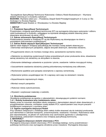 Szczegółowa Specyfikacja Techniczna Wykonania i Odbioru Robót Budowlanych – Wymiana stolarki okiennej pcv w budynku szkolnym. BUDOWA: Wymiana okien pcv – Powiatowy Zespół Szkół Ponadgimnazjalnych nr 2 przy ul. Św. Andrzeja 4 w Środzie Śląskiej INWESTOR:Powiat Średzki ul. Wrocławska 2 w Środzie Śląskiej 1. WSTĘP 1.1. Przedmiot Specyfikacji Technicznych Przedmiotem niniejszej specyfikacji technicznej (ST) są wymagania dotyczące wykonania i odbioru robót budowlanych w budynku, polegające na wymianie istniejącej stolarki okiennej (okna drewniane skrzynkowe) na okna z PCV. 1.2. Zakres stosowania Specyfikacji Technicznych Postanowienia zawarte w niniejszej ST są dla Wykonawcy są obowiązujące na równi z pozostałymi dokumentami przetargowymi. 1.3. Zakres Robót objętych Specyfikacjami Technicznymi Zakres robót objętych niniejszą specyfikacją dla montażu nowej stolarki okiennej pcv • Demontaż wewnętrznych parapetów, zdjęcie skrzydeł okiennych, demontaż ościeżnic, • Przygotowanie otworu do montażu nowego okna, sprawdzenie wymiarów otworu, • Założenie na ościeżnicę systemowych kotew przewidzianych przez producenta okna, obsadzenie samej ościeżnicy lub ościeżnicy ze skrzydłami w otworze, • Dokonanie dokładnego ustawienia w poziomie i pionie, osadzenie kołków mocujących kotwy, • Uszczelnienie osadzenia ościeżnicy pianką poliuretanową montażową oraz silikonem, • Wyrównanie spadków pod parapety wewnętrzne z zaprawy cementowej, • Wykonanie tynków uzupełniające kat. III z zaprawy cem-wap na ościeżach i ścianie, • Szpachlowanie naprawionych miejsc, • Montaż nowych parapetów • Wykonać roboty wykończeniowe, • Wywieźć i zutylizować materiały z rozbiórki, 1.4. Określenia podstawowe Określenia podstawowe są zgodne z odpowiednimi, obowiązującymi polskimi normami. 1.4.1. Roboty budowlane przy instalowaniu okien. Należy przez to rozumieć wszystkie roboty związane z demontażem starych okien drewnianych, z przygotowaniem otworów, montażem nowej stolarki PCV, wykończeniem oraz innymi pracami dodatkowymi związanymi z wymianą okien. 1.5. Ogólne wymagania dotyczące Robót Przy robotach związanych z instalacją okien należy ściśle stosować się do instrukcji producenta tych elementów w zakresie transportu, przechowywania, osadzania i montażu. Wykonawca robót jest odpowiedzialny, za jakość ich wykonania oraz zachowanie zgodności z udostępnioną dokumentacją, poleceniami inwestora oraz niniejszą specyfikacją techniczną. 2. MATERIAŁY 2.1. Wymagania dotyczące stolarki otworowej z PCV. Wymagania dotyczące stolarki otworowej z PCV określają katalogi, normy przedmiotowe i publikacje techniczne oraz wymagania określone przez inwestora. Wymagania dotyczące charakterystyki termicznej stolarki otworowej w przegrodach zewnętrznych określa norma PN-ISO 6946 „Ochrona cieplna budynków”. Parametry akustyczne okien muszą spełniać warunki między innymi normy PN-87/B-02151.03 „Akustyka budowlana. Ochrona przed hałasem pomieszczeń w budynkach. Izolacyjność akustyczna przegród w budynkach oraz izolacyjność akustyczna elementów budowlanych. Wymagania”. 2.2. Zastosowane materiały. • Zaprawa cementowa -wapienna, • Pianka montażowa, • Gips budowlany szpachlowy • Silikon do robót zewnętrznych, • Elementy do montażu okien, • Kotwy, kołki rozporowe, • Parapety wewnętrzne • Zaprawa klejowa • Farba emulsyjna • Folia polietylenowa budowlana osłonowa • Tektura falista • Okno z PCV 2.3.1 Okna- zestawienie Załączone w przedmiarach zestawienie stolarki jest dla celów wyceny przez oferentów. Wykonawca po podpisaniu umowy jest zobowiązany do szczegółowego obmiaru otworów przed przestąpieniem do produkcji okien. 2.3.2. Okna z PVC – wymagania. Montaż nowych okien PCV, kolor biały od środka, na zewnątrz oklejone okleiną w kolorze naturalnego drewna , pakiet szybowy 4/16/4 (u = 1,1) - wymiar otworu sprawdzić na budowie. Profil bezołowiowy, 5-komorowy. 1.3.3 Parapety. 1. Parapety wewnętrzne PCV w kolorze białym. 2. SPRZĘT 3.1. Sprzęt do osadzenia okien Wykonawca przystępujący do wykonania tych robót powinien wykazać się możliwością korzystania z drobnego sprzętu budowlanego oraz elektronarzędzi. 4. TRANSPORT 4.1. Ogólne wymagania dotyczące transportu Określa je norma PN-B-05000: 1996 „Okna i drzwi. Pakowanie przechowywanie i transport". 4.2. Transport i rozładunek Transport powinien odbywać się samochodami zakrytymi z pełnym zabezpieczeniem przed uszkodzeniami. Rozładunek powinien obywać się przy zachowaniu pełnej ostrożności i ochrony przed uszkodzeniami 4.3. Składowanie Składowanie powinno odbywać się w pomieszczeniach zamkniętych, suchych, przewiewnych. Zmontowane komplety ram okiennych z oknami ustawia się w położeniu pionowym, oparte o siebie z nachyleniem 5-10%. Warunki transportu i składowania muszą chronić wyroby przed uszkodzeniem uszczelek, okuć, szyb jak również malarskiego wykończenia. Nie wolno składować okien (nawet przez krótki okres) pod gołym niebem, w miejscach zawilgoconych, bezpośrednio na ziemi i w podobnie niekorzystnych warunkach. 5. WYKONANIE ROBÓT 5.1 Warunki przystąpienia do robót Roboty powinny być przeprowadzone w temperaturze nie niższej niż + 5°C. Pomieszczenia powinny być suche i przewietrzone. 5.3. Instalacja i montaż okien. Wykonawca zobowiązany jest do wykonania robót związanych z instalacją i montażem okien zgodnie z instrukcjami i wytycznymi producentów elementów związanych z tematem zadań. 5.3.1. Zabezpieczenie elementów w trakcie prowadzenia innych robót budowlanych. Najbardziej narażone na uszkodzenia i zanieczyszczenia przed zabudowaniem są wyroby stolarki otworowej z PVC. Uszkodzenia mechaniczne ościeżnic powstają najczęściej wskutek nieostrożnego transportu materiałów. 5.3.2. Sposoby mocowania stolarki otworowej Przed rozpocz