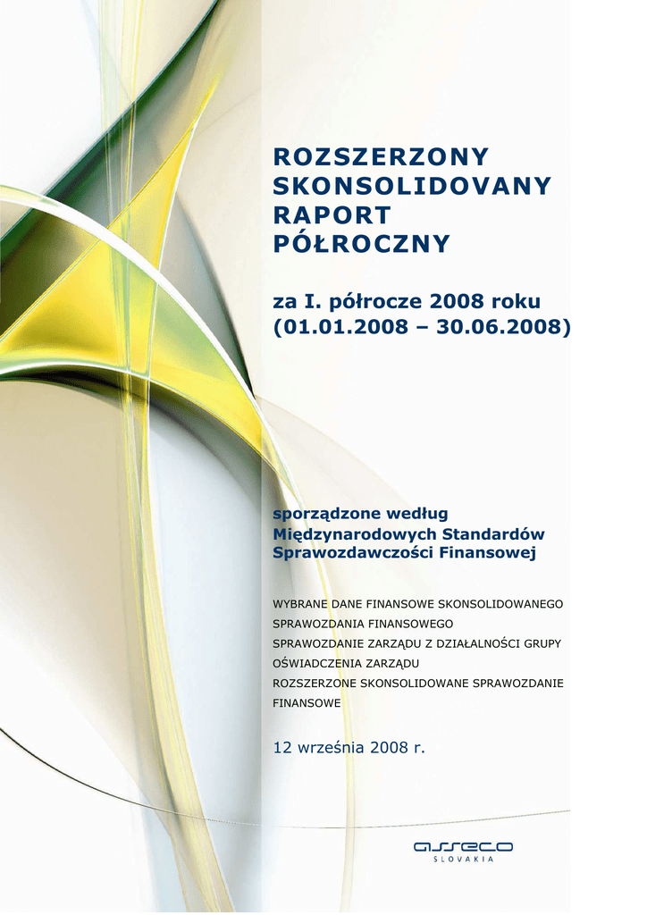 Skonsolidowany Raport Półroczny Grupy Asseco Slovakia za I półrocze 2008 r. ROZSZERZONY SKONSOLIDOVANY RAPORT PÓŁROCZNY za I. półrocze 2008 roku (01.01.2008 – 30.06.2008) sporządzone według Międzynarodowych Standardów Sprawozdawczości Finansowej WYBRANE DANE FINANSOWE SKONSOLIDOWANEGO SPRAWOZDANIA FINANSOWEGO SPRAWOZDANIE ZARZĄDU Z DZIAŁALNOŚCI GRUPY OŚWIADCZENIA ZARZĄDU ROZSZERZONE SKONSOLIDOWANE SPRAWOZDANIE FINANSOWE 12 września 2008 r. 1 z 46 Skonsolidowany Raport Półroczny Grupy Asseco Slovakia za I półrocze 2008 r. Wstęp W odróŜnieniu od przebiegającej w roku 2007 „gorączki zakupów“, która polegała na akwizycji nowych spółek na rzecz grupy Asseco Slovakia, w pierwszym półroczu 2008 roku spółka ta skupiała się przede wszystkim na umocnieniu swojej pozycji lidera w regionie Europy Środkowej. Asseco Slovakia po raz drugi od notowania na Giełdzie Warszawskiej (w październiku 2006r.) wprowadziła na Giełdę Papierów Wartościowych w Warszawie akcje nowej emisji. Nowe akcje były emitowane do wysokości 20% istniejącego kapitału podstawowego spółki, tj. w sumie 3 560 0000 akcji (biorąc pod uwagę poprzedzający podział akcji w stosunku 1:10). Nowo emitowane akcje były przeznaczone do sprzedaŜy w postaci publicznej emisji dla instytucjonalnych inwestorów na podstawie prospektu, który 25 kwietnia 2008r. zatwierdził Narodowy Bank Słowacji. Book-building nastąpił w dniach 25 aŜ 26 maja, na podstawie którego 28 maja 2008 r. ogłoszono cenę emisyjną na poziomie 30,50 PLN za akcję. Lokowanie miało miejsce w dniach 29 aŜ 30 maja 2008r. Cały proces SPO zakończono w dniu 19 czerwca 2008r., kiedy Krajowy Depozyt Papierów Wartościowych S.A zarejestrował nowo wyemitowane akcje które są od tego dnia zbywalne na Giełdę Papierów Wartościowych w Warszawie. Sam proces wtórnej oferty subskrypcji był poprzedzony uzyskaniem 100% procentowej własności w Asseco Czech Republic, a.s.. Zostało to osiągnięte z dniem 25.2.2008 r. przez podpisanie umowy pomiędzy Asseco Poland i Asseco Slovakia, a.s. o wkładzie 7 970 000 szt akcji zwykłych na okaziciela spółki Asseco Czech Republic, a.s. na mienie Asseco Slovakia, a.s. W ten sposób spółka Asseco Slovakia, a.s. zakończyła proces przejęcia na rynku czeskim i została właścicielem 100% akcji czeskiego filaru Grupy ASSECO, który od 2007 roku posiada równieŜ udziały większościowe w spółkach BERIT, a.s. i LCS International, a.s. W dniu 22 kwietnia 2008 roku spółka Asseco Slovakia, a.s. nabyła kolejne 40,75% udziałów w spółce LCS International, a.s. na podstawie skorzystania z opcji przez pierwotnych akcjonariuszy spółki LCS International, a.s. wynikających z umów opcyjnych na odsprzedaŜ akcji, które zostały podpisane z akcjonariuszami w dniu 4 maja 2007 r., tj. w dniu podpisania umowy o nabyciu 55,03% procentowego udziału w spółce LCS International, a.s. W dniu 8 maja 2008 r. te udziały zostały sprzedane spółce Asseco Czech republic, a.s. Spółka Asseco Slovakia potwierdziła równieŜ swoją pozycję na słowackim rynku IT, o czym świadczą teŜ osiągnięte wyniki na drabince TREND TOP w infotechnologiach prezentowanych w tygodniku gospodarczym TREND. Spółka Asseco Slovakia oprócz innych kategorii umieściła się na czołowym miejscu teŜ w ocenie firm z najwyŜszą EBITDA, gdzie zajęła trzecie miejsce. Drugie miejsce osiągnęła w kategorii Najzyskowniejsza Firma IT. Sukces odniosła teŜ grupa Asseco Slovakia - spółka Datalock zdobyła drugie miejsce w kategorii Producent pakietu softwarowego i spółka Slovanet na podstawie danych drabinki TREND Top Telecom 2008 stał się najdynamiczniej rosnącym świadczeniodawcą usług hurtowych w segmencie telekomunikacyjnym na Słowacji, dzięki czemu ponownie potwierdziła pozycją lidera wśród alternatywnych operatorów telekomunikacyjnym. Grupa Asseco Slovakia w pierwszym półroczu poszerzyła się o dalsze spółki, dzięki akwizycji, realizowanej przez spółkę Slovanet, a.s. po nabyciu 100% udziałów w spółce MICRONET, a.s. oraz w spółce CATV Tekov, s.r.o, która została później (zgodnie z deklarowaną długotrwałą strategią Slovanetu) rozwiązana bez likwidacji poprzez jej połączenie ze spółką Slovanet, a.s. 2 z 45 Skonsolidowany Raport Półroczny Grupy Asseco Slovakia za I półrocze 2008 r. Wybrane dane finansowe skonsolidowanego jednostkowego sprawozdania finansowego oraz Tabela 1: Dane dotyczące skróconego skonsolidowanego sprawozdania finansowego WYBRANE DANE FINANSOWE I.Przychody netto ze sprzedaŜy produktów, towarów i materiałów II.Zysk (strata) z działalności operacyjnej III.Zysk (strata) brutto IV.Zysk (strata) netto przypadający na akcjonariuszy jednostki dominującej V.Przepływy pienięŜne netto z działalności operacyjnej VI. Przepływy pienięŜne netto z działalności inwestycyjnej VII.Przepływy pienięŜne netto z działalności finansowej VIII.Zmiana środków pienięŜnych i ekwiwalentów IX.Aktywa razem X.Zobowiazania długoterminowe XI.Zobowiązania krótkoterminowe XII.Kapitał własny przypadający akcjonariuszom jednostki dominującej XIII.Kapitał zakładowy XIV.Liczba akcji (w szt.) XV.Zysk(strata) przypadający na jedna akcję (w zł /EUR) XVI.Wartośc księgowa na jedną akcjię (w zł /EUR) XVII. Zadeklarowana lub wpłacona dywidenda na jedna akcję (w zł /EUR) w tys. zł 2 kwartały 2 kwartały narastająco narastająco 01.01.2008 01.01.2007 30.06.2008 30.06.2007 w tys. EUR 2 kwartały 2 kwartały narastająco narastająco 01.01.2008 01.01.2007 30.06.2008 30.06.2007 207 031 83 330 59 512 21 654 24 196 10 547 6 955 2 741 25 338 11 822 7 283 3 072 18 172 8 874 5 224 2 306 31 497 (1 758) 9 054 (457) (37 022) (30 512) (10 642) (7 929) 65 476 (21 107) 18 821 (5 485) 49 977 (55 533) 14 366 (14 430) 506 452 167 118 150 990 44 378 90 477 10 776 26 974 2 862 118 785 34 937 35 414 9 277 281 912 114 842 84 047 30 496 2 371 177 7