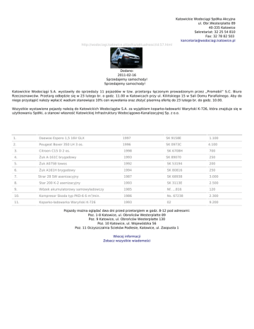 Katowickie Wodociągi Spółka Akcyjna ul. Obr.Westerplatte 89 40-335 Katowice Sekretariat: 32 25 54 810 Fax: 32 78 82 503 [email protected] http://wodociagi.katowice.pl/polka/aktualnosci/id:57.html Dodano: 2011-02-16 Sprzedajemy samochody! Sprzedajemy samochody! Katowickie Wodociągi S.A. wystawiły do sprzedaży 11 pojazdów w tzw. przetargu łączonym prowadzonym przez „Promobil” S.C. Biuro Rzeczoznawców. Przetarg odbędzie się w 23 lutego br. o godz. 11.00 w Katowicach przy ul. Kilińskiego 15 w Sali Domu Parafialnego. Aby do niego przystąpić należy wpłacić wadium stanowiące 10% cen wywołania oraz złożyć pisemną ofertę do 23 lutego br. do godz. 10.00. Wszystkie wystawione pojazdy należą do Katowickich Wodociągów S.A. za wyjątkiem koparko-ładowarki Waryński K-726, która znajduje się w użytkowaniu Spółki, a stanowi własność Katowickiej Infrastruktury Wodociągowo-Kanalizacyjnej Sp. z o.o. Lp. Marka/Typ Rok produkcji Nr rejestracji Cena (zł) 1. Daewoo Espero 1,5 16V GLX 1997 SK 9158E 1.100 2. Peugeot Boxer 350 LH 3 os. 1996 SK 0973C 4.100 3. Citroen C15 D 2 os. 1998 SK 6708H 700 4. Żuk A-161C brygadowy 1993 SK 89070 250 5. Żuk A075B towos 1992 SK 53194 200 6. Żuk A161H brygadowy 1994 SK 80816 250 7. Strar 28 SW asenizacyjny 1987 SK 68938 3.000 8. Star 200 K-2 asenizacyjny 1993 SK 3113E 2.500 9. Wózek akumulatorowy samowyładowczy 1985 Nf. ...816 120 10. Kompresor Skoda typ PKD-6 6 m3/min. 1986 Ns. 67238 2.300 11. Koparko-ładowarka Waryński K-726 1993 02 9.200 Pojazdy można oglądać dwa dni przed przetargiem w godz. 8-12 pod adresami: Poz. 1-8 Katowice, ul. Obrońców Westerplatte 89 Poz. 9 Katowice, ul. Obrońców Westerplatte 130 Poz. 10 Katowice, ul. Wojewódzka 56 Poz. 11 Oczyszczalnia Ścieków Podlesie, Katowice, ul. Zaopusta 1 Wiecej informacji Zobacz wszystkie wiadomości