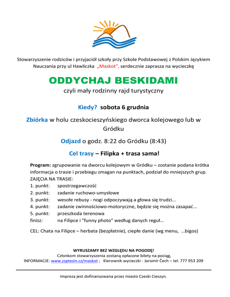 Stowarzyszenie rodziców i przyjaciół szkoły przy Szkole Podstawowej z Polskim Językiem Nauczania przy ul Hawliczka „Maskot“, serdecznie zaprasza na wycieczkę ODDYCHAJ BESKIDAMI czyli mały rodzinny rajd turystyczny Kiedy? sobota 6 grudnia Zbiórka w holu czeskocieszyńskiego dworca kolejowego lub w Gródku Odjazd o godz. 8:22 do Gródku (8:43) Cel trasy – Filipka + trasa sama! Program: zgrupowanie na dworcu kolejowym w Gródku – zostanie podana krótka informacja o trasie i przebiegu zmagan na punktach, podział do mniejszych grup. ZAJĘCIA NA TRASIE: 1. punkt: spostrzegawczość 2. punkt: zadanie ruchowo-umysłowe 3. punkt: wesołe rebusy - nogi odpoczywają a głowa się trudzi... 4. punkt: zadanie zwinnościowo-motoryczne, będzie się można zasapać... 5. punkt: przeszkoda terenowa finisz: na Filipce i "funny photo" według danych reguł… CEL: Chata na Filipce – herbata (bezpłatnie), ciepłe danie (wg menu, …bigos) WYRUSZAMY BEZ WZGLĘDU NA POGODĘ! Członkom stowarzyszenia zostaną opłacone bilety na pociąg, INFORMACJE: www.zsptesin.cz/maskot ; Kierownik wycieczki - Jaromír Čech – tel. 777 953 209 Impreza jest dofinansowana przez miasto Czeski Cieszyn. Tato akce se koná za finanční podpory Města Český Těšín.