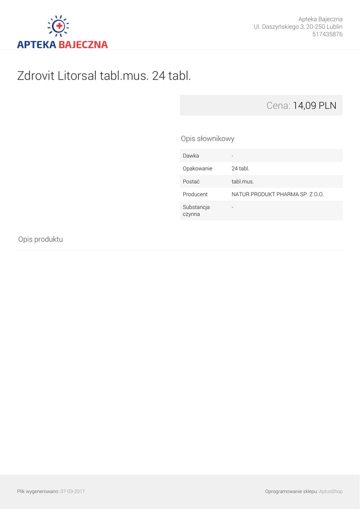 Apteka Bajeczna Ul. Daszyńskiego 3, 20-250 Lublin 517435876 Zdrovit Litorsal tabl.mus. 24 tabl. Cena: 14,09 PLN Opis słownikowy Dawka - Opakowanie 24 tabl. Postać tabl.mus. Producent NATUR PRODUKT PHARMA SP. Z O.O. Substancja czynna - Opis produktu Plik wygenerowano: 07-03-2017 Powered by TCPDF (www.tcpdf.org) Oprogramowanie sklepu: AptusShop