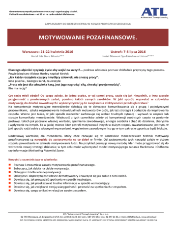Gwarantowany wysoki poziom merytoryczny i organizacyjny szkoleń. Polska firma szkoleniowa – od 16 lat na rynku szkoleń dla biznesu. ZAPRASZAMY DO UCZESTNICTWA W NOWEJ PROPOZYCJI SZKOLENIA: MOTYWOWANIE POZAFINANSOWE. Warszawa: 21-22 kwietnia 2016 Ustroń: 7-8 lipca 2016 Hotel Ibis Stare Miasto*** Hotel Diament Spa&Wellness Ustroń**** Dlaczego alpiniści ryzykują życie aby wejść na szczyt?... podczas szkolenia poznasz dokładnie przyczyny tego procesu. Powieściopisarz Aldous Huxley napisał kiedyś: „Jak każdy rozsądnie czujący i myślący człowiek, nie znoszę pracy”. Inna pisarka , Georges Sand, zauważyła: „Praca nie jest dla człowieka karą, jest jego nagrodą i siłą, chwałą i przyjemnością”. Kto ma rację? Czy rację mieli oboje? Od czego zależy, że jedna osoba, w tej samej pracy, czuje się jak niewolnik, a inna czerpie przyjemność z powierzonych zadań, pomimo takich samych zarobków. W jaki sposób wyzwalać w człowieku motywację do działań zawodowych i wykorzystywać ją do zwiększenia efektywności przedsiębiorstwa? Na kompetencje motywacyjne menedżerów składają się te dotyczące komunikowania się z grupą i pojedynczymi pracownikami, sztuka rozpoznawania indywidualnych motywatorów osób, jak też strategia i podejście do inspirowania zespołu. Ważne jest także, w jaki sposób menedżer zachowuje się wobec trudnych sytuacji i wyzwań w zespole lub stosuje komunikaty menedżerskie. Większość z tych czynników zależy od kompetencji osobistych często na poziomie postawy, takich jak poczucie własnej wartości, spełnienia zawodowego, energia osobista i chęć do działania, charyzma i wpływanie na innych. To w jakiej mierze lider potrafi motywować innych w dużym stopniu uwarunkowane jest tym, w jaki sposób radzi sobie z własnymi wyzwaniami, wypaleniem zawodowym i co go w tym zakresie ogranicza bądź blokuje. Dodatkową wartością dla menedżera, który chce rozwijać się w kontekście menedżerskich technik motywacji pozafinansowej są narzędzia do zastosowania na co dzień w firmie. Od zastosowania tych narzędzi zależy w dużym stopniu powodzenie w zakresie motywowania ludzi. Na przykład poznając nową metodę lider może przygotować się do wdrożenia nowej strategii działania; w tym celu może wykorzystać model motywującego zadania Hackmana i Oldhama czy informacje Motivating Potential Score. Korzyści z uczestnictwa w szkoleniu: Poznasz i zrozumiesz zasady motywowania pozafinansowego. Zobaczysz, jak działa na ciebie motywacja. Odkryjesz źródła własnej motywacji. Odkryjesz i doprecyzujesz własne demotywatory i nauczysz się jak sobie z nimi radzić. Dowiesz się, jak prowadzić spotkania w sposób inspirujący. Dowiesz się, jak przekazywać trudne informacje w sposób wzmacniający. Dowiesz się, jak zwiększyć swoją wiarygodność i pewność na spotkaniach z zespołem. Dowiesz się, czego unikać w relacji ze swoim zespołem. ATL “Achievement Through Learning” Sp. z o.o. 02-793 Warszawa, ul. Belgradzka 14/14; tel.: 22 853 35 23, tel. kom.: 607 573 053, faks: 22 247 21 83, e-mail: [email protected], www.atl.edu.pl NIP: 5213358018, REGON: 140233796 KRS: 0000241906, SĄD REJONOWY DLA M. ST. WARSZAWY, XIII WYDZIAŁ GOSPODARCZY KAPITAŁ ZAKŁADOWY: 80.000 PLN Gwarantowany wysoki poziom merytoryczny i organizacyjny szkoleń. Polska firma szkoleniowa – od 16 lat na rynku szkoleń dla biznesu. PROGRAM SZKOLENIA: 1. KOMUNIKACJA MENEDŻERA Z ZESPOŁEM. • Nieoceniający styl komunikowania się, komunikat Ja. • Bariery w komunikacji. • Podmiotowe a przedmiotowe relacje w zespole. • Jakie czynności motywują mnie najbardziej. • Dlaczego alpiniści ryzykują życie, aby wejść na szczyt? • Wstęp do teorii optymalnego doświadczenia. • 3 główne warunki motywującej czynności M. Cikszentmihalyi. • Wartości w zespole a motywacja. • Wprowadzenie wartości w zespole i partycypacyjna rola menedżera. • Filozofia o naturze ludzkiej X i Y – Mc Gregora. 2. DEMOTYWATORY, UTRUDNIAJĄCE PRZEKONANIA, A OSOBISTA EFEKTYWNOŚĆ PRACOWNIKÓW. • Katastrofizowanie. • Wygórowane warunki asertywności. • Zdania negatywne. • Normy powinności. • Samokaranie. • Źródła przekonań i wartości. • Przekonania życiowe a zadowolenie z pracy. • Wpływ demotywatorów na energię osobistą, decyzje i działania zawodowe osoby. • Praca i podejście do pracownika z ramą utrudniających przekonań. 3. KOMUNIKACJA INSPIRACYJNA I ELEMENTY MENTORINGU. • 9 praw motywacji – zasady motywacji. • Pobudzanie przez cele i partycypacja w ustalaniu celów i systemu udzielania informacji zwrotnej. • Dzielenie się doświadczeniem zawodowym. • Przekazywanie wzmacniającej informacji zwrotnej. • Przekazywanie trudnych komunikatów w sposób wzmacniający. • Rozmowa motywująca. • Inspirowanie grupy – studium przypadku. • Czynniki wzmacniające inspirację w grupie: − przywoływanie wartości grupowych, − system komunikacji, − memy, − wizerunek, − wiarygodność, − wpływanie na ludzi. 4. PRACA Z MEMEM PODCZAS SPOTKAŃ ZESPOŁU. • Zarażanie emocjami – neurony lustrzane. • Tworzenie najlepszych memów dla zespołu. • Wykorzystywanie memów do rozmów z grupą pracowników. 5. SPOTKANIE Z ZAŁOGĄ Z WYKORZYSTANIEM MOTYWATORÓW. • Prowadzenie menedżerskiego spotkania z grupą. • Potrzeby zespołu podczas spotkania. • Prowadzenie spotkań w sposób partycypacyjny i dialogiczny. • Dostrzeganie zdania mniejszości. • Docenianie różnic i synergia w zespole. ATL “Achievement Through Learning” Sp. z o.o. 02-793 Warszawa, ul. Belgradzka 14/14; tel.: 22 853 35 23, tel. kom.: 607 573 053, faks: 22 247 21 83, e-mail: [email protected], www.atl.edu.pl NIP: 5213358018, REGON: 140233796 KRS: 0000241906, SĄD REJONOWY DLA M. ST. WARSZAWY, XIII WYDZIAŁ GOSPODARCZY KAPITAŁ ZAKŁADOWY: 80.000 PLN Gwarantowany wysoki poziom merytoryczny i organizacyjny szkoleń. Po