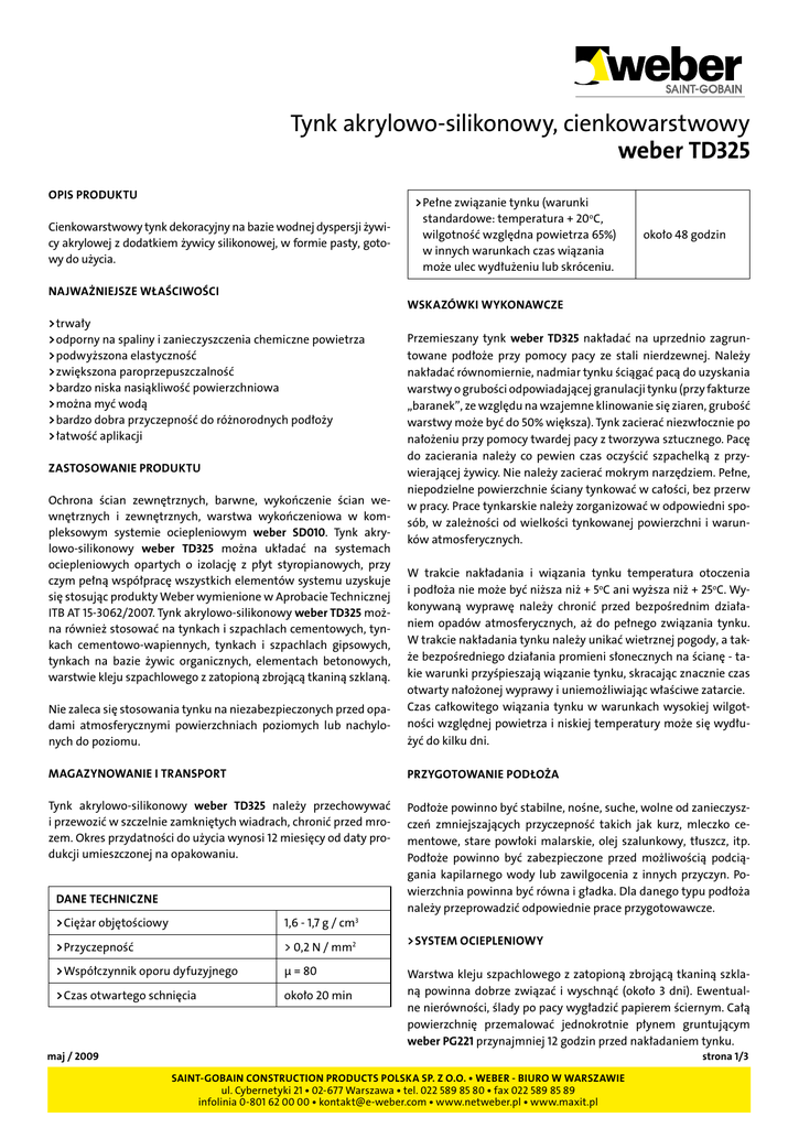 Tynk akrylowo-silikonowy, cienkowarstwowy weber TD325 Opis produktu Cienkowarstwowy tynk dekoracyjny na bazie wodnej dyspersji żywicy akrylowej z dodatkiem żywicy silikonowej, w formie pasty, gotowy do użycia. Najważniejsze właściwości >Pełne > związanie tynku (warunki standardowe: temperatura + 20oC, wilgotność względna powietrza 65%) w innych warunkach czas wiązania może ulec wydłużeniu lub skróceniu. około 48 godzin Wskazówki wykonawcze >trwały > >odporny > na spaliny i zanieczyszczenia chemiczne powietrza >podwyższona > elastyczność >zwiększona > paroprzepuszczalność >bardzo > niska nasiąkliwość powierzchniowa >można > myć wodą >bardzo > dobra przyczepność do różnorodnych podłoży >łatwość > aplikacji Zastosowanie PRODUKTU Ochrona ścian zewnętrznych, barwne, wykończenie ścian wewnętrznych i zewnętrznych, warstwa wykończeniowa w kompleksowym systemie ociepleniowym weber SD010. Tynk akrylowo-silikonowy weber TD325 można układać na systemach ociepleniowych opartych o izolację z płyt styropianowych, przy czym pełną współpracę wszystkich elementów systemu uzyskuje się stosując produkty Weber wymienione w Aprobacie Technicznej ITB AT 15-3062/2007. Tynk akrylowo-silikonowy weber TD325 można również stosować na tynkach i szpachlach cementowych, tynkach cementowo-wapiennych, tynkach i szpachlach gipsowych, tynkach na bazie żywic organicznych, elementach betonowych, warstwie kleju szpachlowego z zatopioną zbrojącą tkaniną szklaną. Przemieszany tynk weber TD325 nakładać na uprzednio zagruntowane podłoże przy pomocy pacy ze stali nierdzewnej. Należy nakładać równomiernie, nadmiar tynku ściągać pacą do uzyskania warstwy o grubości odpowiadającej granulacji tynku (przy fakturze „baranek”, ze względu na wzajemne klinowanie się ziaren, grubość warstwy może być do 50% większa). Tynk zacierać niezwłocznie po nałożeniu przy pomocy twardej pacy z tworzywa sztucznego. Pacę do zacierania należy co pewien czas oczyścić szpachelką z przywierającej żywicy. Nie należy zacierać mokrym narzędziem. Pełne, niepodzielne powierzchnie ściany tynkować w całości, bez przerw w pracy. Prace tynkarskie należy zorganizować w odpowiedni sposób, w zależności od wielkości tynkowanej powierzchni i warunków atmosferycznych. Nie zaleca się stosowania tynku na niezabezpieczonych przed opadami atmosferycznymi powierzchniach poziomych lub nachylonych do poziomu. W trakcie nakładania i wiązania tynku temperatura otoczenia i podłoża nie może być niższa niż + 5oC ani wyższa niż + 25oC. Wykonywaną wyprawę należy chronić przed bezpośrednim działaniem opadów atmosferycznych, aż do pełnego związania tynku. W trakcie nakładania tynku należy unikać wietrznej pogody, a także bezpośredniego działania promieni słonecznych na ścianę - takie warunki przyśpieszają wiązanie tynku, skracając znacznie czas otwarty nałożonej wyprawy i uniemożliwiając właściwe zatarcie. Czas całkowitego wiązania tynku w warunkach wysokiej wilgotności względnej powietrza i niskiej temperatury może się wydłużyć do kilku dni. Magazynowanie i transport Przygotowanie podłoża Tynk akrylowo-silikonowy weber TD325 należy przechowywać i przewozić w szczelnie zamkniętych wiadrach, chronić przed mrozem. Okres przydatności do użycia wynosi 12 miesięcy od daty produkcji umieszczonej na opakowaniu. Podłoże powinno być stabilne, nośne, suche, wolne od zanieczyszczeń zmniejszających przyczepność takich jak kurz, mleczko cementowe, stare powłoki malarskie, olej szalunkowy, tłuszcz, itp. Podłoże powinno być zabezpieczone przed możliwością podciągania kapilarnego wody lub zawilgocenia z innych przyczyn. Powierzchnia powinna być równa i gładka. Dla danego typu podłoża należy przeprowadzić odpowiednie prace przygotowawcze. Dane techniczne >Ciężar > objętościowy 1,6 - 1,7 g / cm3 >Przyczepność > > 0,2 N / mm2 >Współczynnik > oporu dyfuzyjnego μ = 80 >Czas > otwartego schnięcia około 20 min >System > ociepleniowy Warstwa kleju szpachlowego z zatopioną zbrojącą tkaniną szklaną powinna dobrze związać i wyschnąć (około 3 dni). Ewentualne nierówności, ślady po pacy wygładzić papierem ściernym. Całą powierzchnię przemalować jednokrotnie płynem gruntującym weber PG221 przynajmniej 12 godzin przed nakładaniem tynku. maj / 2009 strona 1/3 Saint-Gobain Construction Products Polska Sp. z o.o. • Weber - Biuro w Warszawie ul. Cybernetyki 21 • 02-677 Warszawa • tel. 022 589 85 80 • fax 022 589 85 89 infolinia 0-801 62 00 00 • [email protected] • www.netweber.pl • www.maxit.pl Tynk akrylowo-silikonowy, cienkowarstwowy weber TD325 >Świeże > tynki cementowe i cementowo-wapienne. Świeże tynki powinny całkowicie związać i wyschnąć. Przyjmuje się czas całkowitego wiązania 1 dzień na 1 mm grubości warstwy tynku. Całą powierzchnię przemalować jednokrotnie płynem gruntującym weber PG221 przynajmniej 12 godzin przed nakładaniem tynku. >Inne > podłoża Powierzchnię należy oczyścić z kurzu. Jeżeli na powierzchni tynku pojawiły się wykwity wapienne, należy usunąć je twardą szczotką drucianą lub papierem ściernym. Całą powierzchnię przemalować jednokrotnie płynem gruntującym weber PG221 przynajmniej 12 godzin przed nakładaniem tynku. Stare, łuszczące się powłoki malarskie należy usunąć w sposób mechaniczny lub przy pomocy specjalnych preparatów chemicznych. Powłoki malarskie o dobrej przyczepności do podłoża należy zmatowić papierem ściernym i starannie umyć wodą (najlepiej pod ciśnieniem) z dodatkiem płynu czyszczącego weber PC241. >Stare > tynki cementowe i cementowo-wapienne Podłoża, na których są widoczne ślady korozji biologicznej (mchy, algi, glony, porosty, itp.) należy dokładnie oczyścić stosując płyn do usuwania glonów i alg weber PC243. Należy starannie sprawdzić przyczepność star