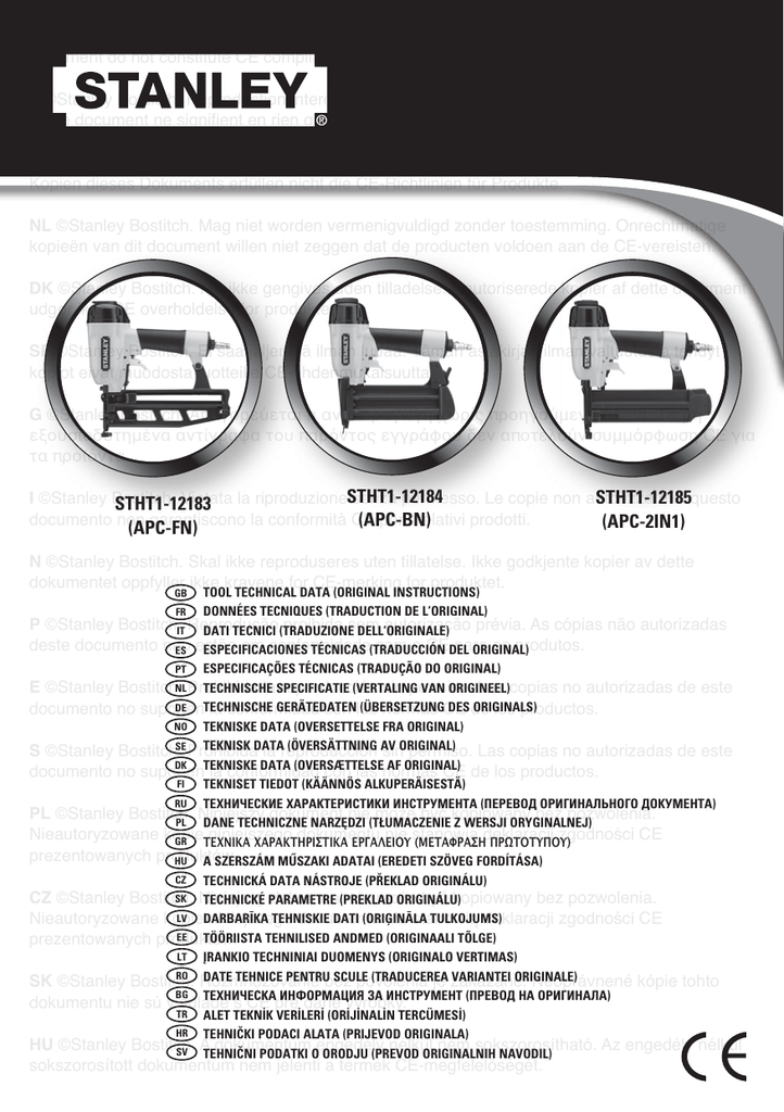GB ©Stanley Bostitch. Not to be reproduced without permission. Unauthorised copies of this document do not constitute CE compliance for the products. F ©Stanley Bostitch. Reproduction interdite sans permission préalable. Les copies non autorisées de ce document ne signifient en rien que les produits soient conformes aux normes CE. D ©Stanley Bostitch. Vervielfältigung nicht ohne Genehmigung gestattet. Unzulässig erstellte Kopien dieses Dokuments erfüllen nicht die CE-Richtlinien für Produkte. NL ©Stanley Bostitch. Mag niet worden vermenigvuldigd zonder toestemming. Onrechtmatige kopieën van dit document willen niet zeggen dat de producten voldoen aan de CE-vereisten. DK ©Stanley Bostitch. Må ikke gengives uden tilladelse. Uautoriserede kopier af dette dokument udgør ikke CE overholdelse for produkterne. SF ©Stanley Bostitch. Ei saa jäljentää ilman lupaa. Tämän asiakirjan ilman valtuutusta tehdyt kopiot eivät muodosta tuotteille CE-yhdenmukaisuutta. G ©Stanley Bostitch. Απαγορεύεται η αναπαραγωγή χωρίς προηγούμενη άδεια. Τα μη εξουσιοδοτημένα αντίγραφα του παρόντος εγγράφου δεν αποτελούν συμμόρφωση CE για τα προϊόντα. STHT1-12185 I ©Stanley Bostitch. Vietata la riproduzioneSTHT1-12184 senza permesso. Le copie non autorizzate di questo STHT1-12183 documento non garantiscono la conformità CE per i relativi prodotti. (APC-BN) (APC-2IN1) (APC-FN) N ©Stanley Bostitch. Skal ikke reproduseres uten tillatelse. Ikke godkjente kopier av dette dokumentet oppfyller ikke kravene for CE-merking for produktet. TOOL TECHNICAL DATA (ORIGINAL INSTRUCTIONS) DONNÉES TECNIQUES (TRADUCTION DE L’ORIGINAL) P ©Stanley Bostitch.IT Reprodução proibida sem autorização prévia. As cópias não autorizadas DATI TECNICI (TRADUZIONE DELL’ORIGINALE) deste documento não em conformidade com a CEDEL para os produtos. ES estão ESPECIFICACIONES TÉCNICAS (TRADUCCIÓN ORIGINAL) PT ESPECIFICAÇÕES TÉCNICAS (TRADUÇÃO DO ORIGINAL) TECHNISCHE (VERTALING VAN ORIGINEEL) E ©Stanley Bostitch.NL Prohibida laSPECIFICATIE reproducción sin permiso. Las copias no autorizadas de este DE TECHNISCHE GERÄTEDATEN (ÜBERSETZUNG DES de ORIGINALS) documento no suponen la conformidad con las normas CE los productos. NO TEKNISKE DATA (OVERSETTELSE FRA ORIGINAL) TEKNISK DATA (ÖVERSÄTTNING AV S ©Stanley Bostitch.SE Prohibida la reproducción sinORIGINAL) permiso. Las copias no autorizadas de este DK TEKNISKE DATA (OVERSÆTTELSE AF ORIGINAL) documento no suponen la conformidad con las normas CE de los productos. FI TEKNISET TIEDOT (KÄÄNNÖS ALKUPERÄISESTÄ) RU ТЕХНИЧЕСКИЕ ХАРАКТЕРИСТИКИ ИНСТРУМЕНТА (ПЕРЕВОД ОРИГИНАЛЬНОГО ДОКУМЕНТА) PL ©Stanley Bostitch. Niniejszy dokument nie może być kopiowany bez pozwolenia. PL DANE TECHNICZNE NARZĘDZI (TŁUMACZENIE Z WERSJI ORYGINALNEJ) Nieautoryzowane kopie niniejszego dokumentu nie stanowią deklaracji zgodności CE GR ΤΕΧΝΙΚΑ ΧΑΡΑΚΤΗΡΙΣΤΙΚΑ ΕΡΓΑΛΕΙΟΥ (ΜΕΤΑΦΡΑΣΗ ΠΡΩΤΟΤΥΠΟΥ) prezentowanych produktów. HU A SZERSZÁM MŰSZAKI ADATAI (EREDETI SZÖVEG FORDÍTÁSA) CZ TECHNICKÁ DATA NÁSTROJE (PŘEKLAD ORIGINÁLU) SK Niniejszy CZ ©Stanley Bostitch. dokument(PREKLAD nie może być kopiowany bez pozwolenia. TECHNICKÉ PARAMETRE ORIGINÁLU) LV DARBARĪKA TEHNISKIE DATI (ORIĢINĀLA TULKOJUMS) Nieautoryzowane kopie niniejszego dokumentu nie stanowią deklaracji zgodności CE EE TÖÖRIISTA TEHNILISED ANDMED (ORIGINAALI TÕLGE) prezentowanych produktów. LT ĮRANKIO TECHNINIAI DUOMENYS (ORIGINALO VERTIMAS) RO DATE TEHNICE PENTRU SCULE (TRADUCEREA VARIANTEI ORIGINALE) SK ©Stanley Bostitch. Rozmnožovanie bez povolenia je zakázané. Neoprávnené kópie tohto BG ТЕХНИЧЕСКА ИНФОРМАЦИЯ ЗА ИНСТРУМЕНТ (ПРЕВОД НА ОРИГИНАЛА) dokumentu nie sú v súlade s CE pre dané výrobky. TR ALET TEKNİK VERİLERİ (ORİJİNALİN TERCÜMESİ) HR TEHNIČKI PODACI ALATA (PRIJEVOD ORIGINALA) HU ©Stanley Bostitch. A dokumentum engedély nélkül nem sokszorosítható. Az engedély nélkül SV TEHNIČNI PODATKI O ORODJU (PREVOD ORIGINALNIH NAVODIL) GB FR sokszorosított dokumentum nem jelenti a termék CE-megfelelőségét. GB ©Stanley Bostitch. Not to be reproduced without permission. Unauthorised copies of this document do not constitute CE compliance for the products. F ©Stanley Bostitch. Reproduction sansD1.5 permission préalable. Les copies non autorisées A 308 B275 interdite C78 E86.9 F 99.2 2 Q G de ce document ne signifient en m/s rien les produits 86.2 H 3.02 que I 7.0 J 5.6 soient conformes K 1.24aux normes CE. L2 *STHT1-12183 (APC-FN) R R 2 S 100 T 135 U N/Aohne Genehmigung gestattet. Unzulässig erstellte D ©Stanley Bostitch. Vervielfältigung nicht Kopien Qdieses Dokuments erfüllen nicht die CE-Richtlinien für Produkte. Q2 M BC602 N BC603 Q1 O O-lube P STHT1-12189 (APC-FN-MULTI) Q1 1.37 x 1.65 Q2 25-64 R 2.65 1 NL ©Stanley Bostitch. Mag niet worden vermenigvuldigd zonder toestemming. Onrechtmatige kopieën van dit document willen niet zeggen dat de producten voldoen aan de CE-vereisten. B. FINISH NAIL *STHT1-12184 (APC-BN) R R Må ikke gengives DK ©Stanley Bostitch. uden tilladelse. Uautoriserede kopier af dette dokument R A 235 B242 C63 D1.1 E82.1 F 94.4 udgør ikke CE overholdelse for produkterne. O O-lube P STHT1-12188 (APC-BN-MULTI) Q1 1 x 1.25 Q2 15-50 2.1 SF ©Stanley Bostitch. Ei saa jäljentää ilman lupaa. Tämän asiakirjan ilman valtuutustaR tehdyt Q Q S 110 T 120 U N/A kopiot eivät muodosta tuotteille CE-yhdenmukaisuutta. G Q2 81.4 Q2 M HQ 2 2.51 m/s2 I 7.0 J 5.6 K 1.03 L2 BC602 N BC603 1 1 G ©Stanley Bostitch. Απαγορεύεται η αναπαραγωγή χωρίς προηγούμενη άδεια. Τα μη A. BRAD B. FINISH NAIL εξουσιοδοτημένα 