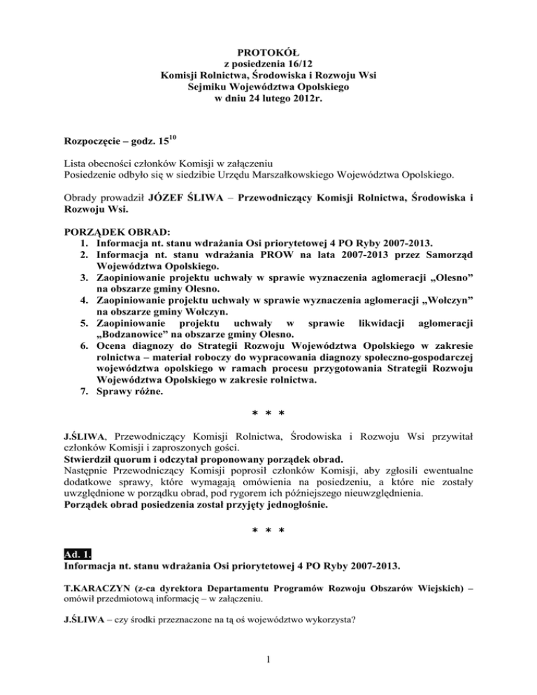 PROTOKÓŁ z posiedzenia 16/12 Komisji Rolnictwa, Środowiska i Rozwoju Wsi Sejmiku Województwa Opolskiego w dniu 24 lutego 2012r. Rozpoczęcie – godz. 1510 Lista obecności członków Komisji w załączeniu Posiedzenie odbyło się w siedzibie Urzędu Marszałkowskiego Województwa Opolskiego. Obrady prowadził JÓZEF ŚLIWA – Przewodniczący Komisji Rolnictwa, Środowiska i Rozwoju Wsi. PORZĄDEK OBRAD: 1. Informacja nt. stanu wdraŜania Osi priorytetowej 4 PO Ryby 2007-2013. 2. Informacja nt. stanu wdraŜania PROW na lata 2007-2013 przez Samorząd Województwa Opolskiego. 3. Zaopiniowanie projektu uchwały w sprawie wyznaczenia aglomeracji „Olesno” na obszarze gminy Olesno. 4. Zaopiniowanie projektu uchwały w sprawie wyznaczenia aglomeracji „Wołczyn” na obszarze gminy Wołczyn. 5. Zaopiniowanie projektu uchwały w sprawie likwidacji aglomeracji „Bodzanowice” na obszarze gminy Olesno. 6. Ocena diagnozy do Strategii Rozwoju Województwa Opolskiego w zakresie rolnictwa – materiał roboczy do wypracowania diagnozy społeczno-gospodarczej województwa opolskiego w ramach procesu przygotowania Strategii Rozwoju Województwa Opolskiego w zakresie rolnictwa. 7. Sprawy róŜne. * * * J.ŚLIWA, Przewodniczący Komisji Rolnictwa, Środowiska i Rozwoju Wsi przywitał członków Komisji i zaproszonych gości. Stwierdził quorum i odczytał proponowany porządek obrad. Następnie Przewodniczący Komisji poprosił członków Komisji, aby zgłosili ewentualne dodatkowe sprawy, które wymagają omówienia na posiedzeniu, a które nie zostały uwzględnione w porządku obrad, pod rygorem ich późniejszego nieuwzględnienia. Porządek obrad posiedzenia został przyjęty jednogłośnie. * * * Ad. 1. Informacja nt. stanu wdraŜania Osi priorytetowej 4 PO Ryby 2007-2013. T.KARACZYN (z-ca dyrektora Departamentu Programów Rozwoju Obszarów Wiejskich) – omówił przedmiotową informację – w załączeniu. J.ŚLIWA – czy środki przeznaczone na tą oś województwo wykorzysta? 1 T.KARACZYN – mamy nadzieję Ŝe tak. Jesteśmy w stałym kontakcie z prezesem Lokalnej Grupy Rybackiej nie będą czekać na lata 2014-2015 i chcą, aby konkursy były juŜ ogłoszone w roku 2012, 2013, po to aby zrealizować te wszystkie środki. J.ŚLIWA – czy do LGR Opolszczyzna w sektorze gospodarczym naleŜą wszyscy producenci i gospodarstwa rybackie czy jeszcze ktoś się zastanawia? T.KARACZYN – na str.10 państwo mają wypisanych wszystkich tych, którzy naleŜą. J.ŚLIWA – czyli ta grupa się jakby skonsolidowała. A.KONOPKA (Członek Zarządu Województwa) – zainteresowanie jest spore chęcią uczestnictwa w tej grupie spoza obszaru, ale niestety regulamin nie przewiduje takiej moŜliwości wstąpienia, korzystania ze środków itd. jako ZWO jesteśmy w kontakcie. Ja osobiście z prezesem ustaliłem regułę takich bieŜących spotkań i rozwiązywania problemów na bieŜąco. Myślę, Ŝe poniewaŜ jest to prawie 10% produkcji karpia w kraju więc chcemy – takie jest załoŜenie – docelowo uczynić karpia jako markę, która będzie się kojarzyć z opolskim. J.ŚLIWA – trzeba docenić, Ŝe ZWO uczestniczy w tych róŜnych imprezach i inicjatywach. G.SAWICKI (członek Komisji) – chciałem zapytać o nabór, który został ogłoszony – jakie było zainteresowanie tym naborem? T.KARACZYN – LGR ogłasza i ma dwóch potencjalnych beneficjentów. Pierwszy to jest sektor publiczny tj. gminy i jednostki, a drugi jest społeczno-gospodarczy czyli przedsiębiorcy. G.SAWICKI – ile wniosków wpłynęło? T.KARACZYN – to jest na str.14 materiału. W tej chwili my w samorządzie mamy 6 wniosków jeŜeli chodzi o operację 4.1.1. a więc wzmocnienie konkurencyjności i utrzymanie funkcjonalności obszarów zaleŜnych od rybactwa – to są gminy i chyba jedna parafia. W ramach 4.1.4. ochrona środowiska i dziedzictwa przyrodniczego były złoŜone 2 wnioski – gmina Pokój i gminna spółka wodna w Pokoju. Natomiast w chwili obecnej zakończył się nabór ale wnioski są jeszcze w LGR. G.SAWICKI – chodzi o przedsiębiorców? T.KARACZYN – chodzi o przedsiębiorców. Tutaj teŜ będzie ocena merytoryczna pod względem zgodności z lokalną strategią rybacką. Dopiero wtedy wnioski trafiają do nas i są oceniane. G.SAWICKI – kto zajmuje się oceną? Czy została powołana jakaś grupa asesorów czy ekspertów? T.KARACZYN – nie, zajmują się tym pracownicy departamentu. J.ŚLIWA – czy są jeszcze pytania? – nie było. ***WNIOSEK*** Komisja przyjęła informację nt. stanu wdraŜania Osi priorytetowej 4 PO Ryby 2007-2013. Ad. 2. Informacja nt. stanu wdraŜania PROW na lata 2007-2013 przez Samorząd Województwa Opolskiego. T.KARACZYN (z-ca dyrektora Departamentu Programów Rozwoju Obszarów Wiejskich) – omówił przedmiotową informację – w załączeniu. 2 Z.ZIÓŁKO (wiceprzewodniczący Komisji) – jeśli chodzi o targowiska stałe – czy tu chodzi o jakieś konkretne miejsca lub miejscowości o określonej wielkości? T.KARACZYN – w miejscowościach do 50tys. mieszkańców. Z.ZIÓŁKO – czy to chodzi o gminę czy po prostu o miejscowość? T.KARACZYN – o miejscowość. Tutaj beneficjentem moŜe być gmina lub związek międzygminny. Jest to trochę inaczej niŜ w „podstawowych usługach” gdzie beneficjentem moŜe być tylko gmina albo jednostka budŜetowa gminy. Natomiast tutaj jest jeszcze związek międzygminny. Z.ZIÓŁKO – czy to ma być miejsce, gdzie moŜna tylko handlować produkcją rolniczą czy moŜe być takŜe chińszczyzna i wszystko? T.KARACZYN – na targowiska stałe otrzymaliśmy limit w wysokości 6,6mln zł. Maksymalna kwota pomocy dla jednego beneficjenta to 1mln zł. JeŜeli chodzi o targowisko to przynajmniej 50% jego powierzchni wybudowanej czy wyremontowanej musi być przeznaczone na tzw. sprzedaŜ bezpośrednią czyli, Ŝeby rolnik mógł sprzedawać płody rolne. Są jeszcze dodatkowe warunki – musi być ogrodzone, utwardz
