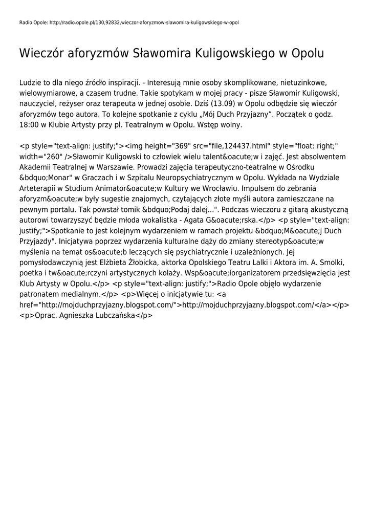 Radio Opole: http://radio.opole.pl/130,92832,wieczor-aforyzmow-slawomira-kuligowskiego-w-opol Wieczór aforyzmów Sławomira Kuligowskiego w Opolu Ludzie to dla niego źródło inspiracji. - Interesują mnie osoby skomplikowane, nietuzinkowe, wielowymiarowe, a czasem trudne. Takie spotykam w mojej pracy - pisze Sławomir Kuligowski, nauczyciel, reżyser oraz terapeuta w jednej osobie. Dziś (13.09) w Opolu odbędzie się wieczór aforyzmów tego autora. To kolejne spotkanie z cyklu „Mój Duch Przyjazny”. Początek o godz. 18:00 w Klubie Artysty przy pl. Teatralnym w Opolu. Wstęp wolny. <p style="text-align: justify;"><img height="369" src="file,124437.html" style="float: right;" width="260" />Sławomir Kuligowski to człowiek wielu talentów i zajęć. Jest absolwentem Akademii Teatralnej w Warszawie. Prowadzi zajęcia terapeutyczno-teatralne w Ośrodku „Monar" w Graczach i w Szpitalu Neuropsychiatrycznym w Opolu. Wykłada na Wydziale Arteterapii w Studium Animatorów Kultury we Wrocławiu. Impulsem do zebrania aforyzmów były sugestie znajomych, czytających złote myśli autora zamieszczane na pewnym portalu. Tak powstał tomik „Podaj dalej...". Podczas wieczoru z gitarą akustyczną autorowi towarzyszyć będzie młoda wokalistka - Agata Górska.</p> <p style="text-align: justify;">Spotkanie to jest kolejnym wydarzeniem w ramach projektu „Mój Duch Przyjazdy". Inicjatywa poprzez wydarzenia kulturalne dąży do zmiany stereotypów myślenia na temat osób leczących się psychiatrycznie i uzależnionych. Jej pomysłodawczynią jest Elżbieta Żłobicka, aktorka Opolskiego Teatru Lalki i Aktora im. A. Smolki, poetka i twórczyni artystycznych kolaży. Współorganizatorem przedsięwzięcia jest Klub Artysty w Opolu.</p> <p style="text-align: justify;">Radio Opole objęło wydarzenie patronatem medialnym.</p> <p>Więcej o inicjatywie tu: <a href="http://mojduchprzyjazny.blogspot.com/">http://mojduchprzyjazny.blogspot.com/</a></p> <p>Oprac. Agnieszka Lubczańska</p>