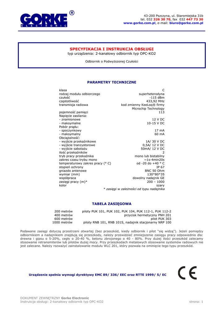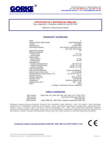 43-200 Pszczyna, ul. Staromiejska 31b tel. 032 326 30 70, fax 032 447 73 30 www.gorke.com.pl, e-mail: [email protected] SPECYFIKACJA I INSTRUKCJA OBSŁUGI typ urządzenia: 2-kanałowy odbiornik typ OPC-KO2 Odbiornik o Podwyższonej Czułości PARAMETRY TECHNICZNE klasa rodzaj modułu odbiorczego czułość częstotliwość transmisja radiowa C superheterodyna -115 dBm 433,92 MHz kod zmienny KeeLoq® firmy Microchip Technology 113 pojemność pamięci Napięcie zasilania: - znamionowe 12 V DC - maksymalne 10-15 V DC Pobór prądu: - spoczynkowy 17 mA - maksymalny 60 mA Obciążalność: - wyjście przekaźnikowe 1A/ 30 V DC - wyjście tranzystorowe 0,5A/ 12 V DC - wyjście sabotażu 50mA/ 12 V DC ilość przekaźników 2 tryb pracy przekaźnika mono lub bistabilny zakres czasu trybu mono ~1s-4min20s temperaturowy zakres pracy (° C) od -20 do +40 ° C stopień ochrony IP 67 gniazdo antenowe BNC 50 Ohm wymiar (mm) 130*80*35 współpraca dowolny nadajnik GE zasięgi pracy (m)* 200 – 1000 kolor szary * zasięgi w zależności od typu nadajnika TABELA ZASIĘGOWA 200 metrów 400 metrów 600 metrów 1000 metrów piloty PUK 101, PUK 102, PUK 104, PUK 112-1, PUK 112-2 przycisk hermetyczny PNH 201 pilot PUK 303 piloty RNB 101, RNB 101S, nadajnik stacjonarny NRP 100 Podawane zasięgi dotyczą przestrzeni otwartej (bez przeszkód, kiedy odbiornik i pilot “się widzą”). Jeżeli pomiędzy odbiornikiem a nadajnikiem znajdują się przeszkody, należy przewidzieć zmniejszenie zasięgu pracy odpowiednio dla: drewna i gipsu o 5-20%, cegły o 20-40 %, betonu zbrojonego o 40 - 80%. Przy dużej ilości przeszkód zalecamy stosowanie retransmiterów lub pilotów dużej mocy. Przy przeszkodach metalowych stosowanie systemów radiowych nie jest zalecane. Należy rozważyć zainstalowanie modułu WLC 201, który pozwala na ominięcie tego typu przeszkód. Urządzenie spełnia wymogi dyrektywy EMC 89/ 336/ EEC oraz RTTE 1999/ 5/ EC DOKUMENT ZEWNĘTRZNY Gorke Electronic Instrukcja obsługi: 2-kanałowy odbiornik typ OPC-KO2 strona: 1 PRZEZNACZENIE ELEMENTÓW • • • • • • gniazdo antenowe BNC - służy do podłączenia anteny 434 MHz/ 50 Ohm przycisk NAUKA - uruchamia procedury programowania dioda kontrola KANAŁU 1 (czerwona K1) - sygnalizuje stan załączenia przekaźnika 1 dioda kontrola KANAŁU 2 (NAUKA, czerwona K2) - sygnalizuje stan załączenia przekaźnika 2. W trybie nauki dioda K2 sygnalizuje czynności programowania ANTYSABOTAŻ - umożliwia podłączenie urządzenia do linii antysabotażowej Wyjście S - stosowane jest do podłączenia sygnalizatora akustycznego, który krótkimi sygnałami informuje o tym czy przekaźnik jest załączany czy wyłączany np. przy otwieraniu ścieżki dostępu do szyfratora czy uzbrajaniu prostego obwodu alarmowego. Przy załączeniu przekaźnika na wyjściu S pojawia się jeden krótki sygnał, a przy wyłączeniu dwa. Wyjście to można obciążyć max 0,5A/ 12 V DC, co w zupełności wystarcza nawet przy stosowaniu syren o wysokim poziomie głośności. Zacisk dodatni sygnalizatora należy podłączyć do +12 V, a zacisk ujemny sygnalizatora do wyjścia S na listwie zaciskowej. Warunki instalacji odbiornika. Dobre. Po pierwsze hermetyczna obudowa pozwala instalować odbiornik w trudnych warunkach takich jak wilgoć, niskie temperatury. Może pracować na zewnątrz. Po drugie superheterodynowy moduł odbiorczy wykazuje się dużą odpornością na zakłócenia elektromagnetyczne. W praktyce oznacza to większe zasięgi pracy i zminimalizowanie wpływu zakłóceń na pracę odbiornika. Kod transmisji. Oparta na kodzie zmiennym (KeeLoq ® firmy Microchip Technology Inc. USA) transmisja radiowa zapewnia wysokie bezpieczeństwo użytkowania. Każda transmisja jest inna od poprzedniej. Warunkiem podstawowym zadziałania odbiornika jest wpisanie pilota do jego pamięci. Pilot może być zaprogramowany do nieograniczonej ilości odbiorników. „Zgubienie” 15 kolejnych transmisji (użycie pilota poza zasięgiem odbiornika) wymaga dwukrotnego przesłania sygnału (2x nacisnąć klawisz pilota). Zastosowanie. Odbiornik stosowany jest we wszelkiego typu zdalnym sterowaniu np. pracą takich urządzeń jak: bramy i szlabany, zamki elektromagnetyczne, oświetlenie itd. W systemach alarmowych stosowany jest: • jako przycisk antynapadowy • do zdalnego sterowania pracy innych urządzeń systemu np. czujki • do rozbrajania/ uzbrajania systemu, stref itd. Częstotliwość. Odbiornik pracuje w oparciu o częstotliwość 433,92 MHz. Pasmo to w większości państw UE (i tu w Polsce) nie wymaga specjalnych zezwoleń i koncesji na użytkowanie. DOKUMENT ZEWNĘTRZNY Gorke Electronic Instrukcja obsługi: 2-kanałowy odbiornik typ OPC-KO2 strona: 2 INSTRUKCJA OBSŁUGI UWAGA ! Wejście do trybu programowania jest możliwe TYLKO przy wyłączonym przekaźniku. Aby wyłączyć przekaźnik należy nacisnąć klawisz pilota lub chwilowo odłączyć napięcie zasilania odbiornika. Zalecamy również przełożenie zwory w pozycję serwis. 1. REJESTRACJA PILOTA DWUKLAWISZOWEGO a) naciśnij przycisk NAUKA na więcej niż 0,5s lecz mniej niż 4s - dioda K2 zaświeci się b) naciśnij ten klawisz pilota który ma sterować kanałem 1 - dioda K2 zgaśnie c) naciśnij ponownie klawisz pilota który ma sterować kanałem 2 - dioda K2 zaświeci się na 3s, po czym będzie pulsować i zgaśnie. Koniec rejestracji nowego pilota Gdy próba wpisania nowego pilota przebiegnie niepomyślnie dioda K2 mignie 1 raz i zgaśnie. Należy rozpocząć rejestrację od początku. Jeżeli pamięć odbiornika jest pełna (wpisano 113 pilotów) to wpisanie kolejnego, nowego pilota powoduje wykasowanie pilota wpisanego jako pierwszy. W przypadku większej jak 113 liczby użytkowników należy rozważyć zastosowanie konfiguracji modułu odbiorczego WLC 201 z odpowiednią ilością odbiorników RSU-KO2/LC (dwóch dla 226 użytkowników, trzech dla 339 itd.) 2. REJESTRACJA PILOTA JEDNOKLAWISZOWEGO W KA