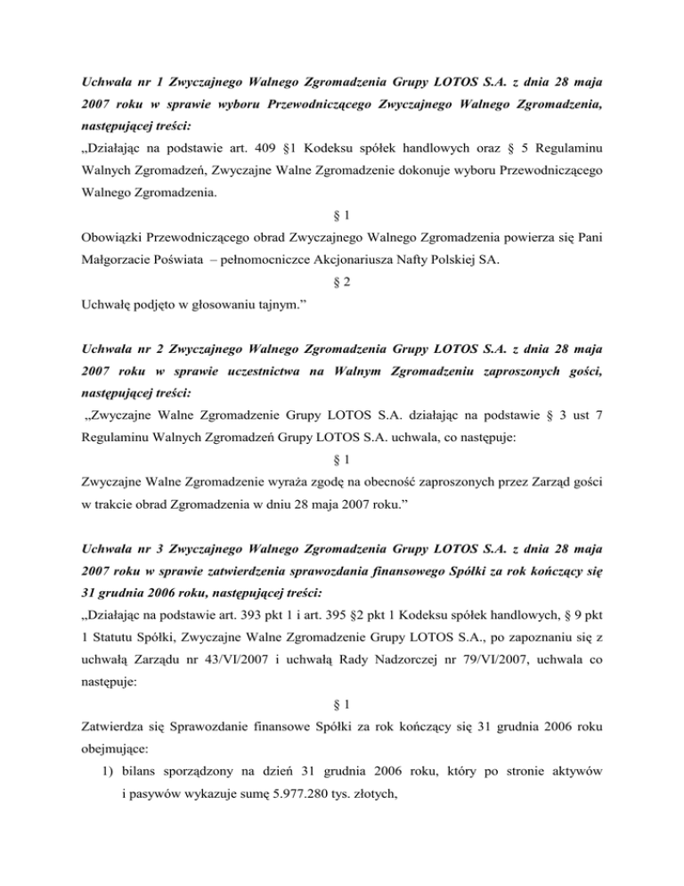 Uchwała nr 1 Zwyczajnego Walnego Zgromadzenia Grupy LOTOS S.A. z dnia 28 maja 2007 roku w sprawie wyboru Przewodniczącego Zwyczajnego Walnego Zgromadzenia, następującej treści: „Działając na podstawie art. 409 §1 Kodeksu spółek handlowych oraz § 5 Regulaminu Walnych Zgromadzeń, Zwyczajne Walne Zgromadzenie dokonuje wyboru Przewodniczącego Walnego Zgromadzenia. §1 Obowiązki Przewodniczącego obrad Zwyczajnego Walnego Zgromadzenia powierza się Pani Małgorzacie Poświata – pełnomocniczce Akcjonariusza Nafty Polskiej SA. §2 Uchwałę podjęto w głosowaniu tajnym.” Uchwała nr 2 Zwyczajnego Walnego Zgromadzenia Grupy LOTOS S.A. z dnia 28 maja 2007 roku w sprawie uczestnictwa na Walnym Zgromadzeniu zaproszonych gości, następującej treści: „Zwyczajne Walne Zgromadzenie Grupy LOTOS S.A. działając na podstawie § 3 ust 7 Regulaminu Walnych Zgromadzeń Grupy LOTOS S.A. uchwala, co następuje: §1 Zwyczajne Walne Zgromadzenie wyraża zgodę na obecność zaproszonych przez Zarząd gości w trakcie obrad Zgromadzenia w dniu 28 maja 2007 roku.” Uchwała nr 3 Zwyczajnego Walnego Zgromadzenia Grupy LOTOS S.A. z dnia 28 maja 2007 roku w sprawie zatwierdzenia sprawozdania finansowego Spółki za rok kończący się 31 grudnia 2006 roku, następującej treści: „Działając na podstawie art. 393 pkt 1 i art. 395 §2 pkt 1 Kodeksu spółek handlowych, § 9 pkt 1 Statutu Spółki, Zwyczajne Walne Zgromadzenie Grupy LOTOS S.A., po zapoznaniu się z uchwałą Zarządu nr 43/VI/2007 i uchwałą Rady Nadzorczej nr 79/VI/2007, uchwala co następuje: §1 Zatwierdza się Sprawozdanie finansowe Spółki za rok kończący się 31 grudnia 2006 roku obejmujące: 1) bilans sporządzony na dzień 31 grudnia 2006 roku, który po stronie aktywów i pasywów wykazuje sumę 5.977.280 tys. złotych, 2 2) rachunek zysków i strat za okres od dnia 1 stycznia 2006 roku do dnia 31 grudnia 2006 roku, wykazujący zysk netto w wysokości 406.714 tys. złotych, 3) zestawienie zmian w kapitale własnym za okres od dnia 1 stycznia 2006 roku do dnia 31 grudnia 2006 roku, wykazujące zwiększenie stanu kapitału własnego o kwotę 406.714 tys. złotych, 4) rachunek przepływów pieniężnych za okres od dnia 1 stycznia 2006 roku do dnia 31 grudnia 2006 roku, wykazujący zmniejszenie stanu środków pieniężnych netto o kwotę 417.965 tys. złotych oraz 5) dodatkowe informacje i objaśnienia.” Uchwała nr 4 Zwyczajnego Walnego Zgromadzenia Grupy LOTOS S.A. z dnia 28 maja 2007 roku w sprawie zatwierdzenia sprawozdania Zarządu z działalności Spółki za rok kończący się 31 grudnia 2006 roku, następującej treści: „Działając na podstawie art. 393 pkt 1 i art. 395 §2 pkt 1 Kodeksu spółek handlowych, § 9 pkt 1 Statutu Spółki, Zwyczajne Walne Zgromadzenie Grupy LOTOS S.A., po zapoznaniu się z uchwałą Zarządu nr 44/VI/2007 i uchwałą Rady Nadzorczej nr 80/VI/2007, uchwala co następuje: §1 Zatwierdza się Sprawozdanie Zarządu z działalności Spółki za rok kończący się 31 grudnia 2006 r.” W tym miejscu Akcjonariusz Bogdan Kamola zgłosił sprzeciw, którego pisemne uzasadnienie zostało załączone do protokołu. Uchwała nr 5 Zwyczajnego Walnego Zgromadzenia Grupy LOTOS S.A. z dnia 28 maja 2007 roku w sprawie zatwierdzenia skonsolidowanego sprawozdania finansowego grupy kapitałowej Grupy LOTOS S.A. za rok kończący się 31 grudnia 2006 roku, następującej treści: „Działając na podstawie art. 395 §5 Kodeksu spółek handlowych, § 9 pkt 1 Statutu Spółki, Zwyczajne Walne Zgromadzenie Grupy LOTOS S.A., po zapoznaniu się z uchwałą Zarządu nr 45/VI/2007 i uchwałą Rady Nadzorczej nr 81/VI/2007, uchwala co następuje: §1 3 Zatwierdza się skonsolidowane sprawozdanie finansowe Grupy Kapitałowej Grupy LOTOS S.A. za rok kończący się 31 grudnia 2006 r. obejmujące: 1) skonsolidowany bilans sporządzony na dzień 31 grudnia 2006 roku, który po stronie aktywów i pasywów wykazuje sumę 7.926.475 tys. złotych, 2) skonsolidowany rachunek zysków i strat za okres od dnia 1 stycznia 2006 roku do dnia 31 grudnia 2006 roku, wykazujący zysk netto w wysokości 734.652 tys. złotych, 3) skonsolidowane zestawienie zmian w kapitale własnym za okres od dnia 1 stycznia 2006 roku do dnia 31 grudnia 2006 roku wykazujące zwiększenie stanu kapitału własnego o kwotę 726.225 tys. złotych, 4) skonsolidowany rachunek przepływów pieniężnych za okres od dnia 1 stycznia 2006 roku do dnia 31 grudnia 2006 roku, wykazujący zmniejszenie stanu środków pieniężnych netto o kwotę 143.629 tys. złotych oraz 5) dodatkowe informacje i objaśnienia.” Uchwała nr 6 Zwyczajnego Walnego Zgromadzenia Grupy LOTOS S.A. z dnia 28 maja 2007 roku w sprawie zatwierdzenia sprawozdania z działalności grupy kapitałowej Grupy LOTOS S.A. za rok kończący się 31 grudnia 2006 roku, następującej treści: „Działając na podstawie art. 395 §5 Kodeksu spółek handlowych, § 9 pkt 1 Statutu Spółki, Zwyczajne Walne Zgromadzenie Grupy LOTOS S.A., po zapoznaniu się z uchwałą Zarządu nr 46/VI/2007 i uchwałą Rady Nadzorczej nr 82/VI/2007, uchwala co następuje: §1 Zatwierdza się Sprawozdanie z działalności Grupy Kapitałowej Grupy LOTOS S.A. za rok kończący się 31 grudnia 2006 r.” Uchwała nr 8 Zwyczajnego Walnego Zgromadzenia Grupy LOTOS S.A. z dnia 28 maja 2007 roku w sprawie podziału zysku netto Spółki za rok kończący się 31 grudnia 2006 r., następującej treści: „Działając na podstawie art. 395 § 2 pkt 2 Kodeksu spółek handlowych oraz §9 pkt 3 Statutu Spółki, Zwyczajne Walne Zgromadzenie, po zapoznaniu się z uchwała Zarządu nr 61/VI/2007 oraz uchwałą Rady Nadzorczej nr 83/VI/2007, uchwala następujący podział zysku netto za rok kończący się 31 grudnia 2006 r.: 4 §1 Zysk netto Spółki za rok kończący się 31 grudnia 2006 r. w kwocie 406.713.884,93 PLN (słownie: czterysta sześć milionów siedemset trzynaście tysięcy osiemset osiemdzies