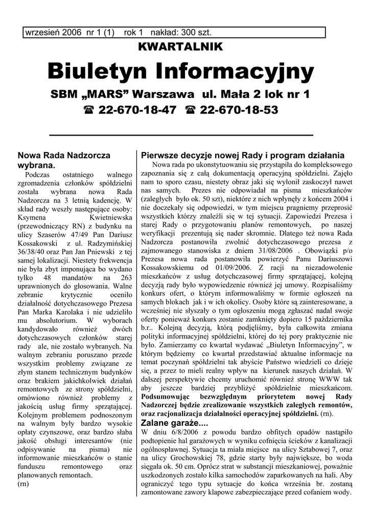 wrzesień 2006 nr 1 (1) rok 1 nakład: 300 szt. www.sbm-mars.waw.pl KWARTALNIK Biuletyn Informacyjny SBM „MARS” Warszawa ul. Mała 2 lok nr 1 22-670-18-47 22-670-18-53 e-mail: [email protected] Nowa Rada Nadzorcza wybrana. Podczas ostatniego walnego zgromadzenia członków spółdzielni została wybrana nowa Rada Nadzorcza na 3 letnią kadencję. W skład rady weszły następujące osoby: Ksymena Kwietniewska (przewodniczący RN) z budynku na ulicy Szaserów 47/49 Pan Dariusz Kossakowski z ul. Radzymińskiej 36/38/40 oraz Pan Jan Pniewski z tej samej lokalizacji. Niestety frekwencja nie była zbyt imponująca bo wydano tylko 48 mandatów na 263 uprawnionych do głosowania. Walne zebranie krytycznie oceniło działalność dotychczasowego Prezesa Pan Marka Karolaka i nie udzieliło mu absolutorium. W wyborach kandydowało również dwóch dotychczasowych członków starej rady ale, nie zostało wybranych. Na walnym zebraniu poruszano przede wszystkim problemy związane ze złym stanem technicznym budynków oraz brakiem jakichkolwiek działań remontowych ze strony spółdzielni, omówiono również problemy z jakością usług firmy sprzątającej. Kolejnym problemem podnoszonym na walnym były bardzo wysokie opłaty czynszowe, oraz bardzo słaba jakość obsługi interesantów (nie odpisywanie na pisma) nie informowanie mieszkańców o stanie funduszu remontowego oraz planowanych remontach. (rn) Pierwsze decyzje nowej Rady i program działania Nowa rada po ukonstytuowaniu się przystąpiła do kompleksowego zapoznania się z całą dokumentacją operacyjną spółdzielni. Zajęło nam to sporo czasu, niestety obraz jaki się wyłonił zaskoczył nawet nas samych. Prezes nie odpowiadał na pisma mieszkańców (zaległych było ok. 50 szt), niektóre z nich wpłynęły z końcem 2004 i nie doczekały się odpowiedzi, w tym miejscu pragniemy przeprosić wszystkich którzy znaleźli się w tej sytuacji. Zapowiedzi Prezesa i starej Rady o przygotowaniu planów remontowych, po naszej weryfikacji prezentują się nader skromnie. Dlatego też nowa Rada Nadzorcza postanowiła zwolnić dotychczasowego prezesa z zajmowanego stanowiska z dniem 31/08/2006 . Obowiązki p/o Prezesa nowa rada postanowiła powierzyć Panu Dariuszowi Kossakowskiemu od 01/09/2006. Z racji na niezadowolenie mieszkańców z usług dotychczasowej firmy sprzątającej, kolejną decyzją rady było wypowiedzenie również jej umowy. Rozpisaliśmy konkurs ofert, o którym informowaliśmy w formie ogłoszeń na samych blokach jak i w ich okolicy. Osoby które są zainteresowane, a wcześniej nie słyszały o tym ogłoszeniu mogą zgłaszać nadal swoje oferty ponieważ konkurs zostanie zamknięty dopiero 15 października b.r.. Kolejną decyzją, którą podjęliśmy, była całkowita zmiana polityki informacyjnej spółdzielni, której do tej pory praktycznie nie było. Zamierzamy co kwartał wydawać „Biuletyn Informacyjny”, w którym będziemy co kwartał przedstawiać aktualne informacje na temat poczynań spółdzielni tak abyście Państwo wiedzieli co dzieje się, a przez to mieli realny wpływ na kierunek naszych działań. W dalszej perspektywie chcemy uruchomić również stronę WWW tak aby jeszcze bardziej przybliżyć spółdzielnie mieszkańcom. Podsumowując bezwzględnym priorytetem nowej Rady Nadzorczej będzie zrealizowanie wszystkich zaległych remontów, oraz racjonalizacja działalności operacyjnej spółdzielni. (rn). Zalane garaże.... W dniu 6/8/2006 z powodu bardzo obfitych opadów nastąpiło podtopienie hal garażowych w wyniku cofnięcia ścieków z kanalizacji ogólnospławnej. Sytuacja ta miała miejsce na ulicy Sztabowej 7, oraz na ulicy Grochowskiej 78, gdzie starty były największe, bo woda sięgała ok. 50 cm. Oprócz strat w substancji mieszkaniowej, poważnie uszkodzonych zostało kilka samochodów zaparkowanych na hali. Aby ograniczyć tego typu sytuacje do końca września br. zostaną zamontowane zawory klapowe zabezpieczające przed cofaniem wody. Ważne tematy: wodomierze i podzielniki ciepła Wszystkich spółdzielców czeka do końca bieżącego roku wymiana wodomierzy, ponieważ dla większości z nich skończył się okres legalizacji. Ponadto duża część z nich była wadliwie dobrana, miały zbyt duży przepływ w stosunku do potrzeb bo 2,5 m3/h co powodowało, że cechowała je duża bezwładność, a tym samym mała dokładność pomiaru. Prawidłowymi dla tego typ instalacji są wodomierze o przepływie rzędu 1 1,5 m3/h i takie zamierzamy zakupić Najlepszą ofertę przedstawił producent dotychczasowych wodomierzy czyli firma METRON. Nowe wodomierze będą z detektorem oraz wkładką antymagnetyczną, która powoduje, że wodomierz jest odporny na działanie magnesów neodymowych, a także sygnalizuje próbę ich użycia. Rada Nadzorcza podjęła decyzję, że ta wymiana zostanie zrealizowana ze środków funduszu remontowego ze względu na wysoki poziom obecnych opłat czynszowych. Natomiast od 1 stycznia 2007 do obecnych stawek czynszowych zostanie doliczona stała opłata 1 zł na m-c od wodomierza na poczet przyszłych wymian, które ze względów prawnych będą wykonywane co około 5 lat.Z podzielnikami ciepła umieszczonymi na grzejnikach jest ten sam problem to znaczy ich okres legalizacji upłynie w zależności od budynków za 3-4 lata. Dlatego aby uniknąć jednostkowo dużej opłaty w przypadku ich wymiany od 1 stycznia 2007 do stawek za ogrzewanie zostanie doliczone 1 zł na m-c od podzielnika. Spółdzielnia postanowiła ponownie nawiązać współpracę z firmą montującą podzielniki dawna Vittera obecnie ISTA w celu ich przeglądu technicznego przed sezonem grzewczym, ponieważ było kilka reklamacji na ich działanie, z którymi poprzednie władze spółdzielni nic nie robiły, a my chcemy uniknąć tego typu sytuacji sytuacji. Przeglądy stanu technicznego budynków Na części z nich już na etapie ich powstawiania doszło do wielu zaniedbań . Ze