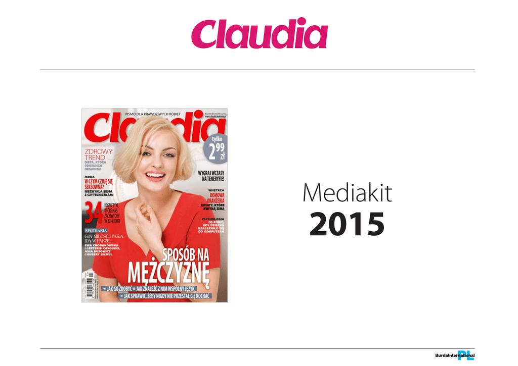 Mediakit 2015 Słowo wstępu CLAUDIA to najbardziej elegancki i najchętniej czytany miesięcznik poradnikowy w Polsce. Jedna z najmocniejszych i najbardziej znanych marek wśród prasy kobiecej. CLAUDIA nie tylko dostarcza czytelniczkom profesjonalnych porad z zakresu urody, mody, psychologii, prawa, kuchni, urządzania wnętrz, ale jest też inspirującą i mądrą lekturą. CLAUDIA wyróżnia się eleganckim layoutem, pięknymi zdjęciami i obecnością wielu polskich gwiazd. CLAUDIA słynie z akcji adresowanych do czytelniczek, które wzmacniają więź emocjonalną z pismem, jak m.in. metamorfozy. Rozumiemy potrzeby kobiet i wychodzimy im naprzeciw. Justyna Szawdyn redaktor naczelna wstęp Informacje o tytule CLAUDIA to najchętniej czytany miesięcznik poradniczy w Polsce. CLAUDIA jest pismem dla prawdziwych kobiet. Takich jak my same. Kobiet, które chcą być szczęśliwe, świetnie wyglądać, być na czasie, dobrze się ubierać, spełniać się w pracy i w domu. Kobiet nowoczesnych, ciekawych świata, pragnących się rozwijać i żyć jak można najlepiej. Czym jest CLAUDIA: •C LAUDIA jest mądrym przewodnikiem. Informuje, podpowiada, wspiera. • CLAUDIA inspiruje do lepszego życia. • CLAUDIA pozwala cieszyć się swoją kobiecością. • CLAUDIA jest zawsze najbliżej czytelniczek. o tytule Zawartość magazynu styl życia 24% moda i uroda 30% kultura i rozrywka 5% ludzie 19% psychologia 10% zdrowie, dziecko 12% o tytule Sprzedaż: 224 273 egz. Czytelnictwo: 2 529 000 Profil czytelnika: 91% kobiet Średni wiek: 41 lat Średnie i wyższe wykształcenie: 75,5% Przychód gospodarstwa domowego powyżej 3 000 zł: 61,5% Miejsce zamieszkania – miasta powyżej 100 000 mieszk.: 29,6% Źródło: P BC; 10/2013 – 09/2014; SCPW; wszyscy; n= 40 542; realizacja Millward Brown; opracowanie Burda ZKDP; 10/2013 – 09/2014 o tytule Online facebook kobieta.pl Fan page Claudii 11 835 fanów 2 451 267 odsłon 616 326 unikalnych użytkowników (stan na dzień 07.01.2015) online (w grudniu 2014) Formaty i cennik rozkładówka cała strona 2 x (5+210+5) (5+210+5) x (5+280+5) mm x (5+280+5) mm Junior page (5+130+5) x (5+195+5) mm 1/2 strony pion 1/2 strony poziom 1/3 strony pion 1/3 strony poziom (5+100+5) (5+210+5) (5+67+5) x (5+280+5) mm (5+210+5) x (5+280+5) mm 1/3 strony pion (5+52+5) x (5+280+5) mm x (5+140+5) mm 1/4 strony poziom 1/4 strony* (5+210+5) 98,5 x x (5+70+5) mm x (5+93+5) mm 140 mm wyspa 78,5 x 130 mm rozkładówka otwierająca rozkładówka II okładka III okładka IV okładka prawa strona lewa strona junior page 1/2 strony prawej 1/2 strony lewej 1/3 strony prawej 1/3 strony lewej 1/4 strony prawej 1/4 strony lewej wyspa 259 900 zł 147 900 zł 141 900 zł 153 900 zł 135 900 zł 123 900 zł 112 900 zł 74 900 zł 68 900 zł 54 900 zł 52 900 zł 51 900 zł 47 900 zł 112 900 zł Dopłaty Reklama w pierwszej 1/2 pisma Reklama w pierwszej 1/3 pisma Reklama przy wybranym materiale * reklama bez spadów 298 900 zł Drugi reklamodawca 15% 30% 15% 10% Inne niestandardowe reklamy na podstawie odrębnych kalkulacji. Do cen należy dodać podatek VAT w obowiązującej stawce. formaty i cennik Harmonogram wydawniczy harmonogram Numer wydania Termin dostarczenia materiałów Pierwszy dzień sprzedaży 2/2015 29.12.2014 19.01.2015 3/2015 27.01.2015 19.02.2015 4/2015 24.02.2015 19.03.2015 5/2015 30.03.2015 21.04.2015 6/2015 27.04.2015 21.05.2015 7/2015 29.05.2015 22.06.2015 8/2015 29.06.2015 20.07.2015 9/2015 28.07.2015 20.08.2015 10/2015 31.08.2015 21.09.2015 11/2015 29.09.2015 22.10.2015 12/2015 28.10.2015 20.11.2015 1/2016 25.11.2015 18.12.2015 Dane techniczne i zasady przyjmowania reklam Format netto 210x280 mm Pliki PDF (format preferowany) Photoshop: TIFF, EPS, 300 dpi, CMYK Illustrator: EPS, CMYK, teksty zamienione na krzywe Total Ink Limit (TIL): maks. 320% Spady min. 5 mm; minimalna odległość istotnych elementów od linii cięcia: 5 mm Rozkładówka powinna posiadać 6mm zdublowania (rozsunięcia) obrazu Nośniki CD Pliki do 10 MB e-mail: [email protected] ftp://ftp.burdamedia.pl/ login: reklama hasło: burdamedia Druk offset Szczegółową specyfikację techniczną przesyłamy na życzenie klienta. W razie pytań technicznych prosimy o kontakt: Jerzy Bojanowski, tel. +48 22 36 03 865, e-mail: [email protected] dane techniczne Szczegółowe warunki sprzedaży powierzchni reklamowej, w tym procedury zamawiania, publikacji oraz emisji ogłoszeń i/lub reklam w czasopismach wydawanych przez Burda Media Polska Sp. z o.o. oraz Spółki z grupy Burda Polska, tj. Burda Communications Sp. z o.o., Burda Publishing Polska Sp. z o.o. Sp. Komandytowa, Burda GL Polska Sp. z o.o. oraz Burda NG Polska Sp. z o.o. Sp. Komandytowa, określone są w Regulaminie Zamieszczania Reklam i Ogłoszeń, dostępnym pod adresem www.burdamedia.pl Dlaczego prasa 1 2 Prasa angażuje – czytanie odbywa się w skupieniu; trudno przy lekturze prasy oddawać się jednocześnie innym czynnościom. Prasa buduje wiarygodność – poprzez „towarzyszenie” czytelnikom i „rozmawianie” z nimi (poprzez e-maile, listy, ankiety, komentarze, polemiki) prasa ma opinię doradcy, który umożliwia dokonywanie wyboru. Zaufanie, jakim darzą czytelnicy swoje tytuły i ich wiarygodność wzmacniają przekaz reklamowy. 3 Prasa pogłębia przekaz – poprzez umieszczanie w reklamie pogłębionego komunikatu odbiorca może dowiedzieć się więcej o produkcie. Reklamy prasowe mogą świadomie prezentować inne treści i formy wyrazu niż reklama w innych mediach. W ten sposób reklama prasowa może wzmacniać i modyfikować wizerunek produktu. 4 Prasa dociera precyzyjnie – bogactwo tematyczne prasy oraz szeroko zakrojone badania czytelnictwa i badania konsumenckie pozwalają na precyzyjne opisanie czytelnika i tym samym dobre dopasowanie medium do reklamowanych produktów. benefity 5 Prasa to medium kreatywne – oferta dla reklamodawców jest bardzo szeroka. Poza ogromną liczbą formatów na stronach pisma istn