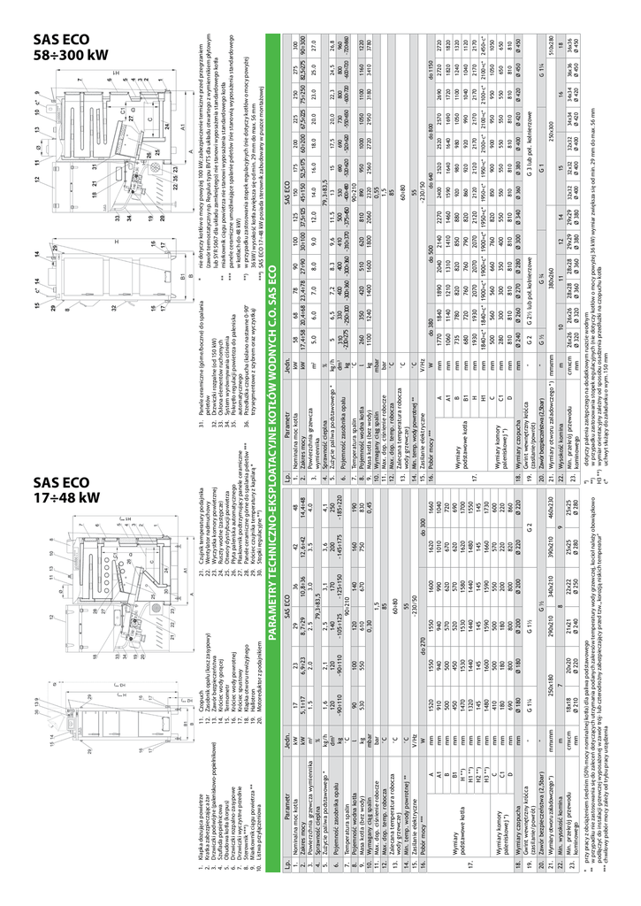 Nominalna moc kotła Zakres mocy Powierzchnia grzewcza wymiennika Sprawność cieplna Zużycie paliwa podstawowego * Pojemność zasobnika opału Temperatura spalin Pojemność wodna kotła Masa kotła (bez wody) Wymagany ciąg spalin Max. dop. ciśnienie robocze Max. dop. temp. robocza Zalecana temperatura robocza wody grzewczej Min. temp. wody powrotnej ** Zasilanie elektryczne Pobór mocy *** A A1 B B1 Wymiary podstawowe kotła H **) H1 **) H2 **) H3 **) C Wymiary komory C1 paleniskowej *) D Wymiary czopucha Gwint wewnętrzny króćca (zasilanie/powrót) Zawór bezpieczeństwa (2,5bar) 1. 2. 3. 4. 5. 6. 7. 8. 9. 10. 11. 12. m cmxcm mm 22. Min. wysokość komina Min. przekrój przewodu 23. kominowego 18x18 Ø 210 G 1¼ 1520 910 500 450 1470 1320 145 1480 410 180 690 Ø 180 7 250x180 20x20 Ø 220 1550 940 500 450 1530 1440 145 1600 500 180 800 Ø 180 100 550 2,1 120 ~90÷110 1,6 120 ~90÷110 90 530 23 6,9÷23 2.0 17 5,1÷17 1.5 21. 22. 23. 24. 25. 26. 27. 28. 29. 30. Czujnik temperatury podajnika Wentylator nadmuchowy Wyczystka komory powietrznej Ruszty wodne (zastępcze) Otwory dystrybucji powietrza Płyta paleniska automatycznego Płaskownik podtrzymujący panele ceramiczne Panele ceramiczne górne do spalania peletów *** Króciec czujnika temperatury z kapilarą * Stopki regulacyjne **) 31. Panele ceramiczne (górne/boczne) do spalania peletów 32. Drzwiczki rozpalne (od 150 kW) 33. Osłona elementów ruchomych 34. System wyrównywania ciśnienia 35. Pokrętło regulacji powietrza do paleniska automatycznego 36. Przedłużka czopucha (kolano nastawne 0-90° trzysegmentowe z szybrem oraz wyczystką) SAS ECO do 270 21x21 Ø 240 290x210 G 1½ 1550 940 570 520 1530 1440 145 1590 500 180 800 Ø 200 8 G½ 1600 990 620 570 1580 1440 145 1590 550 200 800 Ø 200 22x22 Ø 250 340x210 55 ~230/50 60÷80 29 36 8,7÷29 10,8÷36 2.5 3.0 79,3÷83,5 2,5 3,1 140 170 ~105÷125 ~125÷150 90÷210 120 140 610 670 0,30 1,5 85 25x25 Ø 280 390x210 1620 1010 670 620 1620 1480 145 1660 570 220 820 Ø 220 160 750 9 G2 48 14,4÷48 4.0 25x25 Ø 280 460x230 1660 1040 720 690 1700 1550 145 1730 600 220 860 Ø 220 190 830 0,45 4,1 250 ~185÷220 do 300 3,6 200 ~145÷175 42 12,6÷42 3.5 Parametr Temperatura spalin Pojemność wodna kotła Masa kotła (bez wody) Wymagany ciąg spalin Max. dop. ciśnienie robocze Max. dop. temp. robocza Zalecana temperatura robocza wody grzewczej Min. temp. wody powrotnej ** Zasilanie elektryczne Pobór mocy *** A A1 B Wymiary podstawowe kotła B1 H H1 C Wymiary komory C1 paleniskowej *) D Wymiary czopucha Gwint wewnętrzny króćca (zasilanie/powrót) Zawór bezpieczeństwa (2,5bar) " " °C V/Hz W mm mm mm mm mm mm mm mm mm mm °C % kg/h dm3 kg °C l kg mbar bar °C m2 kW kW Jedn. *) **) H3 **) c* m cmxcm mm 6.0 7.0 8.0 90 27÷90 9.0 12.0 79,3÷83,5 14.0 16.0 18.0 20.0 23.0 25.0 27.0 150 175 200 225 250 275 300 100 125 30÷100 37,5÷125 45÷150 52,5÷175 60÷200 67,5÷225 75÷250 82,5÷275 90÷300 26x26 Ø 320 G½ G2 10 26x26 Ø 320 28x28 Ø 360 11 28x28 Ø 360 380x260 G¾ G 2½ lub poł.kołnierzowe 12 29x29 Ø 380 14 29x29 Ø 380 32x32 Ø 400 32x32 Ø 400 15 G1 32x32 Ø 400 34x34 Ø 420 250x300 G 3 lub poł. kołnierzowe 34x34 Ø 420 16 36x36 Ø 450 G 1¼ 36x36 Ø 450 18 510x280 do 640 do 800 do 1150 do 380 do 500 2400 2520 2520 2570 2690 2720 2720 1770 1840 1890 2040 2140 2270 1590 1640 1640 1690 1720 1820 1820 1060 1140 1210 1310 1410 1460 920 980 980 1050 1100 1240 1320 735 780 820 820 850 880 860 920 920 990 1040 1040 1120 680 720 760 760 790 820 2120 2120 2170 2170 2170 2170 2170 1930 1930 2070 2070 2070 2120 1840+c* 1840+c* 1900+c* 1900+c* 1900+c* 1950+c* 1950+c* 1950+c* 2100+c* 2100+c* 2100+c* 2100+c* 2450+c* 850 900 900 950 950 1050 1050 500 560 560 660 760 820 550 550 550 550 550 650 650 280 300 300 350 400 550 810 810 810 810 810 810 810 810 810 810 810 810 810 Ø 360 Ø 380 Ø 400 Ø 420 Ø 420 Ø 450 Ø 450 Ø 240 Ø 260 Ø 270 Ø 280 Ø 300 Ø 340 55 ~230/50 60÷80 13 15 17,5 20,0 22,3 24,5 26,8 5 6,5 7,2 8.3 9,6 11.5 330 400 400 410 500 530 690 690 730 800 800 960 310 ~230÷275 ~250÷300 ~300÷360 ~300÷360 ~310÷370 ~375÷450 ~400÷480 ~520÷620 ~520÷620 ~550÷650 ~600÷720 ~600÷720 ~720÷860 90÷210 890 950 1000 1050 1100 1160 1220 260 350 420 510 620 810 2320 2560 2720 2950 3180 3410 3780 1100 1240 1400 1600 1800 2060 0,55 1,5 85 5.0 58 68 78 17,4÷58 20,4÷68 23,4÷78 dotyczy palenia zastępczego na dodatkowym ruszcie wodnym w przypadku zastosowania stopek regulacyjnych (nie dotyczy kotłów o mocy powyżej 36 kW) wymiar zwiększa się od min. 29 mm do max. 56 mm wymiar orientacyjny zależny od sposobu osadzenia przedłużki na czopuchu kotła uchwyt służący do załadunku o wym. 150 mm 22. Wysokość komina Min. przekrój przewodu 23. kominowego 21. Wymiary otworu załadowczego *) mmxmm 20. 19. 18. 17. 14. 15. 16. 13. 7. 8. 9. 10. 11. 12. 6. Pojemność zasobnika opału 1. Nominalna moc kotła 2. Zakres mocy Powierzchnia grzewcza 3. wymiennika 4. Sprawność cieplna 5. Zużycie paliwa podstawowego * Lp. SAS ECO nie dotyczy kotłów o mocy powyżej 100 kW; zabezpieczenie termiczne przed przegrzaniem (zawór termostatyczny np. Regulus typu BVTS dla układu otwartego z wymiennikiem płytowym lub SYR 5067 dla układu zamkniętego) nie stanowi wyposażenia standardowego kotła ** miarkownik ciągu powietrza nie stanowi wyposażenia standardowego kotła *** panele ceramiczne umożliwiające spalanie peletów (nie stanowią wyposażenia standardowego w kotłach do 48 kW) **) w przypadku zastosowania stopek regulacyjnych (nie dotyczy kotłów o mocy powyżej 36 kW) wysokość kotła zwiększa się od min. 29 mm do max. 56 mm ***) SAS ECO 17÷48 kW posiada sterownik zabudowany w puszce montażowej * PARAMETRY TECHNICZNO-EKSPLOATACYJNE KOTŁÓW WODNYCH C.O. SAS ECO 11.Czopuch 12. Zasobnik opału (kosz zasypowy) 13. Zawór bezpieczeństwa 14. Króciec wody gorącej 15.Termometr 16. Króciec wody powrotnej 17. Króciec spustowy 18. Klapka otworu rewizyjnego 19.Hallotron 