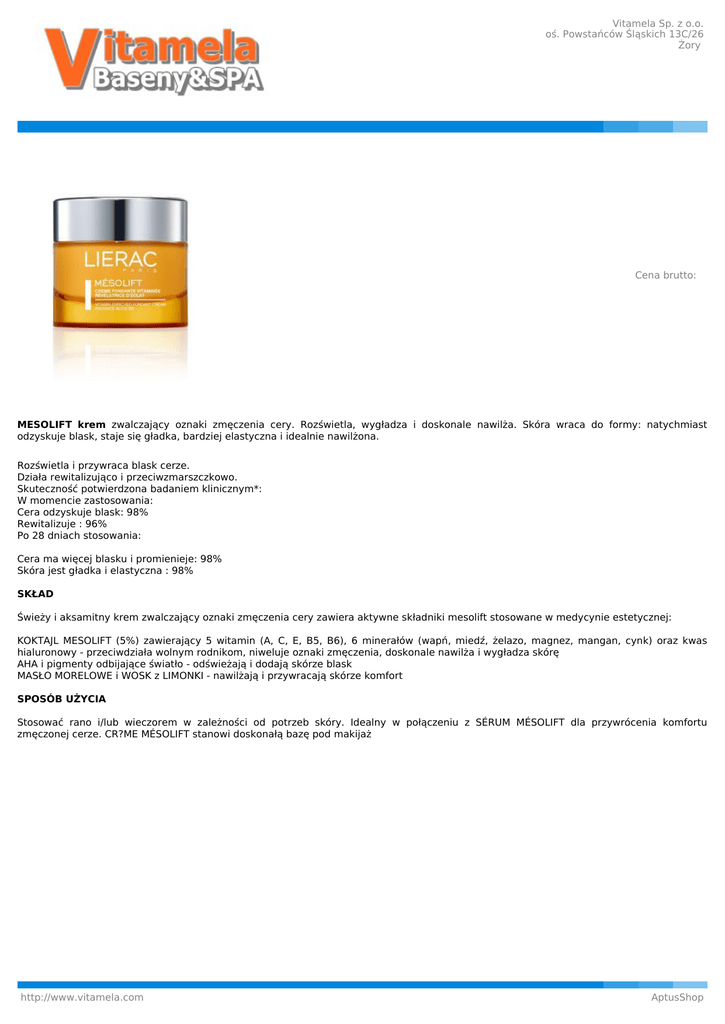 Vitamela Sp. z o.o. oś. Powstańców Śląskich 13C/26 Żory Cena brutto: MESOLIFT krem zwalczający oznaki zmęczenia cery. Rozświetla, wygładza i doskonale nawilża. Skóra wraca do formy: natychmiast odzyskuje blask, staje się gładka, bardziej elastyczna i idealnie nawilżona. Rozświetla i przywraca blask cerze. Działa rewitalizująco i przeciwzmarszczkowo. Skuteczność potwierdzona badaniem klinicznym*: W momencie zastosowania: Cera odzyskuje blask: 98% Rewitalizuje : 96% Po 28 dniach stosowania: Cera ma więcej blasku i promienieje: 98% Skóra jest gładka i elastyczna : 98% SKŁAD Świeży i aksamitny krem zwalczający oznaki zmęczenia cery zawiera aktywne składniki mesolift stosowane w medycynie estetycznej: KOKTAJL MESOLIFT (5%) zawierający 5 witamin (A, C, E, B5, B6), 6 minerałów (wapń, miedź, żelazo, magnez, mangan, cynk) oraz kwas hialuronowy - przeciwdziała wolnym rodnikom, niweluje oznaki zmęczenia, doskonale nawilża i wygładza skórę AHA i pigmenty odbijające światło - odświeżają i dodają skórze blask MASŁO MORELOWE i WOSK z LIMONKI - nawilżają i przywracają skórze komfort SPOSÓB UŻYCIA Stosować rano i/lub wieczorem w zależności od potrzeb skóry. Idealny w połączeniu z SÉRUM MÉSOLIFT dla przywrócenia komfortu zmęczonej cerze. CR?ME MÉSOLIFT stanowi doskonałą bazę pod makijaż http://www.vitamela.com AptusShop