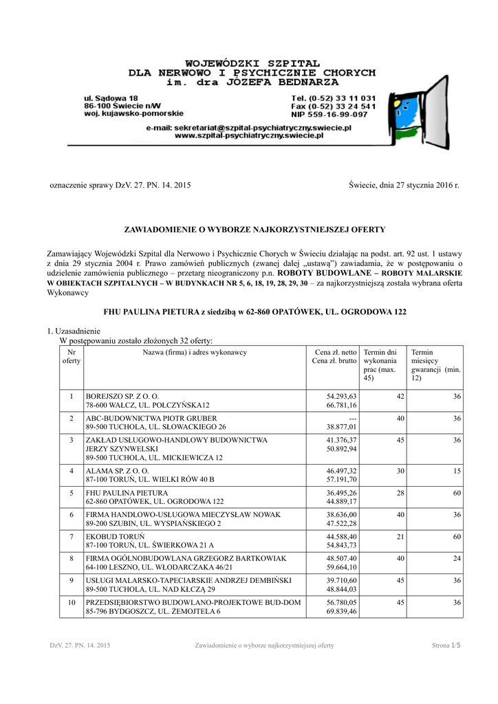 oznaczenie sprawy DzV. 27. PN. 14. 2015 Świecie, dnia 27 stycznia 2016 r. ZAWIADOMIENIE O WYBORZE NAJKORZYSTNIEJSZEJ OFERTY Zamawiający Wojewódzki Szpital dla Nerwowo i Psychicznie Chorych w Świeciu działając na podst. art. 92 ust. 1 ustawy z dnia 29 stycznia 2004 r. Prawo zamówień publicznych (zwanej dalej „ustawą”) zawiadamia, że w postępowaniu o udzielenie zamówienia publicznego – przetarg nieograniczony p.n. ROBOTY BUDOWLANE – ROBOTY MALARSKIE W OBIEKTACH SZPITALNYCH – W BUDYNKACH NR 5, 6, 18, 19, 28, 29, 30 – za najkorzystniejszą została wybrana oferta Wykonawcy FHU PAULINA PIETURA z siedzibą w 62-860 OPATÓWEK, UL. OGRODOWA 122 1. Uzasadnienie W postępowaniu zostało złożonych 32 oferty: Nr oferty Nazwa (firma) i adres wykonawcy Cena zł. netto Termin dni Cena zł. brutto wykonania prac (max. 45) Termin miesięcy gwarancji (min. 12) 1 BOREJSZO SP. Z O. O. 78-600 WAŁCZ, UL. POŁCZYŃSKA12 54.293,63 66.781,16 42 36 2 ABC-BUDOWNICTWA PIOTR GRUBER 89-500 TUCHOLA, UL. SŁOWACKIEGO 26 --38.877,01 40 36 3 ZAKŁAD USŁUGOWO-HANDLOWY BUDOWNICTWA JERZY SZYNWELSKI 89-500 TUCHOLA, UL. MICKIEWICZA 12 41.376,37 50.892,94 45 36 4 ALAMA SP. Z O. O. 87-100 TORUŃ, UL. WIELKI RÓW 40 B 46.497,32 57.191,70 30 15 5 FHU PAULINA PIETURA 62-860 OPATÓWEK, UL. OGRODOWA 122 36.495,26 44.889,17 28 60 6 FIRMA HANDLOWO-USŁUGOWA MIECZYSŁAW NOWAK 89-200 SZUBIN, UL. WYSPIAŃSKIEGO 2 38.636,00 47.522,28 40 36 7 EKOBUD TORUŃ 87-100 TORUŃ, UL. ŚWIERKOWA 21 A 44.588,40 54.843,73 21 60 8 FIRMA OGÓLNOBUDOWLANA GRZEGORZ BARTKOWIAK 64-100 LESZNO, UL. WŁODARCZAKA 46/21 48.507.40 59.664,10 40 24 9 USŁUGI MALARSKO-TAPECIARSKIE ANDRZEJ DEMBIŃSKI 89-500 TUCHOLA, UL. NAD KŁCZĄ 29 39.710,60 48.844,03 45 36 10 PRZEDSIĘBIORSTWO BUDOWLANO-PROJEKTOWE BUD-DOM 85-796 BYDGOSZCZ, UL. ŻEMOJTELA 6 56.780,05 69.839,46 45 36 DzV. 27. PN. 14. 2015 Zawiadomienie o wyborze najkorzystniejszej oferty Strona 1/5 11 ARTEXBUD JAROSŁAW OLEKSIŃSKI 86-200 CHEŁMNO, UL CHABROWA 25 49.756,03 61.199,92 45 24 12 ZAKŁAD WIELOBRANŻOWY REMONTOWO-BUDOWLANY ZBIGNIEW MARKIEWICZ 87-124 ZŁOTORIA, UL. LEŚNA 36 A 48.719,72 59.925,26 45 36 13 PRZEDSIĘBIORSTWO WIELOBRAŃŻOWE ELMUR-COMPLEX 86-011 WTELNO, GOŚCIERADZ UL. KAMERALNA 3 53.047,77 65.248,76 35 36 14 FIRMA HANDLOWO-USŁUGOWA KOD-BUD TOMASZ DUBILIS 86-330 MEŁNO 43 44.404,64 54.617,71 40 24 15 ZAKŁAD REMONTOWO-BUDOWLANY EDWARD POĆWIARDOWSKI 86-100 ŚWIECIE, UL. GAŁCZYŃSKIEGO 3B/18 47.131,13 57.971,29 45 60 16 ZAKŁAD USŁUGOWY DAR MAR MARIUSZ GRZANKA 87-710 SŁUŻEWO, UL. 1000-LECIA 19 72.311.85 72.311,85 43 12 17 ETNA KATARZYNA PACHOJKA 89-506 KĘSOWO, UL. CHOJNICKA 5 63.655,18 78,295,87 40 18 18 PRZEDSIĘBIORSTWO USŁUGOWE KOGA ADAM SALA 86-300 GRUDZIĄDZ, UL. SZOSA TORUŃSKA 49 43.370,83 53.346,12 45 36 19 SPÓŁDZIELNIA PRODUKCJI ROLNEJ OSNOWO ZAKŁAD REMONTOWO-BUDOWLANY 86-200 CHEŁMNO, OSNOWO 14 44.644,81 54.913,12 40 36 20 USŁUGI BUDOWLANE I TRANSPORTOWE PIOTR PREUSS 87-140 CHEŁMŻA, UL. KS. SZYDZIKA 8 38.428,00 47.266,44 35 36 21 PRZEDSIĘBIORSTWO HANDLOWO-USŁUGOWE WIKTOR PAWEŁ KRAUZE 87-140 CHEŁMŻA, UL. TRAUGUTTA 12 47.604,00 58.552,92 40 36 22 KMS KAROLINA SOCHA 87-100 TORUŃ, UL. ZBOŻOWA 108 58.000,00 71.340,00 45 12 23 ZAKŁAD BUDOWLANY PIOTR GÓRSKI 86-105 ŚWIECIE, UL. WANDY RUTKIEWICZ 7 38.622,79 47.506,03 40 36 24 KOM-BUD ŚWIECIE SP. Z O. O. 86-100 ŚWIECIE, UL. MESTWINA 6 36.845,28 45.319,69 30 36 25 PRZEDSIĘBIORSTWO HANDLOWO-USŁUGOWE JACEK JAKUBCZAK 85-791 BYDGOSZCZ, UL. POWALISZA 2/39 64.407.19 79.220,84 35 24 26 ZAKŁĄD DEKARSKO-BLACHARSKI DAŃCZAK PIOTR 86-200 CHEŁMNO, UL. POLNA 11 A 80.873,94 99.474,95 45 12 27 ZAKŁAD OGÓLNO BUDOWLANY OLEŚ BULIŃSKI 86-070 DĄBROWA CHEŁMIŃSKA, UL. RZEMIEŚLNICZA 43 46.164,03 56.781,76 40 36 28 MEDICSYSTEMART MACIEJ HOFFMANN 88-400 ŻNIN, MURCZYN 41 49.840,84 61,304,23 40 36 29 FIRMA OGÓLNOBUDOWLANA MIECZYSŁAW SZULCZYŃSKI 89-500 TUCHOLA, UL. KNIEJOWA 30 43.804.98 53.880,13 42 18 30 ZAKŁAD REMONTOWO-BUDOWLANY REM-BUD SP. J. MATCZYŃSKI, KOSIŃSKI, RYBICKI 86-300 GRUDZIĄDZ, UL. DĄBROWSKIEGO 15 51.130,74 62.890,81 45 12 31 P.H.U. KOSZOWSKI S.C. ANDRZEJ KOSZOWSKI I EDYTA SKIBA-KOSZOWSKA 86-120 PRUSZCZ, UL. SZKOLNA 15 47.130,47 57.970,48 45 36 32 PRZEDSIĘBIORSTWO HANDLOWO-USŁUGOWE LIBRA P. BIEŃ, M. i S. GRABOWIECCY 86-105 ŚWIECIE, UL. KARDYNAŁA WYSZYŃSKIEGO 10 54.364,43 66.868,25 40 24 Z postępowania nie wykluczono Wykonawców. DzV. 27. PN. 14. 2015 Zawiadomienie o wyborze najkorzystniejszej oferty Strona 2/5 W postępowaniu odrzucono Oferty niżej wymienionych Wykonawców. 1) Oferta nr 2 złożona przez Wykonawcę ABC-BUDOWNICTWA PIOTR GRUBER została odrzucona na podstawie art. 89 ust. 1 pkt 2 ustawy – treść Oferty nie odpowiada treści specyfikacji istotnych warunków zamówienia w ten sposób, że zawiera niepoprawnie wypełniony kosztorys ofertowy. Pozycja kosztorysowa nr 23 w ofercie i w "wyjaśnieniu elementów mających znaczący wpływ na wysokość ceny" z 8 stycznia 2016 r. nie obejmuje wartości materiału - 4 szt. drzwi szerokości 110 cm. Na podstawie art. 26 ust. 3 ustawy Zamawiający nie wezwał Wykonawcy do uzupełnienia Oferty, ponieważ mimo jej uzupełnienia podlegałaby odrzuceniu z wyżej wymienionego powodu. 2) Oferta nr 3 złożona przez Wykonawcę ZAKŁAD USŁUGOWO-HANDLOWY BUDOWNICTWA JERZY SZYNWELSKI została odrzucona na podstawie art. 89 ust. 1 pkt 4 ustawy w związku z art. 90 ust. 3 ustawy – Oferta zawiera rażąco niską cenę w stosunku do przedmiotu zamówienia. Podczas badania Oferty Zamawiający stwierdził, że zaoferowana cena Wykonawcy jest o 31,6% niższa od wartości zamówienia. Dlatego na podstawie art. 90 ust. 1 ustawy Zamawiający w dniu 7 stycznia 2016 r. zwrócił się do Wykonawcy o udzielenie wyjaśnienia, w tym złożenie dowodów, dotyczących elementów oferty mających wpływ na wysokość ceny. Wykonawca w odpowiedzi z dnia 12 stycznia 2016 r. (e-mail) złożył niewystarczające wyjaśnienie, tym samym nie wykaza