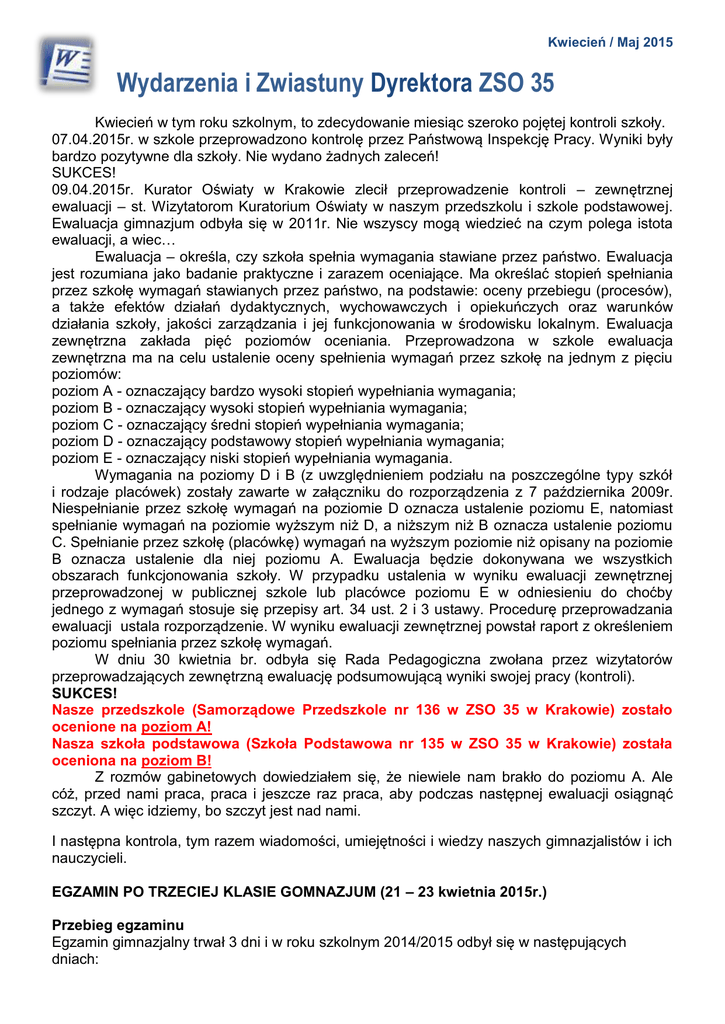 Kwiecień / Maj 2015 Wydarzenia i Zwiastuny Dyrektora ZSO 35 Kwiecień w tym roku szkolnym, to zdecydowanie miesiąc szeroko pojętej kontroli szkoły. 07.04.2015r. w szkole przeprowadzono kontrolę przez Państwową Inspekcję Pracy. Wyniki były bardzo pozytywne dla szkoły. Nie wydano żadnych zaleceń! SUKCES! 09.04.2015r. Kurator Oświaty w Krakowie zlecił przeprowadzenie kontroli – zewnętrznej ewaluacji – st. Wizytatorom Kuratorium Oświaty w naszym przedszkolu i szkole podstawowej. Ewaluacja gimnazjum odbyła się w 2011r. Nie wszyscy mogą wiedzieć na czym polega istota ewaluacji, a wiec… Ewaluacja – określa, czy szkoła spełnia wymagania stawiane przez państwo. Ewaluacja jest rozumiana jako badanie praktyczne i zarazem oceniające. Ma określać stopień spełniania przez szkołę wymagań stawianych przez państwo, na podstawie: oceny przebiegu (procesów), a także efektów działań dydaktycznych, wychowawczych i opiekuńczych oraz warunków działania szkoły, jakości zarządzania i jej funkcjonowania w środowisku lokalnym. Ewaluacja zewnętrzna zakłada pięć poziomów oceniania. Przeprowadzona w szkole ewaluacja zewnętrzna ma na celu ustalenie oceny spełnienia wymagań przez szkołę na jednym z pięciu poziomów: poziom A - oznaczający bardzo wysoki stopień wypełniania wymagania; poziom B - oznaczający wysoki stopień wypełniania wymagania; poziom C - oznaczający średni stopień wypełniania wymagania; poziom D - oznaczający podstawowy stopień wypełniania wymagania; poziom E - oznaczający niski stopień wypełniania wymagania. Wymagania na poziomy D i B (z uwzględnieniem podziału na poszczególne typy szkół i rodzaje placówek) zostały zawarte w załączniku do rozporządzenia z 7 października 2009r. Niespełnianie przez szkołę wymagań na poziomie D oznacza ustalenie poziomu E, natomiast spełnianie wymagań na poziomie wyższym niż D, a niższym niż B oznacza ustalenie poziomu C. Spełnianie przez szkołę (placówkę) wymagań na wyższym poziomie niż opisany na poziomie B oznacza ustalenie dla niej poziomu A. Ewaluacja będzie dokonywana we wszystkich obszarach funkcjonowania szkoły. W przypadku ustalenia w wyniku ewaluacji zewnętrznej przeprowadzonej w publicznej szkole lub placówce poziomu E w odniesieniu do choćby jednego z wymagań stosuje się przepisy art. 34 ust. 2 i 3 ustawy. Procedurę przeprowadzania ewaluacji ustala rozporządzenie. W wyniku ewaluacji zewnętrznej powstał raport z określeniem poziomu spełniania przez szkołę wymagań. W dniu 30 kwietnia br. odbyła się Rada Pedagogiczna zwołana przez wizytatorów przeprowadzających zewnętrzną ewaluację podsumowującą wyniki swojej pracy (kontroli). SUKCES! Nasze przedszkole (Samorządowe Przedszkole nr 136 w ZSO 35 w Krakowie) zostało ocenione na poziom A! Nasza szkoła podstawowa (Szkoła Podstawowa nr 135 w ZSO 35 w Krakowie) została oceniona na poziom B! Z rozmów gabinetowych dowiedziałem się, że niewiele nam brakło do poziomu A. Ale cóż, przed nami praca, praca i jeszcze raz praca, aby podczas następnej ewaluacji osiągnąć szczyt. A więc idziemy, bo szczyt jest nad nami. I następna kontrola, tym razem wiadomości, umiejętności i wiedzy naszych gimnazjalistów i ich nauczycieli. EGZAMIN PO TRZECIEJ KLASIE GOMNAZJUM (21 – 23 kwietnia 2015r.) Przebieg egzaminu Egzamin gimnazjalny trwał 3 dni i w roku szkolnym 2014/2015 odbył się w następujących dniach: część humanistyczna – 21 kwietnia 2015r. - z zakresu historii i wiedzy o społeczeństwie - godz. 9:00 (trwał 60 minut) - z zakresu języka polskiego - godz. 11:00 (trwał 90 minut) część matematyczno-przyrodnicza - 22 kwietnia 2015 r. - z zakresu przedmiotów przyrodniczych - godz. 9:00 (trwał 60 minut) - z zakresu matematyki - godz. 11:00 (trwał 90 minut) język obcy nowożytny - 23 kwietnia 2015 r. - na poziomie podstawowym - godz. 9:00 (trwał 60 minut) - na poziomie rozszerzonym - godz. 11:00 (trwał 60 minut) Dodatkowe terminy egzaminu gimnazjalnego to 1 - 3 czerwca 2015 r. Część humanistyczna: Język polski Zadania z języka polskiego miały formę otwartą oraz zamkniętą i odnosiły się do tekstów literackich, popularnonaukowych oraz publicystycznych. Polecenia sprawdzały umiejętność czytania ze zrozumieniem, a także znajomość lektur i twórczości autorów (wymagane na egzaminie utwory literackie oraz dorobek autorów są oznaczone * w spisie lektur dla gimnazjum). Jednym z zadań otwartych na egzaminie gimnazjalnym była dłuższa wypowiedź pisemna w formie rozprawki, opowiadania, opisu, charakterystyki lub sprawozdania. Na egzaminie mogła zostać również sprawdzona umiejętność tworzenia form użytkowych, np. CV, list motywacyjny, ogłoszenie, zaproszenie, dedykacja, list oficjalny. Część humanistyczna: Historia i wiedza o społeczeństwie Polecenia z historii i WOS-u mają formę zamkniętą. Zadania odwołują się do różnych epok oraz materiałów źródłowych (teksty literackie, popularnonaukowe, tabele, mapy). Są zróżnicowane pod względem trudności. Egzamin sprawdza, m.in. takie umiejętności jak: chronologia historyczna, analiza oraz interpretacja historyczna, znajomość ustrojów, rozpoznawanie i rozwiązywanie problemów współczesnego społeczeństwa, analizowanie wykresów. Część matematyczna Zadania z matematyki mają formę otwartą oraz zamkniętą. Egzamin składa się przede wszystkim z poleceń, które sprawdzają rozumienie pojęć matematycznych oraz dobieranie strategii matematycznych. Zadania sprawdzą takie umiejętności jak: sprawność rachunkowa, odczytywanie wykresów, interpretacja danych tekstowych, liczbowych i graficznych, rozumowanie i tworzenie strategii, modelowanie matematyczne. Polecenie z matematyki obejmują zagadnienia z arytmetyki i geometrii, w tym: liczby wymierne, procenty, potęgi, pierwiastki, wyrażenia algebraiczne, równania, wykresy funkcji, statystyka opisowa, figury płaski