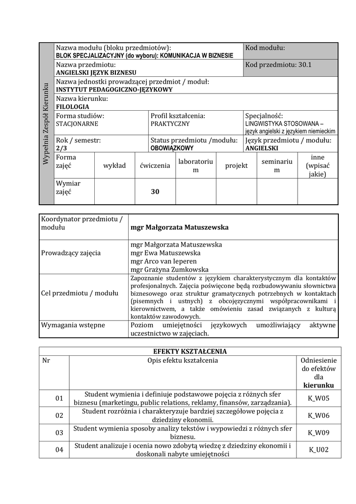 Nazwa modułu (bloku przedmiotów): Kod modułu: Nazwa przedmiotu: Kod przedmiotu: 30.1 BLOK SPECJALIZACYJNY (do wyboru): KOMUNIKACJA W BIZNESIE Wypełnia Zespół Kierunku ANGIELSKI JĘZYK BIZNESU Nazwa jednostki prowadzącej przedmiot / moduł: INSTYTUT PEDAGOGICZNO-JĘZYKOWY Nazwa kierunku: FILOLOGIA Forma studiów: Profil kształcenia: STACJONARNE PRAKTYCZNY LINGWISTYKA STOSOWANA – język angielski z językiem niemieckim Rok / semestr: Status przedmiotu /modułu: Język przedmiotu / modułu: OBOWIĄZKOWY 2/3 Forma zajęć Specjalność: wykład Wymiar zajęć Koordynator przedmiotu / modułu Prowadzący zajęcia Cel przedmiotu / modułu Wymagania wstępne ćwiczenia laboratoriu m ANGIELSKI projekt seminariu m 30 mgr Małgorzata Matuszewska mgr Małgorzata Matuszewska mgr Ewa Matuszewska mgr Arco van Ieperen mgr Grażyna Zumkowska Zapoznanie studentów z językiem charakterystycznym dla kontaktów profesjonalnych. Zajęcia poświęcone będą rozbudowywaniu słownictwa biznesowego oraz struktur gramatycznych potrzebnych w kontaktach (pisemnych i ustnych) z obcojęzycznymi współpracownikami i kierownictwem, a także omówieniu zasad związanych z kulturą kontaktów zawodowych. Poziom umiejętności językowych uczestnictwo w zajęciach. umożliwiający EFEKTY KSZTAŁCENIA Opis efektu kształcenia Nr 01 02 03 04 inne (wpisać jakie) Student wymienia i definiuje podstawowe pojęcia z różnych sfer biznesu (marketingu, public relations, reklamy, finansów, zarządzania). Student rozróżnia i charakteryzuje bardziej szczegółowe pojęcia z dziedziny ekonomii. Student wymienia sposoby analizy tekstów i wypowiedzi z różnych sfer biznesu. Student analizuje i ocenia nowo zdobytą wiedzę z dziedziny ekonomii i doskonali nabyte umiejętności aktywne Odniesienie do efektów dla kierunku K_W05 K_W06 K_W09 K_U02 05 06 07 08 09 Student rozpoznaje różne formy wypowiedzi pisemnej i ustnej oraz porównuje je i ocenia krytycznie w celu rozwijania umiejętności słuchania i czytania ze zrozumieniem. Student konstruuje własne wypowiedzi pisemne i ustne z wykorzystaniem właściwego słownictwa i stylu charakterystycznego dla danej formy komunikacji. Student interpretuje różne rodzaje tekstów w języku źródłowym oraz dobiera odpowiednie struktury gramatyczne i leksykalne w celu przełożenia tekstu na język docelowy. Student potrafi zastosować odpowiednią metodę przekazu bądź wymiany informacji np. prezentacje, negocjacje, mediacje, różne formy korespondencji pisemnej, w zależności od sytuacji. Student sprawnie porusza się w różnych środowiskach zawodowych oraz elastycznie dopasowuje do wymogów rynku pracy w dziedzinach wymagających znajomości języka angielskiego. K_U04 K_U03 K_U05 K_U05 K_U10 K_U03 K_U07 K_K05 TREŚCI PROGRAMOWE Wykład Nie dotyczy. Ćwiczenia Zapoznanie studentów ze słownictwem i strukturami leksykalnymi stosowanymi w różnych sytuacjach zawodowych; omówienie rodzajów korespondencji i komunikacji w biznesie; analiza potencjalnych sytuacji problemowych oraz proponowanie rozwiązań; przybliżenie studentom międzynarodowych aspektów biznesu; omówienie podstawowych pojęć z zakresu kultury i psychologii biznesu. Laboratorium Nie dotyczy. Projekt Nie dotyczy. Literatura podstawowa Cotton, David – Falvey, David – Kent, Simon. Market Leader Pre-intermediate. 3rd Edition. Pearson Longman, 2007. Cotton, David – Falvey, David – Kent, Simon. Market Leader Intermediate. 3rd Edition. Pearson Longman, 2005. Cotton, David – Falvey, David – Kent, Simon. Market Leader Upperintermediate. 3rd Edition. Pearson Longman, 2010. Hollet, Vicky & Whitby, Norman. Lifestyle Pre-intermediate. Pearson Longman, 2010. Hollet, Vicky & Whitby, Norman. Lifestyle Intermediate. Pearson Longman, 2010. Hollet, Vicky & Whitby, Norman. Lifestyle Upper-intermediate. Pearson Longman, 2010. Taylor, Liz. International Express Pre-intermediate. New edition. Oxford University Press, 2010. Taylor, Liz. International Express Intermediate. New edition. Oxford University Press, 2010. Taylor, Liz. International Express Upper-intermediate. New edition. Oxford University Press, 2010. Whitby, Norman. Business Benchmark Pre-Intermediate to Intermediate. Cambridge University Press, 2006. Ashley, A. Oxford Correspondence Workbook. New Edition. Oxford University Press, 2003. Badger, Ian. English for work: Everyday Business English. Pearson Longman, 2003. Bailey, Edward P. Jr. Plain English at Work. A Guide to Business Writing and Speaking. New York and Oxford: Oxford University Press, 1996. Mascull, Bill. Business Vocabulary in Use. Cambridge University Press, 2002. Literatura uzupełniająca praca z książką, dyskusja, burza mózgów, samodzielne dochodzenie do wiedzy, ćwiczenia przedmiotowe, gry dydaktyczne, praca w grupach, analiza przypadków Metody kształcenia Nr efektu kształcenia Metody weryfikacji efektów kształcenia kolokwium 01,02,03, 05,06, 07,08 rozwiązywanie zadań praca zespołowa zadania domowe Prezentacja Forma i warunki zaliczenia 06,07,08,09 05,06,07,08,09 04,05,06,07,08,09 04,06,07 3 kolokwia (pisanie, czytanie, słuchanie) – 75 % wypowiedź ustna (prezentacja lub rozmowa sterowana) – 25% NAKŁAD PRACY STUDENTA Liczba godzin Udział w wykładach Samodzielne studiowanie tematyki wykładów Udział w ćwiczeniach audytoryjnych i laboratoryjnych* Samodzielne przygotowywanie się do ćwiczeń* Przygotowanie projektu / eseju / itp. * Przygotowanie się do egzaminu / zaliczenia Udział w konsultacjach Inne ŁĄCZNY nakład pracy studenta w godz. Liczba punktów ECTS za przedmiot Liczba p. ECTS związana z zajęciami praktycznymi* Liczba p. ECTS za zajęciach wymagające bezpośredniego udziału nauczycieli akademickich 30 10 5 5 50 2 40 (30+10) 1,6 ECTS 35 (30+5) 1,4 ECTS