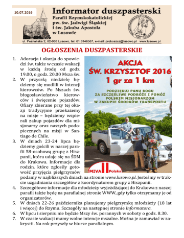 10.07.2016 OGŁOSZENIA DUSZPASTERSKIE 1. Adoracja i okazja do spowiedzi św. także w czasie wakacji w każdą środę od godz. 19.00, o godz. 20.00 Msza św. 2. W przyszłą niedzielę będziemy się modlili w intencji kierowców. Po Mszach św. błogosławieństwo kierowców i święcenie pojazdów. Ofiary zbierane przy tej okazji tradycyjnie przekażemy na misje – będziemy wspierali zakup pojazdów dla misjonarzy oraz naszych podopiecznych na misji w Santiago de Chile. 3. W dniach 23-24 lipca będziemy gościli w naszej parafii 58-osobową grupę z Hiszpanii, która udaje się na ŚDM do Krakowa. Informacje dla rodzin, które zgłosiły gotowość przyjęcia pielgrzymów podamy w najbliższych dniach na stronie www.lusowo.pl. Jesteśmy w trakcie uzgadniania szczegółów z koordynatorem grupy z Hiszpanii. 4. Szczegółowe informacje dla młodzieży wyjeżdżającej do Krakowa z naszej parafii także będę na parafialnej stronie WWW, gdy tylko otrzymamy je od organizatorów. 5. W dniach 22-26 października planujemy pielgrzymkę młodzieży (18 lat i więcej) do Rzymu. Szczegóły na następnej stronie Informatora. 6. W lipcu i sierpniu nie będzie Mszy św. porannych w soboty o godz. 8.30. 7. W czasie wakacji mamy wolne intencje mszalne. Można je zamawiać w zakrystii. Na rok przyszły w biurze parafialnym. RZYM DLA MŁODYCH – PAŹDZIERNIK 2016 Zapraszamy młodzież (18+) naszej parafii na pielgrzymkę do Rzymu w Roku Miłosierdzia. Wyjazd w terminie 22-26 października br. jest organizowany bez udziału biura podróży. Koszt wyjazdu to ok. 1200 zł, koszty będą uzależniona od bieżących cen biletów lotniczych i noclegów. Wylot z Berlina (sobota, g. 6.30, powrót do Berlina – środa, godz. 23.00), ponieważ loty z Poznania nie dają możliwości uczestnictwa w spotkaniu z papieżem Franciszkiem. Pierwsze wpłaty będą na zakup biletów lotniczych przyjmuję do 24 lipca, by w kolejnym dniu dokonać zakupu biletów. Jeśli wcześniej będę miał minimum 6 os. dokonam dla nich wcześniejszego zakupu po niższych cenach. W miarę możliwości proszę o wpłatę 400 zł (gdyby ktoś miał problem z wyłożeniem do razu tej kwoty, proszę o kontakt). Bilety są bezzwrotne (można ewentualnie za dodatkową opłatą zmienić osobę). Będzie możliwość dołączenia do grupy także później, ale trzeba się liczyć ze zmianą cen. INTENCJE MSZY ŚWIĘTYCH PONIEDZIAŁEK 11.07.2016 r. 18.00 – WTOREK 12.07.2016 r. 18.00 – ŚRODA 13.07.2016 r. 20.00 – Z podziękowaniem za odebrane łaski i prośbą o bł. Boże dla Heleny i Kazimierza Szmaniów z ok. 66 rocz. małżeństwa - śp. Marianny Szymańskiej – od Małgorzaty i Jakuba Wenzlów CZWARTEK 14.07.2016 r. 18.00 – O Boże błogosławieństwo i szczęśliwe rozwiązanie PIĄTEK 15.07.2016 r. 18.00 – śp. Henryki Wójtowicz i zm. z rodz. Hombków SOBOTA 16.07.2016 r. 13.00 – SWADZIM – 16.00 – Ślub Magdaleny Szopka i Damiana Ciemniewskiego 17.00 – śp. Marii-Magdaleny Biernackiej – od męża NIEDZIELA 17.07.2016 r. 7.30 – śp. zm. z rodz. Kujawów, Szulczewskich, Świtałów, Torzów, Sobkowiaków, Wleklików, Gulczyńskich, Orcholskich, Mensfeldów 9.00 – O bł. Boże i opiekę Najświętszej Maryi Panny dla ks. Henryka oraz dla ks. Daniela z ok. ich imienin – int. Żywego Różańca - śp. Bronisławy Wojtukiewicz – od sąsiadów Marciniaków 10.30 – śp. Czesława i Teresy Szymańskich, Wacława Gołdowicza i zm. z rodz. Czajków i Kromolickich - śp. Janiny Janeczek – od cioci Heleny 12.00 – śp. Franciszki, Jakuba, Edwarda, Władysława, Zbigniewa Mysiorów - Z podziękowaniem za odebrane łaski i prośbą o bł. Boże dla Zuzanny z ok.1 ur. oraz Jakuba z ok. 31 ur. 18.00 – śp. Eugeniusza Łagutina (31 r. śm.), zm. z rodz. Ludków, Hejwoszów, Łagutinów Intencje są odprawiane wg kolejności. Druga i kolejne intencje, jeśli nie ma dwóch kapłanów przy ołtarzu, będą odprawione w najbliższym czasie w dni powszednie.