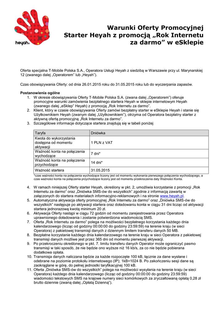 Warunki Oferty Promocyjnej Starter Heyah z promocją „Rok Internetu za darmo” w eSklepie Oferta specjalna T-Mobile Polska S.A., Operatora Usługi Heyah z siedzibą w Warszawie przy ul. Marynarskiej 12 (zwanego dalej „Operatorem” lub „Heyah”). Czas obowiązywania Oferty: od dnia 26.01.2015 roku do 31.05.2015 roku lub do wyczerpania zapasów. Postanowienia ogólne 1. W okresie obowiązywania Oferty T-Mobile Polska S.A. (zwana dalej „Operatorem”) oferuje promocyjne warunki zamówienia bezpłatnego startera Heyah w sklepie internetowym Heyah (zwanego dalej „eSklep” Heyah) z promocją „Rok Internetu za darmo”. 2. Klient, który w czasie obowiązywania Oferty zamówi bezpłatny starter w eSklepie Heyah i stanie się Użytkownikiem Heyah (zwanym dalej „Użytkownikiem”), otrzyma od Operatora bezpłatny starter z aktywną ofertą promocyjną „Rok Internetu za darmo”. 3. Szczegółowe informacje dotyczące startera znajdują się w tabeli poniżej Taryfa Kwota do wykorzystania dostępna od momentu aktywacji Ważność konta na połączenia wychodzące Ważność konta na połączenia przychodzące Dniówka Ważność startera 31.05.2015 1 PLN z VAT 7 dni* 14 dni* *czas ważności konta na połączenia wychodzące liczony jest od momentu wykonania pierwszego połączenia wychodzącego, a czas ważności konta na połączenia przychodzące liczony jest od momentu przekroczenia daty Ważności Konta. 4. W ramach niniejszej Oferty starter Heyah, określony w pkt. 2, umożliwia korzystanie z promocji „Rok Internetu za darmo” oraz „Dniówka SMS-ów do wszystkich” zgodnie z informacją zawartą w załączonych do startera materiałach informacyjno-reklamowych i na stronie www.heyah.pl. 5. Automatyczna aktywacja oferty promocyjnej „Rok Internetu za darmo” oraz „Dniówka SMS-ów do wszystkich” następuje po aktywacji startera oraz doładowaniu konta w ciągu 31 dni licząc od aktywacji startera jednorazową kwotą minimum 20 zł. 6. Aktywacja Oferty nastąpi w ciągu 72 godzin od momentu zarejestrowania przez Operatora uprawnionego doładowania i zostanie potwierdzona wiadomością SMS. 7. Oferta „Rok Internetu za darmo” polega na możliwości bezpłatnego korzystania każdego dnia kalendarzowego (licząc od godziny 00:00:00 do godziny 23:59:59) na terenie kraju (w sieci Operatora) z pakietowej transmisji danych z dziennym limitem transferu danych 50 MB. 8. Bezpłatne korzystanie każdego dnia kalendarzowego na terenie kraju w sieci Operatora z pakietowej transmisji danych możliwe jest przez 365 dni od momentu pierwszej aktywacji. 9. Po przekroczeniu określonego w pkt. 7. limitu transferu danych Operator może ograniczyć pasmo transmisji w taki sposób, że nie będzie ono wyższe niż 16 kb/s, za co nie będzie pobierana dodatkowa opłata. 10. Transmisja danych naliczana będzie za każde rozpoczęte 100 kB, łącznie za dane wysłane i odebrane na poziomie protokołu internetowego (IP); 1kB=1024 B. Po zakończeniu sesji dane są zaokrąglane w górę, do pełnej jednostki taryfikacyjnej 100 kB. 11. Oferta „Dniówka SMS-ów do wszystkich” polega na możliwości wysyłania na terenie kraju (w sieci Operatora) każdego dnia kalendarzowego (licząc od godziny 00:00:00 do godziny 23:59:59) wiadomości tekstowych SMS na krajowe numery sieci komórkowych za zryczałtowaną opłatą 0,28 zł brutto dziennie (zwaną dalej „Opłatą Dzienną”). 12. Opłata Dzienna naliczana jest po wysłaniu w danym dniu kalendarzowym pierwszej Wiadomości SMS. Za wysłanie kolejnych Wiadomości SMS w tym dniu, tj. do godziny 23:59:59 nie będą naliczane dodatkowe opłaty. 13. Warunkiem korzystania z ofert jest posiadanie konta aktywnego na połączenia wychodzące. 14. Skorzystanie z niniejszej Oferty przez Użytkownika oznacza akceptację niniejszych Warunków oferty specjalnej. Serwis „Szafa Gra” oraz „Niusownia” 1. Użytkownikowi, który dokona aktywacji Karty SIM i doładuje konto, w ciągu 30 dni od momentu doładowania konta zostanie aktywowany bezpłatnie: serwis „Szafa Gra” (dalej również „Serwis”), pakiet „Niusownia” (dalej również „Pakiet”). Po aktywacji Serwisu i odpowiednio Pakietu Użytkownik otrzyma SMS potwierdzający aktywację oraz informujący o sposobie rezygnacji z Serwisu i/lub Pakietu. 2. Serwis aktywowany jest z wybranym przez Operatora utworem, za który Operator nie pobierze opłaty. Zmiana utworu przez Użytkownika związana jest z opłatą wskazaną w Regulaminie Serwisu „Granie na Czekanie” / "Szafa Gra" dostępnym na stronie internetowej www.szafagra.heyah.pl. Operator nie pobierze Opłaty Cyklicznej za korzystanie z Serwisu w trakcie okresu promocyjnego trwającego prze pierwszy Cykl 30 dniowy. 3. Przed zakończeniem okresu promocyjnego, o którym mowa w pkt. 2, Użytkownik otrzyma SMS informujący o tym, iż za dalsze korzystanie z Serwisu pobierana będzie przez Operatora Opłata Cykliczna oraz o sposobie bezpłatnej rezygnacji z Serwisu. 4. Po zakończeniu okresu promocyjnego, za dalsze korzystanie z Serwisu Operator będzie pobierał Opłatę Cykliczną, określoną w Regulaminie Serwisu „Granie na Czekanie” /„Szafa Gra”, w wysokości 2,00 zł brutto / Cykl 30 dniowy. 5. Użytkownik może w dowolnym momencie zrezygnować z Serwisu wysyłając SMS o treści NIE na bezpłatny na terenie kraju numer 80333. 6. Korzystanie z Pakietu jest bezpłatne w promocyjnym okresie 7 dni, licząc od dnia otrzymania SMS z potwierdzeniem aktywacji Pakietu. 7. Przed zakończeniem okresu promocyjnego, o którym mowa w pkt 6, Użytkownik otrzyma SMS informujący o opłatach za dalsze korzystanie z Pakietu oraz o sposobie bezpłatnej rezygnacji z Pakietu. 8. Po zakończeniu okresu promocyjnego opłata za jedną otrzymaną wiadomość wyniesie 0,10 zł brutto odpowiednio za: Niusownia SMS „Angielski flirt” lub Niusownia MMS „MMS na dzień dobry” Wiadomości w Pakiecie wysyłane są raz dziennie, od poniedział