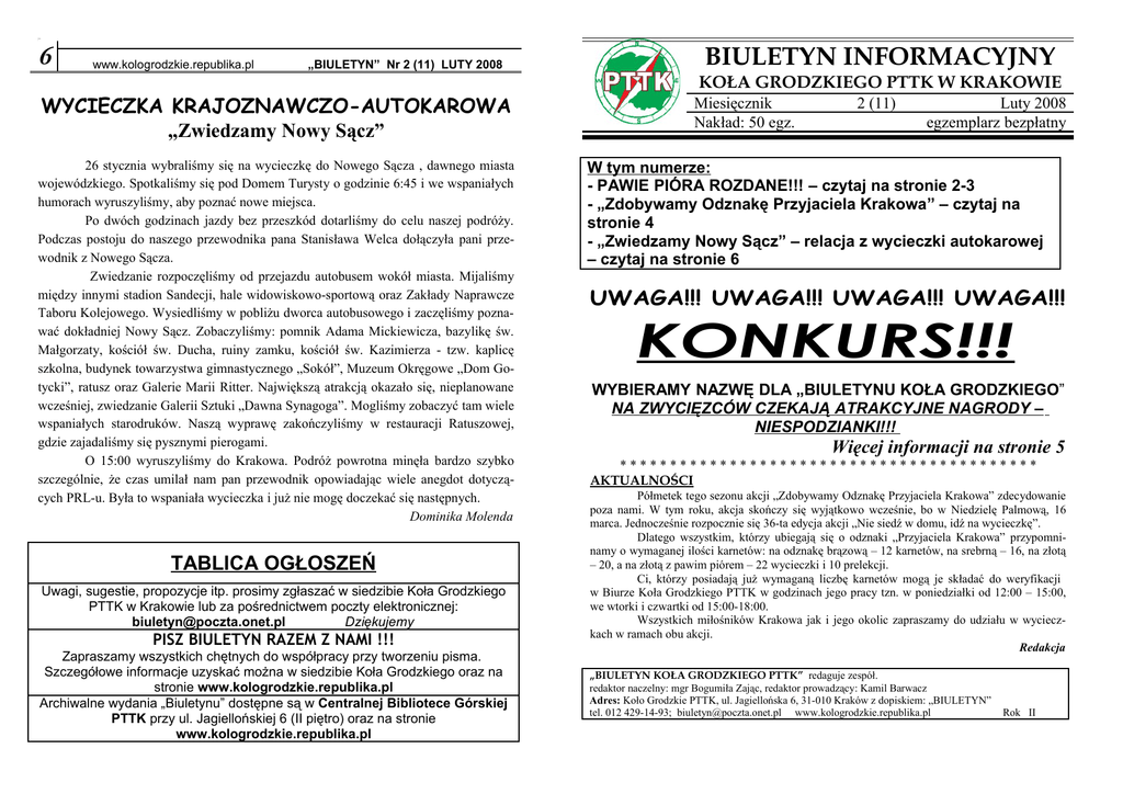Grób j 6 www.kologrodzkie.republika.pl „BIULETYN” Nr 2 (11) LUTY 2008 WYCIECZKA KRAJOZNAWCZO-AUTOKAROWA „Zwiedzamy Nowy Sącz” 26 stycznia wybraliśmy się na wycieczkę do Nowego Sącza , dawnego miasta wojewódzkiego. Spotkaliśmy się pod Domem Turysty o godzinie 6:45 i we wspaniałych humorach wyruszyliśmy, aby poznać nowe miejsca. Po dwóch godzinach jazdy bez przeszkód dotarliśmy do celu naszej podróży. Podczas postoju do naszego przewodnika pana Stanisława Welca dołączyła pani przewodnik z Nowego Sącza. Zwiedzanie rozpoczęliśmy od przejazdu autobusem wokół miasta. Mijaliśmy między innymi stadion Sandecji, hale widowiskowo-sportową oraz Zakłady Naprawcze Taboru Kolejowego. Wysiedliśmy w pobliżu dworca autobusowego i zaczęliśmy poznawać dokładniej Nowy Sącz. Zobaczyliśmy: pomnik Adama Mickiewicza, bazylikę św. Małgorzaty, kościół św. Ducha, ruiny zamku, kościół św. Kazimierza - tzw. kaplicę szkolna, budynek towarzystwa gimnastycznego „Sokół”, Muzeum Okręgowe „Dom Gotycki”, ratusz oraz Galerie Marii Ritter. Największą atrakcją okazało się, nieplanowane wcześniej, zwiedzanie Galerii Sztuki „Dawna Synagoga”. Mogliśmy zobaczyć tam wiele wspaniałych starodruków. Naszą wyprawę zakończyliśmy w restauracji Ratuszowej, gdzie zajadaliśmy się pysznymi pierogami. O 15:00 wyruszyliśmy do Krakowa. Podróż powrotna minęła bardzo szybko szczególnie, że czas umilał nam pan przewodnik opowiadając wiele anegdot dotyczących PRL-u. Była to wspaniała wycieczka i już nie mogę doczekać się następnych. Dominika Molenda TABLICA OGŁOSZEŃ Uwagi, sugestie, propozycje itp. prosimy zgłaszać w siedzibie Koła Grodzkiego PTTK w Krakowie lub za pośrednictwem poczty elektronicznej: [email protected] Dziękujemy PISZ BIULETYN RAZEM Z NAMI !!! Zapraszamy wszystkich chętnych do współpracy przy tworzeniu pisma. Szczegółowe informacje uzyskać można w siedzibie Koła Grodzkiego oraz na stronie www.kologrodzkie.republika.pl Archiwalne wydania „Biuletynu” dostępne są w Centralnej Bibliotece Górskiej PTTK przy ul. Jagiellońskiej 6 (II piętro) oraz na stronie www.kologrodzkie.republika.pl BIULETYN INFORMACYJNY KOŁA GRODZKIEGO PTTK W KRAKOWIE Miesięcznik Nakład: 50 egz. 2 (11) Luty 2008 egzemplarz bezpłatny W tym numerze: - PAWIE PIÓRA ROZDANE!!! – czytaj na stronie 2-3 - „Zdobywamy Odznakę Przyjaciela Krakowa” – czytaj na stronie 4 - „Zwiedzamy Nowy Sącz” – relacja z wycieczki autokarowej – czytaj na stronie 6 UWAGA!!! UWAGA!!! UWAGA!!! UWAGA!!! KONKURS!!! WYBIERAMY NAZWĘ DLA „BIULETYNU KOŁA GRODZKIEGO” NA ZWYCIĘZCÓW CZEKAJĄ ATRAKCYJNE NAGRODY – NIESPODZIANKI!!! Więcej informacji na stronie 5 ****************************************** AKTUALNOŚCI Półmetek tego sezonu akcji „Zdobywamy Odznakę Przyjaciela Krakowa” zdecydowanie poza nami. W tym roku, akcja skończy się wyjątkowo wcześnie, bo w Niedzielę Palmową, 16 marca. Jednocześnie rozpocznie się 36-ta edycja akcji „Nie siedź w domu, idź na wycieczkę”. Dlatego wszystkim, którzy ubiegają się o odznaki „Przyjaciela Krakowa” przypomninamy o wymaganej ilości karnetów: na odznakę brązową – 12 karnetów, na srebrną – 16, na złotą – 20, a na złotą z pawim piórem – 22 wycieczki i 10 prelekcji. Ci, którzy posiadają już wymaganą liczbę karnetów mogą je składać do weryfikacji w Biurze Koła Grodzkiego PTTK w godzinach jego pracy tzn. w poniedziałki od 12:00 – 15:00, we wtorki i czwartki od 15:00-18:00. Wszystkich miłośników Krakowa jak i jego okolic zapraszamy do udziału w wycieczkach w ramach obu akcji. Redakcja „BIULETYN KOŁA GRODZKIEGO PTTK” redaguje zespół. redaktor naczelny: mgr Bogumiła Zając, redaktor prowadzący: Kamil Barwacz Adres: Koło Grodzkie PTTK, ul. Jagiellońska 6, 31-010 Kraków z dopiskiem: „BIULETYN” tel. 012 429-14-93; [email protected] www.kologrodzkie.republika.pl Rok II 2 www.kologrodzkie.republika.pl „BIULETYN” Nr 2 (11) LUTY 2008 „Zdobywamy Odznakę Przyjaciela Krakowa” PAWIE PIÓRA W dniu 13 stycznia 2008 r. odbyła się ważna uroczystość dla uczestników akcji pod nazwą „Zdobywamy Odznakę Przyjaciela Krakowa”. Akcji organizowanej nieprzerwanie od roku 1972 przez nasze Koło Grodzkie PTTK, przy współpracy medialnej , niegdyś „Echa Krakowa”, a obecnie „Polski. Gazety Krakowskiej”, przy wsparciu finansowym Urzędu Miasta Krakowa, przy współudziale Towarzystwa Miłośników Historii i Zabytków Krakowa. Odbyła się ona w auli Polskiej Akademii Umiejętności w Krakowie. Odznaka złota z pawim piórem – Rozpoczęła ją prezes Koła Grodzkiego oto trofeum, które zdobyli !!! fot. Archiwum PTTK, Bogumiła Zając, również główna organizatorka wymienionej Akcji. Przywita przybyłych gości. Przede wszystkim prof. Jerzego Wyrozumskiego, Sekretarza Generalnego PAU, a jednocześnie Prezesa Towarzystwa Miłośników Historii i Zabytków Krakowa, przedstawicieli „Gazety Krakowskiej” w osobach: red. Danuty Górszczyk (odpowiedzialnej w „Gazecie” za stronę medialną akcji) oraz red. Adama Wojnara, fotografa „GK” oraz Jerzego Michała Bożyka i Aleksandra „Makino” Kobylińskiego – artystów, „od oprawy muzycznej” wręczenia odznak z pawim piórem. „BIULETYN” Nr 2 (11) LUTY 2008 www.kologrodzkie.republika.pl 5 Z okazji zbliżającej się pierwszej rocznicy powstania „Biuletynu”, która będzie w kwietniu br., zapraszamy do wzięcia udziału w konkursie pod nazwą: „Nazwa dla Biuletynu”. Poniżej przedstawiamy regulamin konkursu. REGULAMIN KONKURSU „NAZWA DLA BIULETYNU” 1. Organizatorem konkursu „Nazwa dla Biuletynu” jest Koło Grodzkie PTTK w Krakowie, zwane dalej Organizatorem. 2. Przedmiotem konkursu jest wyłonienie nowej nazwy dla „Biuletynu Informacyjnego Koła Grodzkiego PTTK w Krakowie”, zwanego dalej „Biuletynem”. 3. Udział w konkursie mogą wziąć wszyscy