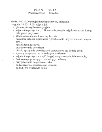 PLAN Podopie DNIA cznych ośrodka Godz. 7. 00 . 9. 0 0 ptryj azd podopie czny ch, śniadanie w godz. 10.00.17.00 zajęciajak: gimnasĘka ogólnokondycyj na zajęcia terapeuty czne, kulinoterapia, terapia zaj ęciow a. tóźme formy, cała grupa przy stole stodki poczęsfunek, kawa czy herbata następni e zabiegi higieni czne ( przebieranie , mycie, zmiana pamper sów, ) rehabilitacja ruchowa przygotowanię do obiadu obiad, sprzątanie po obiedzie i odpoczynęk kto będzie chciał Spacery terapeutycznę na świezym powietrzu zajęcia terapeuty czne częśódruga( muzykoterapia, biblioter apia, ćwiczęnia poprawiające pamięć, gry i zabawy prry gotowanie do podiweczorku podwiec zor ek, spr zątanie po j edzeniu godz.l7.00 vrryjazd do domu