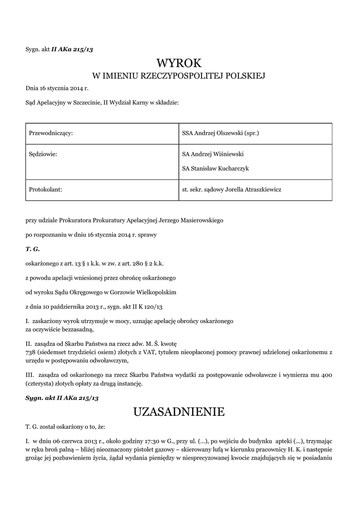 Sygn. akt II AKa 215/13 WYROK W IMIENIU RZECZYPOSPOLITEJ POLSKIEJ Dnia 16 stycznia 2014 r. Sąd Apelacyjny w Szczecinie, II Wydział Karny w składzie: Przewodniczący: SSA Andrzej Olszewski (spr.) Sędziowie: SA Andrzej Wiśniewski SA Stanisław Kucharczyk Protokolant: st. sekr. sądowy Jorella Atraszkiewicz przy udziale Prokuratora Prokuratury Apelacyjnej Jerzego Masierowskiego po rozpoznaniu w dniu 16 stycznia 2014 r. sprawy T. G. oskarżonego z art. 13 § 1 k.k. w zw. z art. 280 § 2 k.k. z powodu apelacji wniesionej przez obrońcę oskarżonego od wyroku Sądu Okręgowego w Gorzowie Wielkopolskim z dnia 10 października 2013 r., sygn. akt II K 120/13 I. zaskarżony wyrok utrzymuje w mocy, uznając apelację obrońcy oskarżonego za oczywiście bezzasadną, II. zasądza od Skarbu Państwa na rzecz adw. M. Ś. kwotę 738 (siedemset trzydzieści osiem) złotych z VAT, tytułem nieopłaconej pomocy prawnej udzielonej oskarżonemu z urzędu w postępowaniu odwoławczym, III. zasądza od oskarżonego na rzecz Skarbu Państwa wydatki za postępowanie odwoławcze i wymierza mu 400 (czterysta) złotych opłaty za drugą instancję. Sygn. akt II AKa 215/13 UZASADNIENIE T. G. został oskarżony o to, że: I. w dniu 06 czerwca 2013 r., około godziny 17:30 w G., przy ul. (...), po wejściu do budynku apteki (...), trzymając w ręku broń palną – bliżej nieoznaczony pistolet gazowy – skierowany lufą w kierunku pracownicy H. K. i następnie grożąc jej pozbawieniem życia, żądał wydania pieniędzy w niesprecyzowanej kwocie znajdujących się w posiadaniu pokrzywdzonej, jednak zamiaru swojego nie osiągnął z uwagi na postawę H. K., czym działał na szkodę wyżej wymienionej i G. D., tj. o czyn z art. 13 § 1 kk w zw. z art. 280 § 2 kk. Wyrokiem Sądu Okręgowego w Gorzowie Wlkp. z dnia 10 października 2013 r. , T. G. uznano za winnego popełnienia zarzucanego mu czynu tj. czynu z art. 13 § 1 kk w zw. z art. 280 § 2 kk i za to, na podstawie art. 14 § 1 kk w zw. z art. 280 § 2 kk, wymierzono mu karę 4 ( czterech ) lat pozbawienia wolności. Na podstawie art. 63 § 1 kk, na poczet orzeczonej kary pozbawienia wolności, zaliczono okres tymczasowego aresztowania od dnia 11.06.2013 r. do dnia 10.10.2013 r.. Zwolniono oskarżonego od ponoszenia kosztów i opłat w sprawie, obciążając nimi Skarb Państwa. Nadto, zasądzono do Skarbu Państwa na rzecz adw. M. Ś. 1402,89 złotych tytułem wynagrodzenia za obronę z urzędu. Powyższy wyrok zaskarżył obrońca oskarżonego. Wyrokowi zarzucił: „- rażącą niewspółmierność orzeczonej kary, polegającą na orzeczeniu wobec oskarżonego kary 4 lat pozbawienia wolności bez warunkowego zawieszenia jej wykonania jako kary nieadekwatnej do celów i zasad określonych w przepisie art. 53 k.k., podczas gdy szczególne okoliczności zdarzenia, zachowanie się oskarżonego po dokonaniu czynu zabronionego, w szczególności przyznanie się przez T. G. do jego popełnienia, jak również wyrażenie przez oskarżonego skruchy i przeproszenie pokrzywdzonych, wskazywały na krytyczny stosunek oskarżonego do konsekwencji swojego zachowania i przemawiały za wymierzeniem kary w łagodniejszym wymiarze, przy uwzględnieniu instytucji nadzwyczajnego złagodzenia kary.” Podnosząc powyższy zarzut, skarżący wniósł o: I. „ zmianę zaskarżonego wyroku, polegającą na wymierzeniu oskarżonemu kary pozbawienia wolności w łagodniejszym wymiarze, II. zasądzenie od Skarbu Państwa na rzecz adw. M. Ś. kosztów obrony świadczonej z urzędu w toku postępowania odwoławczego, albowiem koszty nie zostały ani w całości ani w części uiszczone przez oskarżonego.” Sąd Apelacyjny zważył, co następuje: Apelacja okazała się bezzasadna, i to w stopniu oczywistym. Sąd Okręgowy przeprowadził postępowanie dowodowe w niezbędnym zakresie, prawidłowo ocenił wszystkie dowody, ustalając stan faktyczny i sprawstwo oskarżonego. Skarżący powyższych ustaleń nie kwestionował. Wymierzając karę, zdaniem Sądu Apelacyjnego, sąd pierwszej instancji uwzględnił wszystkie okoliczności, zarówno związane z popełnieniem tego przestępstwa, jak i osobą sprawcy. Na korzyść T. G. uwzględniono jego przyznanie się do winy i przeproszenie poszkodowanych oraz fakt, iż działanie nie było szczególnie brutalne i zakończyło się w fazie usiłowania. Natomiast nieprawdziwa jest teza obrony, że działanie oskarżonego było spontaniczne, nie zaplanowane. Przecież oskarżony w tym celu zabrał z domu kominiarkę i plecak, a następnie wydobył ze schowka pistolet, którym się posłużył. Czekał w pobliżu apteki, kiedy w środku nie będzie klientów. Tak więc słusznie Sąd Okręgowy uznał, że T. G. działał w sposób zaplanowany, choć przygotowania do tego napadu nie wymagały dłuższego okresu czasu. W żaden sposób nie usprawiedliwiają oskarżonego motywy jego działania. Nic nie stało na przeszkodzie, aby oskarżony zarobił niezbędną sumę pieniędzy poprzez wykonywanie pracy dorywczej. Tym bardziej, że pora roku była sprzyjająca do poszukiwania takiej pracy. Wreszcie, oskarżonego obciąża jego uprzednia karalność. Pokazuje, że T. G. ma dużą „łatwość” w przekraczaniu przepisów prawa, a kolejne przestępstwa, które popełnia, są coraz poważniejsze. To wszystko dostrzegł i odpowiednio ocenił sąd pierwszej instancji. Przytoczone wyżej okoliczności obciążające sprzeciwiały się nie tylko nadzwyczajnemu łagodzeniu kary, ale nawet orzeczeniu jej w najniższej wysokości, w ramach podstawowego zagrożenia. Zdaniem Sądu Apelacyjnego, wymierzona kara 4 lat pozbawienia wolności nie razi swoją surowością, wręcz jest umiarkowana, uwzględnia zarówno okoliczności popełnienia przestępstwa, osobę sprawcy, jak i wymogi prewencji ogólnej. Dlatego apelację obrońcy, zmierzającą do jej obniżenia, uznano za oczywiście bezzasadną. O wynagrodzeniu za obronę z urzędu przed Sądem Apela