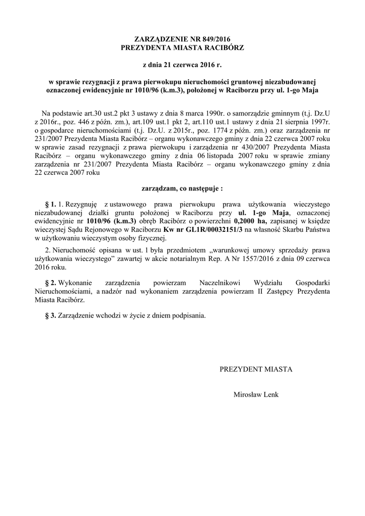 ZARZĄDZENIE NR 849/2016 PREZYDENTA MIASTA RACIBÓRZ z dnia 21 czerwca 2016 r. w sprawie rezygnacji z prawa pierwokupu nieruchomości gruntowej niezabudowanej oznaczonej ewidencyjnie nr 1010/96 (k.m.3), położonej w Raciborzu przy ul. 1-go Maja Na podstawie art.30 ust.2 pkt 3 ustawy z dnia 8 marca 1990r. o samorządzie gminnym (t.j. Dz.U z 2016r., poz. 446 z późn. zm.), art.109 ust.1 pkt 2, art.110 ust.1 ustawy z dnia 21 sierpnia 1997r. o gospodarce nieruchomościami (t.j. Dz.U. z 2015r., poz. 1774 z późn. zm.) oraz zarządzenia nr 231/2007 Prezydenta Miasta Racibórz – organu wykonawczego gminy z dnia 22 czerwca 2007 roku w sprawie zasad rezygnacji z prawa pierwokupu i zarządzenia nr 430/2007 Prezydenta Miasta Racibórz – organu wykonawczego gminy z dnia 06 listopada 2007 roku w sprawie zmiany zarządzenia nr 231/2007 Prezydenta Miasta Racibórz – organu wykonawczego gminy z dnia 22 czerwca 2007 roku zarządzam, co następuje : § 1. 1. Rezygnuję z ustawowego prawa pierwokupu prawa użytkowania wieczystego niezabudowanej działki gruntu położonej w Raciborzu przy ul. 1-go Maja, oznaczonej ewidencyjnie nr 1010/96 (k.m.3) obręb Racibórz o powierzchni 0,2000 ha, zapisanej w księdze wieczystej Sądu Rejonowego w Raciborzu Kw nr GL1R/00032151/3 na własność Skarbu Państwa w użytkowaniu wieczystym osoby fizycznej. 2. Nieruchomość opisana w ust. 1 była przedmiotem „warunkowej umowy sprzedaży prawa użytkowania wieczystego” zawartej w akcie notarialnym Rep. A Nr 1557/2016 z dnia 09 czerwca 2016 roku. § 2. Wykonanie zarządzenia powierzam Naczelnikowi Wydziału Gospodarki Nieruchomościami, a nadzór nad wykonaniem zarządzenia powierzam II Zastępcy Prezydenta Miasta Racibórz. § 3. Zarządzenie wchodzi w życie z dniem podpisania. PREZYDENT MIASTA Mirosław Lenk Uzasadnienie Na podstawie art. 109 ust.1 pkt 2 ustawy z dnia 21 sierpnia 1997r. o gospodarce nieruchomościami (t.j. Dz.U. z 2015r., poz. 1774 z późn. zm.), gminie przysługuje prawo pierwokupu w przypadku sprzedaży prawa użytkowania wieczystego niezabudowanej nieruchomości gruntowej, niezależnie od formy nabycia tego prawa przez zbywcę. W dniu 09 czerwca 2016r. przed notariuszem Barbarą Kulot w jej Kancelarii Notarialnej w Raciborzu przy Placu Dworcowym 16, na mocy aktu notarialnego Rep. A Nr 1557/2016 zawarta została warunkowa umowa sprzedaży prawa użytkowania wieczystego nieruchomości objętej niniejszym zarządzeniem, za łączną cenę brutto 60.000,-zł. (słownie zł: sześćdziesiąt tysięcy), tj. 30,- zł./m2. Zgodnie z zapisami miejscowego planu zagospodarowania przestrzennego miasta Racibórz, obejmującego obszar w jednostce strukturalnej Płonia w Raciborzu, działka nr 1010/96 (k.m.3) obręb Racibórz zlokalizowana jest na terenach zabudowy usługowej oznaczonych symbolem J9U (co stanowi 98,8% powierzchni działki) i terenach dróg wewnętrznych oznaczonych symbolem J5KDW (co stanowi 1,2% powierzchni działki). Biorąc pod uwagę reguły wynikające z przepisów §1 ust.1 pkt 1 i 3 zarządzenia nr 231/2007 Prezydenta Miasta Racibórz – organu wykonawczego gminy z dnia 22 czerwca 2007 roku w sprawie zasad rezygnacji z prawa pierwokupu ze zmianami, nie znaleziono podstaw do skorzystania z przysługującego gminie prawa pierwokupu prawa użytkowania wieczystego nieruchomości opisanej w §1. niniejszego zarządzenia, albowiem cena 1 m2 nieruchomości objętej niniejszym zarządzeniem stanowi więcej niż 50% ceny rynkowej 1 m2 nieruchomości położonej na obszarze miasta Racibórz, a także w miejscowym planie zagospodarowania przestrzennego miasta nie jest przeznaczona na cele publiczne. Wobec powyższego postanowiono jak w sentencji.