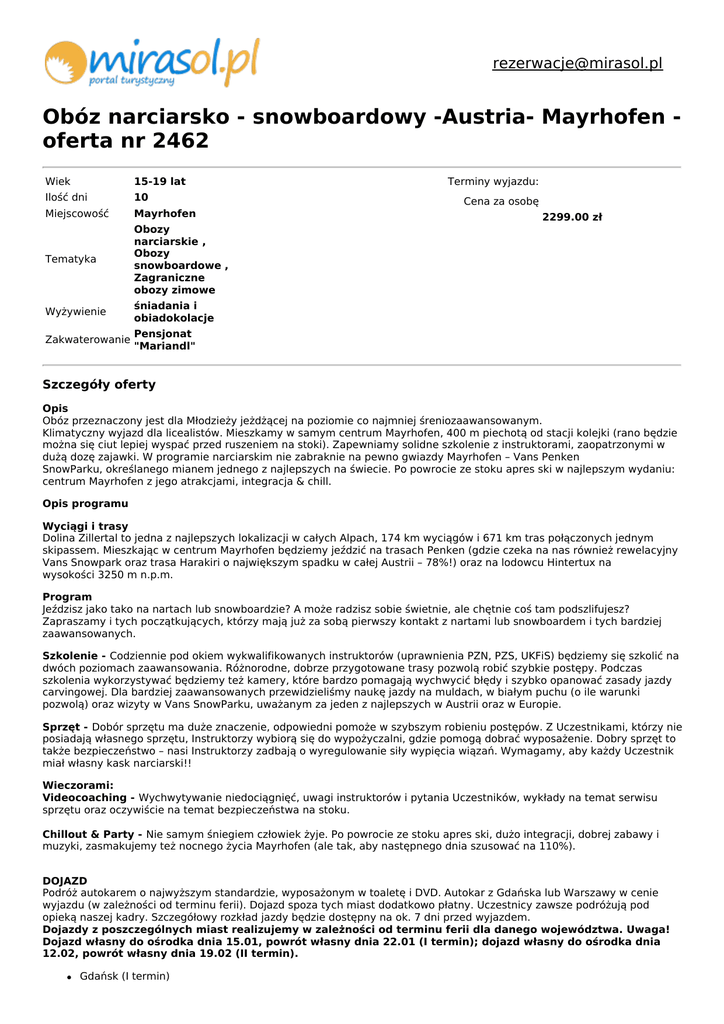 [email protected] Obóz narciarsko - snowboardowy -Austria- Mayrhofen oferta nr 2462 Wiek 15-19 lat Ilość dni 10 Miejscowość Mayrhofen Tematyka Obozy narciarskie , Obozy snowboardowe , Zagraniczne obozy zimowe Wyżywienie śniadania i obiadokolacje Zakwaterowanie Pensjonat "Mariandl" Terminy wyjazdu: Cena za osobę 2299.00 zł Szczegóły oferty Opis Obóz przeznaczony jest dla Młodzieży jeżdżącej na poziomie co najmniej śreniozaawansowanym. Klimatyczny wyjazd dla licealistów. Mieszkamy w samym centrum Mayrhofen, 400 m piechotą od stacji kolejki (rano będzie można się ciut lepiej wyspać przed ruszeniem na stoki). Zapewniamy solidne szkolenie z instruktorami, zaopatrzonymi w dużą dozę zajawki. W programie narciarskim nie zabraknie na pewno gwiazdy Mayrhofen – Vans Penken SnowParku, określanego mianem jednego z najlepszych na świecie. Po powrocie ze stoku apres ski w najlepszym wydaniu: centrum Mayrhofen z jego atrakcjami, integracja & chill. Opis programu Wyciągi i trasy Dolina Zillertal to jedna z najlepszych lokalizacji w całych Alpach, 174 km wyciągów i 671 km tras połączonych jednym skipassem. Mieszkając w centrum Mayrhofen będziemy jeździć na trasach Penken (gdzie czeka na nas również rewelacyjny Vans Snowpark oraz trasa Harakiri o największym spadku w całej Austrii – 78%!) oraz na lodowcu Hintertux na wysokości 3250 m n.p.m. Program Jeździsz jako tako na nartach lub snowboardzie? A może radzisz sobie świetnie, ale chętnie coś tam podszlifujesz? Zapraszamy i tych początkujących, którzy mają już za sobą pierwszy kontakt z nartami lub snowboardem i tych bardziej zaawansowanych. Szkolenie - Codziennie pod okiem wykwalifikowanych instruktorów (uprawnienia PZN, PZS, UKFiS) będziemy się szkolić na dwóch poziomach zaawansowania. Różnorodne, dobrze przygotowane trasy pozwolą robić szybkie postępy. Podczas szkolenia wykorzystywać będziemy też kamery, które bardzo pomagają wychwycić błędy i szybko opanować zasady jazdy carvingowej. Dla bardziej zaawansowanych przewidzieliśmy naukę jazdy na muldach, w białym puchu (o ile warunki pozwolą) oraz wizyty w Vans SnowParku, uważanym za jeden z najlepszych w Austrii oraz w Europie. Sprzęt - Dobór sprzętu ma duże znaczenie, odpowiedni pomoże w szybszym robieniu postępów. Z Uczestnikami, którzy nie posiadają własnego sprzętu, Instruktorzy wybiorą się do wypożyczalni, gdzie pomogą dobrać wyposażenie. Dobry sprzęt to także bezpieczeństwo – nasi Instruktorzy zadbają o wyregulowanie siły wypięcia wiązań. Wymagamy, aby każdy Uczestnik miał własny kask narciarski!! Wieczorami: Videocoaching - Wychwytywanie niedociągnięć, uwagi instruktorów i pytania Uczestników, wykłady na temat serwisu sprzętu oraz oczywiście na temat bezpieczeństwa na stoku. Chillout & Party - Nie samym śniegiem człowiek żyje. Po powrocie ze stoku apres ski, dużo integracji, dobrej zabawy i muzyki, zasmakujemy też nocnego życia Mayrhofen (ale tak, aby następnego dnia szusować na 110%). DOJAZD Podróż autokarem o najwyższym standardzie, wyposażonym w toaletę i DVD. Autokar z Gdańska lub Warszawy w cenie wyjazdu (w zależności od terminu ferii). Dojazd spoza tych miast dodatkowo płatny. Uczestnicy zawsze podróżują pod opieką naszej kadry. Szczegółowy rozkład jazdy będzie dostępny na ok. 7 dni przed wyjazdem. Dojazdy z poszczególnych miast realizujemy w zależności od terminu ferii dla danego województwa. Uwaga! Dojazd własny do ośrodka dnia 15.01, powrót własny dnia 22.01 (I termin); dojazd własny do ośrodka dnia 12.02, powrót własny dnia 19.02 (II termin). Gdańsk (I termin) Katowice (I termin) Łódź (I i II termin) Opole (II termin) Warszawa (II termin) Wrocław (I i II termin) Dojazd własny Wyżywienie HB - 2 posiłki dziennie: śniadanie i obiadokolacja (+ napoje: herbata, woda). Obóz zaczyna się obiadokolacją i kończy śniadaniem. Zapewniamy suchy prowiant na drogę powrotną. Wszystkie posiłki przygotowywane są przez naszych sprawdzonych kucharzy. Pyszne, sycące i rozgrzewające posiłki sprzyjają regenerowaniu sił po powrocie ze stoku. Na stok Uczestnicy otrzymują każdego dnia batonika oraz napój w kartoniku. Cena zawiera: Zakwaterowanie (7 noclegów), wyżywienie (7 x śniadanie, 7 x obiadokolacja), program zajęć, opiekę wychowawców i instruktorów, ubezpieczenie NNW i KL AXA, szkolenie narciarskie lub snowboardowe, dojazd z Gdańska, Łodzi, Warszawy i Wrocławia (w zależności od terminu ferii). Cena nie zawiera: Skipassów, opłaty klimatycznej, kaucji zwrotnej za skipass i apartament, ewentualnych kosztów wypożyczenia sprzętu. Ceny 6-dniowych skipassów: osoby urodzone w latach 1998-2001 - 193,5 € osoby urodzone w latach 2002-2009 - 109 € Inne opłaty obowiązkowe na miejscu (od osoby): opłata klimatyczna - 10,5 € kaucja zwrotna za skipass i apartament - 52 € Co zabrać: KASK - obowiązkowo! ważny dowód osobisty lub paszport oraz kartę EKUZ euro na opłaty na miejscu ważną legitymację szkolną z numerem PESEL poprawnie wypełnioną kartę kolonijną z numerem PESEL czapkę, szalik, dwie pary rękawiczek odzież na różne temperatury oraz odpowiednie obuwie zimowe przybory do mycia i ręcznik mały plecak na wyjścia krem na mróz z filtrem UV sprzęt narciarski lub snowboardowy wskazane ochraniacze na nadgarstki i kolana zalecamy zabranie karty EKUZ z NFZ. Poniżej rady naszych instruktorów odnośnie sprzętu i ubrań narciarskich: rękawiczki narciarskie, ortalionowe, goretex, skórzane - LUŹNE (nigdy wełniane) skarpety narciarskie długie, do kolan bielizna narciarska, termoaktywna sprzęt narciarski - sprawdzony i dobrany przez fachowca, koniecznie kijki narciarskie odpowiedniej długości spodnie narciarskie dobrze osłaniające plecy dobrze dobrane gogle z jasnożółtą szybką Pensjonat Mariandl w Mayrhofen - kameralny pensjonat w dobrym położeniu (400 m do centrum i tyle samo do kolej