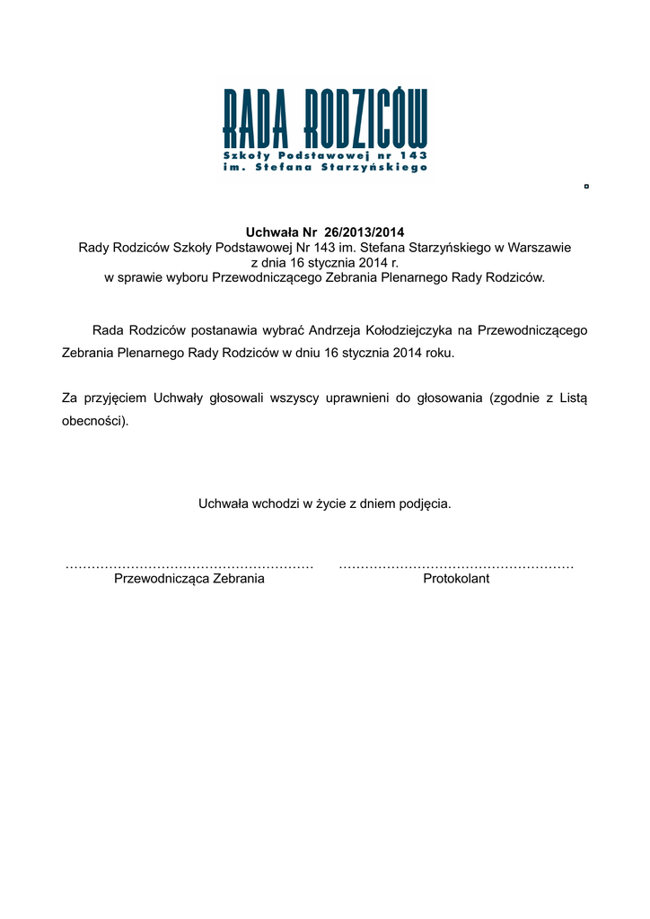 Uchwała Nr 26/2013/2014 Rady Rodziców Szkoły Podstawowej Nr 143 im. Stefana Starzyńskiego w Warszawie z dnia 16 stycznia 2014 r. w sprawie wyboru Przewodniczącego Zebrania Plenarnego Rady Rodziców. Rada Rodziców postanawia wybrać Andrzeja Kołodziejczyka na Przewodniczącego Zebrania Plenarnego Rady Rodziców w dniu 16 stycznia 2014 roku. Za przyjęciem Uchwały głosowali wszyscy uprawnieni do głosowania (zgodnie z Listą obecności). Uchwała wchodzi w życie z dniem podjęcia. ………………………………………………… Przewodnicząca Zebrania ……………………………………………… Protokolant Uchwała Nr 27/2013/2014 Rady Rodziców Szkoły Podstawowej Nr 143 im. Stefana Starzyńskiego w Warszawie z dnia 16 stycznia 2014 r. w sprawie przyjęcia Porządku obrad. Rada Rodziców postanawia przyjąć przedstawiony w Zawiadomieniu o Zebraniu Plenarnym Porządek obrad z uwzględnieniem prośby Pani Eweliny Gorczycy o omówienie punktów 7 i 8 na początku zebrania tj. przed punktem 5 porządku obrad. Za przyjęciem Uchwały głosowali wszyscy uprawnieni do głosowania (zgodnie z Listą obecności). Uchwała wchodzi w życie z dniem podjęcia. ………………………………………………… Przewodnicząca Zebrania ……………………………………………… Protokolant Uchwała Nr 28/2013/2014 Rady Rodziców Szkoły Podstawowej Nr 143 im. Stefana Starzyńskiego w Warszawie z dnia 16 stycznia 2014 r. w sprawie zatwierdzenia Protokołu z poprzedniego Zebrania Plenarnego. Rada Rodziców postanawia zatwierdzić bez uwag Protokół z Zebrania Plenarnego Rady Rodziców Szkoły Podstawowej Nr 143 im. Stefana Starzyńskiego w Warszawie, które odbyło się w dniu 27 listopada 2013 roku. Za przyjęciem Uchwały głosowali wszyscy uprawnieni do głosowania (zgodnie z Listą obecności). Uchwała wchodzi w życie z dniem podjęcia. ………………………………………………… Przewodnicząca Zebrania ……………………………………………… Protokolant Uchwała Nr 29a/2013/2014 Rady Rodziców Szkoły Podstawowej Nr 143 im. Stefana Starzyńskiego w Warszawie z dnia 16 stycznia 2014 r. w sprawie przeznaczenia kwoty 750 zł ze środków Rady Rodziców na zakup dekoracji i akcesoriów niezbędnych do jej przygotowania. Rada Rodziców postanawia przeznaczyć kwotę 750 zł ze środków Rady Rodziców na zakup dekoracji i akcesoriów niezbędnych do jej przygotowania - w kwocie tej przewidziano środki na zakup elektrycznej pompki do pompowania balonów. Za przyjęciem Uchwały głosowali wszyscy uprawnieni do głosowania (zgodnie z Listą obecności). Uchwała wchodzi w życie z dniem podjęcia. ………………………………………………… Przewodnicząca Zebrania ………………………………………………… Protokolant Uchwała Nr 29b/2013/2014 Rady Rodziców Szkoły Podstawowej Nr 143 im. Stefana Starzyńskiego w Warszawie z dnia 16 stycznia 2014 r. w sprawie powierzenia prowadzenia balu karnawałowego firmie zewnętrznej. Rada Rodziców postanawia powierzyć prowadzenia balu karnawałowego w br. szkolnym firmie „Planeta Uśmiechu” prowadzonej przez panią Magdalenę Wycech i przeznaczyć na ten cel kwoty 2 091 zł. Za przyjęciem Uchwały głosowali wszyscy uprawnieni do głosowania (zgodnie z Listą obecności). Uchwała wchodzi w życie z dniem podjęcia. ………………………………………………… Przewodnicząca Zebrania ………………………………………………… Protokolant Uchwała Nr 30/2013/2014 Rady Rodziców Szkoły Podstawowej Nr 143 im. Stefana Starzyńskiego w Warszawie z dnia 16 stycznia 2014 r. w sprawie odwołania ze stanowiska Skarbnika Rady Rodziców Karoliny Andrian. Rada Rodziców postanawia odwołać Karolinę Andrian z funkcji Skarbnika Rady Rodziców cofając jednocześnie udzielone wcześniej upoważnienie do składania oświadczeń w zakresie praw i obowiązków oraz reprezentowania Rady Rodziców. Za przyjęciem Uchwały głosowali wszyscy uprawnieni do głosowania (zgodnie z Listą obecności). Uchwała wchodzi w życie z dniem podjęcia. ………………………………………………… Przewodnicząca Zebrania ………………………………………………… Protokolant Uchwała Nr 31/2013/2014 Rady Rodziców Szkoły Podstawowej Nr 143 im. Stefana Starzyńskiego w Warszawie z dnia 16 stycznia 2014 r. w sprawie wyboru Skarbnika Rady Rodziców w roku szkolnym 2013/2014. Rada Rodziców postanawia wybrać Agnieszkę Biesiadzińską na Skarbnika Rady Rodziców w roku szkolnym 2013/2014 utrzymując w mocy udzielone wcześniej upoważnienie do składania oświadczeń w zakresie praw i obowiązków oraz reprezentowania Rady Rodziców. Za przyjęciem Uchwały głosowali wszyscy uprawnieni do głosowania (zgodnie z Listą obecności). Uchwała wchodzi w życie z dniem podjęcia. ………………………………………………… Przewodnicząca Zebrania ………………………………………………… Protokolant Uchwała Nr 32/2013/2014 Rady Rodziców Szkoły Podstawowej Nr 143 im. Stefana Starzyńskiego w Warszawie z dnia 16 stycznia 2014 r. w sprawie odwołania ze stanowiska Sekretarza Rady Rodziców Agnieszki Biesiadzińskiej. Rada Rodziców postanawia odwołać Agnieszkę Biesiadzińską z funkcji Sekretarza Rady Rodziców (w związku z wyborem na stanowisko Skarbnika Rady Rodziców). Za przyjęciem Uchwały głosowali wszyscy uprawnieni do głosowania (zgodnie z Listą obecności). Uchwała wchodzi w życie z dniem podjęcia. ………………………………………………… Przewodnicząca Zebrania ………………………………………………… Protokolant Uchwała Nr 33/2013/2014 Rady Rodziców Szkoły Podstawowej Nr 143 im. Stefana Starzyńskiego w Warszawie z dnia 16 stycznia 2014 r. w sprawie wyboru Sekretarza Rady Rodziców w roku szkolnym 2013/2014. Rada Rodziców postanawia w