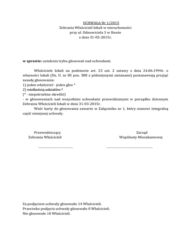 UCHWAŁA Nr 1/2015 Zebrania Właścicieli lokali w nieruchomości przy ul. Odnowiciela 3 w Iławie z dnia 31-03-2015r. w sprawie: ustalenia trybu głosowań nad uchwałami. Właściciele lokali na podstawie art. 23 ust. 2 ustawy z dnia 24.06.1994r. o własności lokali (Dz. U. nr 85 poz. 388 z późniejszymi zmianami) postanawiają przyjąć zasadę głosowania: 1) jeden właściciel - jeden głos * 2) wielkością udziałów * (* - niepotrzebne skreślić) - w głosowaniach nad wszystkimi uchwałami przewidzianymi w porządku dziennym Zebrania Właścicieli lokali w dniu 31-03-2015r. Wzór karty do głosowania zawarto w Załączniku nr 1, który stanowi integralną część niniejszej uchwały. Przewodniczący Zebrania Właścicieli ……………………………… Zarząd Wspólnoty Mieszkaniowej ………………………………………… Za podjęciem uchwały głosowało 14 Właścicieli. Przeciwko podjęciu uchwały głosowało 0 Właścicieli. Nie głosowało 10 Właścicieli. UCHWAŁA Nr 2/2015 Zebrania Właścicieli lokali w nieruchomości przy ul. Odnowiciela 3 w Iławie z dnia 31-03-2015r. w sprawie: udzielenia absolutorium Zarządowi Wspólnoty Mieszkaniowej „Odnowiciela 3” za okres 01.01.2014 – 31.12.2014. Właściciele lokali na podstawie art. 30 ust. 2 pkt ustawy z dnia 24.06.1994r. o własności lokali (Dz. U. nr 85 poz. 388 z późniejszymi zmianami) postanawiają : udzielić absolutorium Prezesowi Zarządu Romanowi Koniczowi za okres 01.01.2014 – 31.12.2014r. Przewodniczący Zebrania Właścicieli ………………………………………… Za podjęciem uchwały głosowało 14 Właścicieli. Przeciwko podjęciu uchwały głosowało 0 Właścicieli. Nie głosowało 10 Właścicieli. Zarząd Wspólnoty Mieszkaniowej ………………………………………… UCHWAŁA Nr 3/2015 Zebrania Właścicieli lokali w nieruchomości przy ul. Odnowiciela 3 w Iławie z dnia 31-03-2015r. w sprawie: udzielenia absolutorium Zarządowi Wspólnoty Mieszkaniowej „Odnowiciela 3” za okres 01.01.2014 – 31.12.2014. Właściciele lokali na podstawie art. 30 ust. 2 pkt ustawy z dnia 24.06.1994r. o własności lokali (Dz. U. nr 85 poz. 388 z późniejszymi zmianami) postanawiają : udzielić absolutorium V-ce Prezesowi ds. Finansowych Bożenie Bryckiej za okres 01.01.2014 – 31.12.2014r. Przewodniczący Zebrania Właścicieli ……………………………… Za podjęciem uchwały głosowało 14 Właścicieli. Przeciwko podjęciu uchwały głosowało 0 Właścicieli. Nie głosowało 10 Właścicieli. Zarząd Wspólnoty Mieszkaniowej ………………………………………… UCHWAŁA Nr 4/2015 Zebrania Właścicieli lokali w nieruchomości przy ul. Odnowiciela 3 w Iławie z dnia 31-03-2015r. w sprawie: udzielenia absolutorium Zarządowi Wspólnoty Mieszkaniowej „Odnowiciela 3” za okres 01.01.2014 – 31.12.2014. Właściciele lokali na podstawie art. 30 ust. 2 pkt ustawy z dnia 24.06.1994r. o własności lokali (Dz. U. nr 85 poz. 388 z późniejszymi zmianami) postanawiają : udzielić absolutorium Członkowi Zarządu Romanowi Maśkiewiczowi za okres 01.01.2014 – 31.12.2014r. Przewodniczący Zebrania Właścicieli ……………………………… Za podjęciem uchwały głosowało 14 Właścicieli. Przeciwko podjęciu uchwały głosowało 0 Właścicieli. Nie głosowało 10 Właścicieli. Zarząd Wspólnoty Mieszkaniowej ………………………………………… UCHWAŁA Nr 5/2015 Zebrania Właścicieli lokali w nieruchomości przy ul. Odnowiciela 3 w Iławie z dnia 31-03-2015r. w sprawie: planu gospodarczego na 2015r. oraz ustalenia wysokości opłat na pokrycie kosztów zarządzania nieruchomością wspólną w 2015r. Właściciele lokali działając zgodnie z Ustawą o Własności Lokali z dnia 24.06.1994r. (Dz. U. nr 85 poz. 388 z późniejszymi zmianami) postanawiają: 1. Przyjąć do realizacji przedstawiony przez Zarząd projekt planu gospodarczego na 2015r., stanowiący załącznik do niniejszej uchwały, opiewający na kwotę wydatków na cele eksploatacji w wysokości 25.000zł. 2. Ustalić wysokości opłat na pokrycie kosztów eksploatacji oraz zatwierdzić zaliczki na media komunalne dla nieruchomości wspólnej: 1. Zaliczka na opłatę eksploatacyjną (stawka miesięczna za 1m² pow.użyt.): - mieszkanie 1,00 zł - garaż w okresie 01.01.2015 – 31.03.2015 0,60 zł - garaż w okresie 01.04.2015 – 31.12.2015 0,74 zł 2. Opłata dla zarządcy za zarządzanie (stawka miesięczna za 1m² pow.użyt.): 0,60 zł 3. Obsługa konserwatorska (stawka miesięczna za 1m² pow.użyt.): 0,14 .zł 4. Fundusz remontowy (stawka miesięczna za 1m² pow.użyt.): 0,70 zł 5. Zaliczka na opłaty za media komunalne: a. Zaliczka miesięczna na C.O. za 1m² pow.użyt. 2,70 zł b. Zaliczka na podgrzanie C.W. za 1m³ 16,00 zł c. Stawka za zużycie Z.W. za 1m³ 8,22 zł d. Stawka za odpady komunalne od osoby 7,00 zł e. Opłata za licznik od 1 zasobu 1,50 zł f. Opłata za domofon od 1 zasobu 1,00 zł g. Opłata za odczyt liczników od 1 szt. 1,50 zł 3. Stwierdzić, że postanowienia niniejszej uchwały obowiązują z mocą od dnia 01.01.2015r. Przewodniczący Zebrania Właścicieli ……………………………… Za podjęciem uchwały głosowało 13 Właścicieli. Przeciwko podjęciu uchwały głosowało 0 Właścicieli. Nie głosowało 11 Właścicieli. Zarząd Wspólnoty Mieszkaniowej ………………………………………… Wspólnota Mieszkaniowa Odnowiciela 3, Iława ul. Odnowiciela 3 Załącznik Plan gospodarczy na 2015r. w kwestii planowanych wydatków eksploatacyjnych Wyszczególnienie kosztu Opłata za zarządzanie nieruchomością Utrzymanie czystości Obsługa konserwatorska Przeglądy techniczne Ubezpieczenie Pozostałe wydatki eksploatacyjne Razem Pow. mieszkalna Rocznie Ogółem Na 1m^2 8 000,00 zł 7 000,00 zł 2 200,00 zł 500,00 zł 1 100,00 zł 6 200,00 zł 25 000,00 zł 1 183,40 6,76 zł 5,92 zł 1,86 zł 0,42