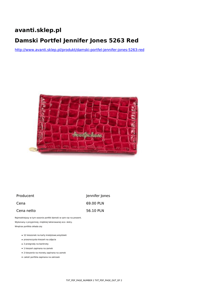 avanti.sklep.pl Damski Portfel Jennifer Jones 5263 Red http://www.avanti.sklep.pl/produkt/damski-portfel-jennifer-jones-5263-red Producent Jennifer Jones Cena 69.00 PLN Cena netto 56.10 PLN Najmodniejszy w tym sezonie portfel damski w sam raz na prezent. Wykonany z przyjemnej, miękkiej lakierowanej eco- skóry. Wnętrze portfela składa się: 12 kieszonek na karty kredytowe,wizytówki przezroczysta kieszeń na zdjęcia 2 przegrody na banknoty 1 kieszeń zapinana na zamek 2 kieszenie na monety zapinana na zamek całość portfela zapinana na zatrzask TXT_PDF_PAGE_NUMBER 1 TXT_PDF_PAGE_OUT_OF 2 WYMIARY: Wysokość - 9,5 cm Szerokość - 15,5 cm Grubość - 4 cm TXT_PDF_PAGE_NUMBER 2 TXT_PDF_PAGE_OUT_OF 2