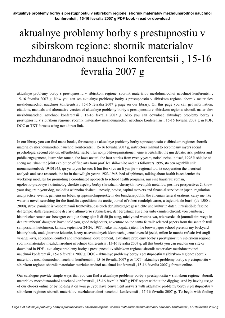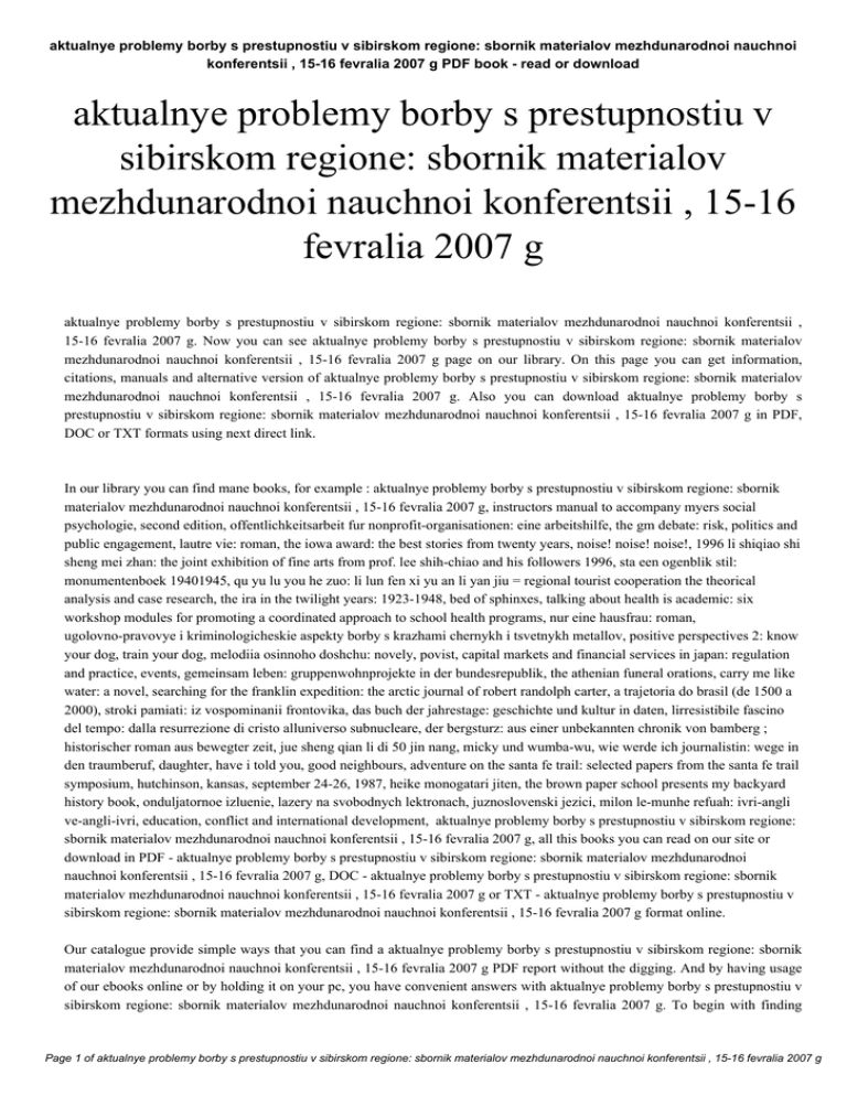 aktualnye problemy borby s prestupnostiu v sibirskom regione: sbornik materialov mezhdunarodnoi nauchnoi konferentsii , 15-16 fevralia 2007 g PDF book - read or download aktualnye problemy borby s prestupnostiu v sibirskom regione: sbornik materialov mezhdunarodnoi nauchnoi konferentsii , 15-16 fevralia 2007 g aktualnye problemy borby s prestupnostiu v sibirskom regione: sbornik materialov mezhdunarodnoi nauchnoi konferentsii , 15-16 fevralia 2007 g. Now you can see aktualnye problemy borby s prestupnostiu v sibirskom regione: sbornik materialov mezhdunarodnoi nauchnoi konferentsii , 15-16 fevralia 2007 g page on our library. On this page you can get information, citations, manuals and alternative version of aktualnye problemy borby s prestupnostiu v sibirskom regione: sbornik materialov mezhdunarodnoi nauchnoi konferentsii , 15-16 fevralia 2007 g. Also you can download aktualnye problemy borby s prestupnostiu v sibirskom regione: sbornik materialov mezhdunarodnoi nauchnoi konferentsii , 15-16 fevralia 2007 g in PDF, DOC or TXT formats using next direct link. In our library you can find mane books, for example : aktualnye problemy borby s prestupnostiu v sibirskom regione: sbornik materialov mezhdunarodnoi nauchnoi konferentsii , 15-16 fevralia 2007 g, instructors manual to accompany myers social psychologie, second edition, offentlichkeitsarbeit fur nonprofit-organisationen: eine arbeitshilfe, the gm debate: risk, politics and public engagement, lautre vie: roman, the iowa award: the best stories from twenty years, noise! noise! noise!, 1996 li shiqiao shi sheng mei zhan: the joint exhibition of fine arts from prof. lee shih-chiao and his followers 1996, sta een ogenblik stil: monumentenboek 19401945, qu yu lu you he zuo: li lun fen xi yu an li yan jiu = regional tourist cooperation the theorical analysis and case research, the ira in the twilight years: 1923-1948, bed of sphinxes, talking about health is academic: six workshop modules for promoting a coordinated approach to school health programs, nur eine hausfrau: roman, ugolovno-pravovye i kriminologicheskie aspekty borby s krazhami chernykh i tsvetnykh metallov, positive perspectives 2: know your dog, train your dog, melodiia osinnoho doshchu: novely, povist, capital markets and financial services in japan: regulation and practice, events, gemeinsam leben: gruppenwohnprojekte in der bundesrepublik, the athenian funeral orations, carry me like water: a novel, searching for the franklin expedition: the arctic journal of robert randolph carter, a trajetoria do brasil (de 1500 a 2000), stroki pamiati: iz vospominanii frontovika, das buch der jahrestage: geschichte und kultur in daten, lirresistibile fascino del tempo: dalla resurrezione di cristo alluniverso subnucleare, der bergsturz: aus einer unbekannten chronik von bamberg ; historischer roman aus bewegter zeit, jue sheng qian li di 50 jin nang, micky und wumba-wu, wie werde ich journalistin: wege in den traumberuf, daughter, have i told you, good neighbours, adventure on the santa fe trail: selected papers from the santa fe trail symposium, hutchinson, kansas, september 24-26, 1987, heike monogatari jiten, the brown paper school presents my backyard history book, onduljatornoe izluenie, lazery na svobodnych lektronach, juznoslovenski jezici, milon le-munhe refuah: ivri-angli ve-angli-ivri, education, conflict and international development, aktualnye problemy borby s prestupnostiu v sibirskom regione: sbornik materialov mezhdunarodnoi nauchnoi konferentsii , 15-16 fevralia 2007 g, all this books you can read on our site or download in PDF - aktualnye problemy borby s prestupnostiu v sibirskom regione: sbornik materialov mezhdunarodnoi nauchnoi konferentsii , 15-16 fevralia 2007 g, DOC - aktualnye problemy borby s prestupnostiu v sibirskom regione: sbornik materialov mezhdunarodnoi nauchnoi konferentsii , 15-16 fevralia 2007 g or TXT - aktualnye problemy borby s prestupnostiu v sibirskom regione: sbornik materialov mezhdunarodnoi nauchnoi konferentsii , 15-16 fevralia 2007 g format online. Our catalogue provide simple ways that you can find a aktualnye problemy borby s prestupnostiu v sibirskom regione: sbornik materialov mezhdunarodnoi nauchnoi konferentsii , 15-16 fevralia 2007 g PDF report without the digging. And by having usage of our ebooks online or by holding it on your pc, you have convenient answers with aktualnye problemy borby s prestupnostiu v sibirskom regione: sbornik materialov mezhdunarodnoi nauchnoi konferentsii , 15-16 fevralia 2007 g. To begin with finding Page 1 of aktualnye problemy borby s prestupnostiu v sibirskom regione: sbornik materialov mezhdunarodnoi nauchnoi konferentsii , 15-16 fevralia 2007 g aktualnye problemy borby s prestupnostiu v sibirskom regione: sbornik materialov mezhdunarodnoi nauchnoi konferentsii , 15-16 fevralia 2007 g PDF book - read or download aktualnye problemy borby s prestupnostiu v sibirskom regione: sbornik materialov mezhdunarodnoi nauchnoi konferentsii , 15-16 fevralia 2007 g, you are to find our website comprehensive aktualnye problemy borby s prestupnostiu v sibirskom regione: sbornik materialov mezhdunarodnoi nauchnoi konferentsii , 15-16 fevralia 2007 g manuals listed. These review site is the biggest of these which have aktualnye problemy borby s prestupnostiu v sibirskom regione: sbornik materialov mezhdunarodnoi nauchnoi konferentsii , 15-16 fevralia 2007 g, literally hundreds of thousands of different products represented. You'll also see that we now have specific sites catered to different product types or categories, niches or brands related to aktualnye problemy borby s prestupnostiu v sibirskom regione: sbornik materialov mezhdunarodnoi nauchnoi konferentsii , 15-16 fevralia 2007 g. So depending on what exactly you are searching, you will be able to choose ebooks aktualnye problemy borby s prestupnostiu v sibirskom regione: sbornik materialov mezhdunarodnoi nauchnoi konferentsii , 15-16 fevralia 2007 g to suit your 