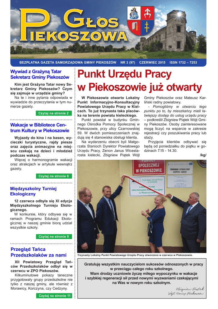 BEZPŁATNA GAZETA SAMORZĄDOWA GMINY PIEKOSZÓW Wywiad z Grażyną Tatar Sekretarz Gminy Piekoszów Kim jest Grażyna Tatar nowy Sekretarz Gminy Piekoszów? Czym się zajmuje w urzędzie gminy? Na te i inne pytania odpowiada w wywiadzie do przeczytania w tym numerze gazety. Czytaj na stronie 2 Wakacje w Bibliotece Centrum Kultury w Piekoszowie Wyjazdy do kina i na basen, wycieczki turystyczne, rajdy piesze oraz zajęcia animacyjne na miejscu czekają na dzieci i młodzież podczas wakacji. Więcej o harmonogramie wakacji oraz atrakcjach w artykule wewnątrz gazety. NR 3 (97) CZERWIEC 2015 ISSN 1732 – 7253 Punkt Urzędu Pracy w Piekoszowie już otwarty W Piekoszowie otwarto Lokalny Punkt Informacyjno-Konsultacyjny Powiatowego Urzędu Pracy w Kielcach. To już trzynasta taka placówka na terenie powiatu kieleckiego. Punkt powstał w budynku Gminnego Ośrodka Pomocy Społecznej w Piekoszowie, przy ulicy Czarnowskiej 59. W dwóch pomieszczeniach znajdują się 4 stanowiska obsługi klienta. Na wydarzeniu obecni byli Małgorzata Stanioch Dyrektor Powiatowego Urzędu Pracy, Zenon Janus Wicestarosta kielecki, Zbigniew Piątek Wójt Gminy Piekoszów oraz Mateusz Karliński radny powiatowy. - Pomogliśmy w otwarciu tego punktu po to, by mieszkańcy mieli łatwiejszy dostęp do usług urzędu pracy – podkreślił Zbigniew Piątek Wójt Gminy Piekoszów. Osoby zainteresowane mogą liczyć na wsparcie w zakresie rejestracji czy poszukiwania pracy lub staży. Przyjęcia klientów odbywać się będą od poniedziałku do piątku w godzinach 7.15 - 14.30. /kg/ Czytaj na stronie 6 Międzyszkolny Turniej Ekologiczny 12 czerwca odbyła się XI edycja Międzyszkolnego Turnieju Ekologicznego. W konkursie, który odbywa się w ramach Programu Edukacji Ekologicznej w naszej gminie biorą udział wszystkie szkoły. Czytaj na stronie 9 Przegląd Tańca Przedszkolaków za nami XII Powiatowy Przegląd Tańców Przedszkolaków odbył się w czerwcu w ZPO Piekoszów. Kilkuminutowe pokazy taneczne przygotowały grupy przedszkolne nie tylko z naszej gminy, ale również z Morawicy, Korczyna, czy Cedzyny. Czytaj na stronie 11 Trzynasty Lokalny Punkt Powiatowego Urzędu Pracy otworzono w czerwcu w Piekoszowie. Gratuluję wszystkim nauczycielom sukcesów odnoszonych w pracy w przeciągu całego roku szkolnego. Wam drodzy uczniowie życzę miłego wypoczynku w wakacje i szybkiej regeneracji sił przed nowymi wyzwaniami czekającymi na Was w nowym roku szkolnym. Zbigniew Piatek ‚ Wójt Gminy Piekoszów 2 INFORMACJE Głos Piekoszowa • nr 3 (97) • CZERWIEC 2015 Urząd ma być przyjazny mieszkańcom Od niedawna Gmina Piekoszów ma nowego Sekretarza. Została nim Grażyna Tatar. *Sprawuje Pani urząd Sekretarza Gminy od niedawna. Proszę po krótce przedstawić się mieszkańcom. - Życie zawodowe od 1990 roku związałam z samorządem gminnym, gdzie przez ponad 8 lat pracowałam na stanowisku naczelnika wydziału budownictwa. Z chwilą utworzenia samorządu powiatowego rozpoczęłam pracę w starostwie powiatowym na stanowisku kierownika wydziału organizacyjno – prawnego. Kolejna moja praca to także praca na stanowisku kierowniczym, tym razem w sądzie. Od grudnia 2006 roku zatrudniona byłam na stanowisku sekretarza gminy. *Czy zdobyte przez lata doświadczenie w pracy w mieście zamierza Pani wykorzystać w pracy w piekoszowskim urzędzie? - Każda gmina bez względu na jej charakter rządzi się tymi samymi prawami, ma te same zdania, różnić się może jedynie ich skalą. Dobre praktyki, czy pomysły, jak najbardziej zamierzam wykorzystać na rzecz mieszkańców Gminy Piekoszów. *Od czego rozpoczyna Pani swoje urzędowanie. Czy są sprawy, które mają dla Pani priorytet? - Urzędowanie rozpoczynam od sprawdzenia potencjału pracowników urzędu, analizy dotychczasowych rozwiązań organizacyjno - prawnych, a także wyznaczenia w tym zakresie nowych kierunków działania tak, aby mieszkańcy dostrzegli pozytywne zmiany, że urząd jest dla nich, a podejmowane działania są z myślą o nich. Tym samym pragnę podkreślić, że Grażyna Tatar pełni funkcję Sekretarza Gminy od kilku tygodni. traktuję pracę w urzędzie jako służbę na rzecz mieszkańców, Pana Wójta, Rady Gminy. *Czy problemy, z którymi boryka się gmina mają bezpośrednie przełożenie na pracę urzędu? - Problemy są zawsze, występują w każdej gminie z różnym natężeniem. Natomiast my – urzędnicy jesteśmy od tego, aby je rozwiązywać. Nie można powiedzieć, że problemy gminy nieoddziaływują na urząd, ponieważ urząd jest częścią gminy, należy jednak zaznaczyć, że dołożymy wszelkich starań, by te problemy przezwyciężyć. *Sekretarz Gminy w szczególności odpowiada za pracę urzędu. Czy planowane są zmiany w jego funkcjonowaniu? - Na pytanie odpowiem pytaniem. Czy dotychczasowe funkcjonowanie urzędu było optymalne dla gminy i jej mieszkańców? Jeśli nie to należy wprowadzić zmiany, których zakres zależy od wielu czynników. Jeśli tak to można nie wprowadzać żadnych zmian. Sadzę jednak, że wkrótce odpowiemy sobie na to pytanie. Dziękuję za rozmowę Andrzej Paździerz Dbajmy o wspólne dobro Wrzucanie do muszli klozetowych trudno rozkładalnych śmieci powoduje awarie systemu kanalizacji, które są nie tylko uciążliwe, ale przede wszystkim drogie. Szanowni Mieszkańcy Gminy Piekoszów, Zakład Usług Komunalnych w Piekoszowie Sp. z o.o. apeluje o zaprzestanie wrzucania wszelkich trudno rozkładalnych śmieci do muszli klozetowych. Pieluchy jednorazowe, podpaski, ręczniki papierowe, odpady z kuchni, chusteczki nawilżane i inne tego typu przedmioty wprowadzone do sieci kanalizacyjnej powodują zapychanie pomp w przepompowniach ścieków, zwiększoną awaryjność tych pomp oraz niedrożność przewodów kanalizacyjnych. Każde takie zdarzenie związane jest z możliwością wydostawania się ścieków ze studzienek kanalizacyjnych oraz koniecznością interwencji pracowników Zakła