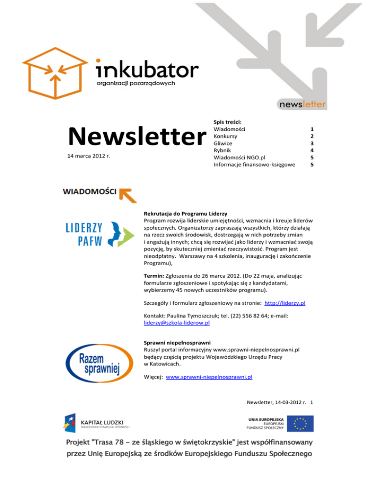 Newsletter 14 marca 2012 r. Spis treści: Wiadomości Konkursy Gliwice Rybnik Wiadomości NGO.pl Informacje finansowo-księgowe 1 2 3 4 5 5 … Rekrutacja do Programu Liderzy Program rozwija liderskie umiejętności, wzmacnia i kreuje liderów społecznych. Organizatorzy zapraszają wszystkich, którzy działają na rzecz swoich środowisk, dostrzegają w nich potrzeby zmian i angażują innych; chcą się rozwijać jako liderzy i wzmacniać swoją pozycję, by skuteczniej zmieniać rzeczywistość. Program jest nieodpłatny. Warszawy na 4 szkolenia, inaugurację i zakończenie Programu), Termin: Zgłoszenia do 26 marca 2012. (Do 22 maja, analizując formularze zgłoszeniowe i spotykając się z kandydatami, wybierzemy 45 nowych uczestników programu). Szczegóły i formularz zgłoszeniowy na stronie: http://liderzy.pl Kontakt: Paulina Tymoszczuk; tel. (22) 556 82 64; e-mail: [email protected] Sprawni niepełnosprawni Ruszył portal informacyjny www.sprawni-niepelnosprawni.pl będący częścią projektu Wojewódzkiego Urzędu Pracy w Katowicach. Więcej: www.sprawni-niepelnosprawni.pl Newsletter, 14-03-2012 r. 1 Zanim przekażesz 1 procent Organizacje charytatywne w Polsce dysponują miliardami złotych. W pierwszej trójce najbogatszych nie znajdziemy jednak WOŚP. Zaskoczenie? Sprawdź, kto znalazł się na pierwszym miejscu czytamy w artykule Agnieszki Pruszkowskiej-Jarosz. Więcej: http://biznes.onet.pl/ranking-najbogatszych-organizacjicharytatywnych-w,18543,5048863,1,news-detal Polsko-ukraińskie warsztaty Pracownia Aktywności Obywatelskiej zaprasza na polsko-ukraińskie warsztaty i własny projekt skierowany do aktywnej młodzieży w wieku 18-25 lat. W ramach programu przewidziano dyskusje uczestników z Polski i Ukrainy o sąsiedztwie – o tym, co dzieli i co łączy. Poprzez kreatywne (czasem nawet szalone…) metody organizatorzy będą starali się uczyć ciekawych sposobów pracy w zespole i metod rozwiązywania konfliktów oraz tego jak tworzyć i rozwijać pomysły na zmianę otaczającej rzeczywistości. Program potrwa do października, a rozpocznie się w maju 2012 warsztatami „Mistrzostwa i olimpiady: ważna gra między polityką, społeczeństwem a biznesem”, które odbędą się na Ukrainie. Szczegóły i formularz zgłoszeniowy na stronie: http://maysternya.org/pl Data: zgłoszenia do 25 marca 2012 Kontakt: [email protected] Więcej: http://pracownia-aktywnosci.bo.pl/ Finansowanie działań ekologicznych NGO Każda organizacja pozarządowa, która ma w swej działalności statutowej działania ekologiczne oraz minimalne doświadczenie może ubiegać się o środki na finansowanie własnych projektów, szczególnie z zakresu edukacji ekologiczne. Zarówno projekty samodzielne, jak i uzupełnienie o tematykę ekologiczną już prowadzonych inicjatyw. NGO, które mają doświadczenie ze współpracy z WFOŚiGW bardzo chwalą sobie te relacje. Zachęcamy do próbowania swoich sił. Więcej: http://www.wfosigw.katowice.pl/nabory_2012.htm Newsletter, 14-03-2012 r. 2 Pomoc wybitnie uzdolnionym uczniom Ministerstwo Edukacji Narodowej ogłosiło otwarty konkurs na realizację zadania publicznego: „Program pomocy wybitnie uzdolnionym uczniom”. Podmioty, które mogą ubiegać się o dotacje: - organizacje pozarządowe; - samorząd terytorialny. Program jest skierowany do uczniów szkół podstawowych, gimnazjów i szkół ponadgimnazjalnych z terenu całej Polski. Celem konkursu jest wyłonienie najkorzystniejszych ofert na realizację ogólnopolskiego lub ponadregionalnego programu pomocy wybitnie uzdolnionym uczniom. Termin składania ofert mija 23 marca 2012 r. Więcej: http://www.bip.men.gov.pl/index.php?option=com_content&view =article&id=1314%3Aogoszenie-o-otwartym-konkursie-na-realizacjzadania-publicznego-program-pomocy-wybitnie-uzdolnionymuczniom&catid=65%3Azadania-publiczne-2012&Itemid=93 >>>… Gliwice. Sprawozdawczość finansowa w NGO Inkubator Trzeciego Sektora – Trasa 78 działający przy GCOP ul. Zwycięstwa 1. Zaprasza na szkolenie „Sprawozdawczość finansowa w NGO”. W dniach 23-24 marca 2012 roku w Gliwickim Centrum Organizacji Pozarządowych odbędzie się bezpłatne szkolenie dla pracowników, członków i wolontariuszy organizacji pozarządowych. Tematyka szkoleń będzie dotyczyła regulacji prawnych dot. sprawozdawczości finansowej w NGO. Zgłoszenia należy nadsyłać do dnia 20.03.2012 do godziny 12.00 na adres mailowy [email protected] z adnotacją w temacie „Szkolenie 23-24.03.2012”. Formularz zgłoszeniowy do pobrania na stronie GCOP www.gcop.gliwice.pl w zakładce Aktualności-Trasa78. Osoby zakwalifikowane na szkolenie powinny przynieść z sobą formularz w wersji drukowanej uzupełniony i potwierdzony przez organizację wysyłającą. Szkolenie jest realizowane w partnerstwie pomiędzy CRIS, Miastem Gliwice (GCOP) oraz Stowarzyszeniem Edukacja przez Internet, a współfinansowany jest ze środków Europejskiego Funduszu Społecznego. Newsletter, 14-03-2012 r. 3 Data: 23.03.2012 godz. 16.00-19.30, 24.03.2012 godz.9.00-16.00 Miejsce: Gliwickie Centrum Organizacji Pozarządowych, ul. Zwycięstwa 1, 44-100 Gliwice. Więcej: www.gcop.gliwice.pl Kontakt: koordynator - Agnieszka Drożdż [email protected] animator - Ilona Rola [email protected] tel. 32 775 01 78 Działaj Lokalnie 2012 Rusza kolejna edycja konkursu grantowego "Działaj Lokalnie". Nabór wniosków będzie prowadzony do 16 kwietnia 2012, do godziny 15.00. Tegoroczny konkurs dotyczy inicjatyw planowanych w gminach powiatu raciborskiego i wodzisławskiego. Więcej: http://www.cris.org.pl/informacje/wszystkie/zobacz/DzialajLokalnie-2012-16 Rybnik. Konkurs w Niewiadomiu i Niedobczycach Mieszkasz w Niewiadomiu lub Niedobczycach? Weź udział w konkursie na najlepszą inicjatywę w swojej dzielnicy. Przyślij nam swój pomysł. Na jego realizację możesz otrzymać 4 000zł! Pomysły można zgłaszać w trzech kategoriach: wydarzenie (np. festyn, koncert, konferencja, debata)