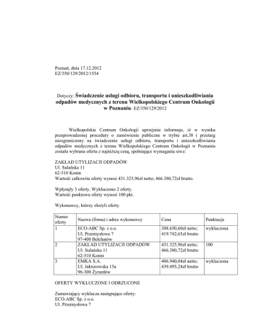 Poznań, dnia 17.12.2012 EZ/350/129/2012/1554 Dotyczy: Świadczenie usługi odbioru, transportu i unieszkodliwiania odpadów medycznych z terenu Wielkopolskiego Centrum Onkologii w Poznaniu- EZ/350/129/2012 Wielkopolskie Centrum Onkologii uprzejmie informuje, iŜ w wyniku przeprowadzonej procedury o zamówienie publiczne w trybie art.38 ( przetarg nieograniczony na świadczenie usługi odbioru, transportu i unieszkodliwiania odpadów medycznych z terenu Wielkopolskiego Centrum Onkologii w Poznaniu została wybrana oferta z najniŜszą ceną, spełniające wymagania siwz: ZAKŁAD UTYLIZACJI ODPADÓW Ul. Sulańska 11 62-510 Konin Wartość całkowita oferty wynosi 431.325,96zł netto; 466.380,72zł brutto. Wpłynęły 3 oferty. Wykluczono 2 oferty. Wartość punktowa oferty wynosi 100 pkt. Wykonawcy, którzy złoŜyli oferty Numer oferty 1 2 3 Nazwa (firma) i adres wykonawcy Cena Punktacja ECO-ABC Sp. z o.o. Ul. Przemysłowa 7 97-400 Bełchatów ZAKŁAD UTYLIZACJI ODPADÓW Ul. Sulańska 11 62-510 Konin EMKA S.A. Ul. Jaktorowska 15a 96-300 śyrardów 388.650,60zł netto; 419.742,65zł brutto wykluczona 431.325,96zł netto; 466.380,72zł brutto 100 406.940,04zł netto; 439.495,24zł brutto wykluczona OFERTY WYKLUCZONE I ODRZUCONE Zamawiający wyklucza następujące oferty: ECO-ABC Sp. z o.o. Ul. Przemysłowa 7 97-400 Bełchatów Oraz EMKA S.A. Ul. Jaktorowska 15a 96-300 śyrardów. W Specyfikacji Istotnych Warunków Zamówienia zawarto w punkcie III „Szczegółowy opis przedmiotu zamówienia, który mówi iŜ: „ Wykonanie usługi nastąpi zgodnie z obowiązującymi przepisami w tym zakresie. Oferent musi bezwzględnie spełniać warunki dotyczące odległości miejsca unieszkodliwiania odpadów medycznych od miejsca ich powstawania”. Zgodnie z zapisami Ustawy o odpadach (Dz.U. z 2010 r. nr 185, poz. 1243 art. 9, pkt.1,2,3,3a,4,5 oraz art.69 a pkt. 1,2. ( treść poniŜej). „Art. 9. 1. Odpady powinny być w pierwszej kolejności poddawane odzyskowi lub unieszkodliwiane w miejscu ich powstawania. 2. Odpady, które nie mogą być poddane odzyskowi lub unieszkodliwiane w miejscu ich powstawania, powinny być, uwzględniając najlepszą dostępną technikę lub technologię, o której mowa w art. 143 ustawy z dnia 27 kwietnia 2001 r. – Prawo ochrony środowiska, przekazywane do najbliŜej połoŜonych miejsc, w których mogą być poddane odzyskowi lub unieszkodliwione. 3. Zakazuje się stosowania komunalnych osadów ściekowych poza obszarem województwa, na którym zostały wytworzone, z zastrzeŜeniem ust. 4. 3a. Zakazuje się przywozu na obszar województwa, w celu stosowania komunalnych osadów ściekowych, wytworzonych poza obszarem tego województwa, z za-strzeŜeniem ust. 4. 4. Komunalne osady ściekowe mogą być stosowane na obszarze województwa innego niŜ te, na którym zostały wytworzone, jeŜeli odległość od miejsca wytwarzania osadów do miejsca stosowania jest mniejsza niŜ odległość do miejsca stosowania połoŜonego na obszarze tego samego województwa. 4a. (uchylony). 5. Przepisy ust. 3, 3a i 4 stosuje się odpowiednio do unieszkodliwiania odpadów medycznych o właściwościach zakaźnych, zwanych dalej „zakaźnymi odpadami medycznymi”, oraz do unieszkodliwiania odpadów weterynaryjnych o właściwościach zakaźnych, zwanych dalej „zakaźnymi odpadami weterynaryjnymi”. Art. 69a. 1. Kto: 1) przekazuje do odzysku lub unieszkodliwienia niesegregowane odpady komunalne, pozostałości z sortowania odpadów komunalnych lub komunalne osady ściekowe, niezgodnie z art. 9 ust. 3–4 lub 2) poddaje odzyskowi lub unieszkodliwianiu niesegregowane odpady komunalne, pozostałości z sortowania odpadów komunalnych lub komunalne osady ściekowe niezgodnie z art. 9 ust. 3–4, podlega karze aresztu albo grzywny. 2. Tej samej karze podlega ten, kto unieszkodliwia zakaźne odpady medyczne lub zakaźne odpady weterynaryjne poza obszarem województw, o których mowa w ust. 1.”. Wykonawcy nie spełniają warunków Specyfikacji i podlegają wykluczeniu. Zestawienie odległości umiejscowienia poszczególnych instalacji do unieszkodliwiania odpadów a miejscem ich powstawania w Poznaniu: Oferta nr 1 – ECO – ABC sp. z o.o. – instalacje mieszczą się poza województwem wielkopolskim Poznań – Bełchatów – 220,96 km Poznań – Milicz – 109,53 km Oferta nr 3 EMKA S.A.- instalacje mieszczą się poza województwem wielkopolskim Poznań – Ostrołęka - 349,59 km Poznań – Chojnice – 162,65 km Poznań – Tczew – 244,32 km Miejsca unieszkodliwiania odpadów nie spełniają warunków odległości od miejsca ich powstawania. Dodatkowo: 1. Oferta nr 1 - ECO – ABC Sp. z o.o. – Decyzja Marszałka Województwa Dolnośląskiego Nr P 27.1/2010 z dnia 5 listopada 2010 r. dotycząca instalacji do termicznego unieszkodliwiania odpadów medycznych mieszczącej się w 56 – 300 Milicz ul. Grzybowa 1, pkt. I.1, Tabela Nr 2 „Rodzaje i ilości odpadów dopuszczonych do unieszkodliwiania w procesie D10 w instalacji do termicznego unieszkodliwiania odpadów” L.p. 4 – 18 01 08 * leki cytotoksyczne i cytostatyczne, kolumna nr 4 – ilość odpadów (Mg/rok) wynosi 1,0 Mg i jest niezgodna z SIWZ, w której Zamawiający określił potrzebę rocznego unieszkodliwiania tego odpadu w ilości 10 000 kg tj. 10 Mg/rocznie. Jak równieŜ wskazano powyŜej instalacja mieszcząca się w Miliczu nie spełnia warunków odległości od miejsca powstawania odpadów. 2. Oferta nr 3 – EMKA S.A. - Decyzja Marszałka Województwa Mazowieckiego Nr 389/12/PŚ.O z dnia 12 lipca 2012 r. dotycząca instalacji mieszczącej się w Ostrołęce przy ul. Jana Pawła II 120A. Pkt.7 „Rodzaje i ilości odpadów dopuszczonych do unieszkodliwiania w ciągu roku”, poz.9 – 18 01 08* leki cytotoksyczne i cytostatyczne, ilość Mg/rok wynosi 1,0 Mg. Ponadto jak wskazano w punkcie 1 instalacja w Ostrołęce nie spełnia kryteriów odległości od miejsca powstawania odpadów. - Decyzja Marszał