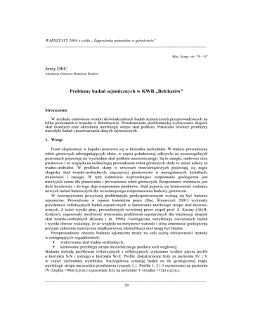 WARSZTATY 2004 z cyklu „Zagrożenia naturalne w górnictwie” ____________________________________________________________________________ Mat. Symp. str. 79 – 87 Jerzy DEC Akademia Górniczo-Hutnicza, Kraków Problemy badań sejsmicznych w KWB „Bełchatów” Streszczenie W artykule omówiono wyniki doświadczalnych badań sejsmicznych przeprowadzonych na kilku poziomach w kopalni w Bełchatowie. Przedstawiono problematykę wykrywania skupisk skał twardych oraz określania morfologii stropu skał podłoża. Pokazano również problemy metodyki badań i przetwarzania danych sejsmicznych. 1. Wstęp Front eksploatacji w kopalni przesuwa się w kierunku zachodnim. W trakcie prowadzenia robót górniczych udostępniających złoże, w części południowej odkrywki na poszczególnych poziomach pojawiają się wychodnie skał podłoża mezozoicznego. Są to margle, mułowce oraz piaskowce i ze względu na technologię prowadzenia robót górniczych skały te uznać należy za trudno-urabialne. W profilach skarp w utworach trzeciorzędowych pojawiają się nagle skupiska skał twardo-urabialnych, najczęściej piaskowców o nieregularnych kształtach, miąższości i zasięgu. W tym kontekście wyprzedzające rozpoznanie geologiczne jest niezwykle cenne dla planowania i prowadzenia robót górniczych. Rozpoznanie wiertnicze jest dość kosztowne i do tego daje rozpoznanie punktowe. Stąd pojawia się konieczność szukania nowych metod badawczych dla wcześniejszego rozpoznawania budowy górotworu. W rozwiązywaniu powyższej problematyki predysponowanymi wydają się być badania sejsmiczne. Prowadzone w rejonie konińskim prace (Dec, Ślusarczyk 2001) wykazały przydatność refleksyjnych badań sejsmicznych w kartowaniu morfologii stropu skał mezozoicznych. Z kolei wyniki prac, prowadzonych wcześniej przez zespół prof. Z. Kasiny (AGH, Kraków), sugerowały możliwość stosowania profilowań sejsmicznych dla lokalizacji skupisk skał twardo-urabialnych (Kasina i in. 1996). Geologiczna weryfikacja ówczesnych badań i wyniki obecne wskazują, że ze względu na nietypowe warunki i silną zmienność geologiczną przyjęte założenia teoretyczne prędkościowej identyfikacji skał mogą być błędne. Przeprowadzone obecnie badania sejsmiczne miały na celu ocenę efektywności metody w następujących zagadnieniach: wykrywanie skał trudno-urabialnych, kartowanie przebiegu stropu mezozoicznego podłoża serii węglowej. Badania metodą profilowań refrakcyjnych i refleksyjnych wykonano wzdłuż pięciu profili o kierunku S-N i jednego o kierunku W-E. Profile zlokalizowane były na poziomie IV i V w części zachodniej wyrobiska. Szczegółową sytuację badań na tle geologicznej mapy morfologii stropu mezozoiku przedstawia rysunek 1.1. Profile 1, 2 i 3 usytuowano na poziomie IV (rzędna +96m n.p.m.) a pozostałe trzy na poziomie V (rzędna +72m n.p.m.). ____________________________________________________________________________ 79 J. DEC – Problemy badań sejsmicznych w KWB „Bełchatów” ____________________________________________________________________________ Dzięki współpracy z Działem Geologii KWB Bełchatów wyniki badań dowiązane zostały do szczegółowych przekrojów geologicznych sporządzonych w odsłoniętych przez koparkę profilach skarp na poszczególnych poziomach. Przekroje te pokazują bardzo skomplikowaną, silnie i szybko zmienną budowę geologiczną wzdłuż linii profilowań geofizycznych poniżej poziomów badań. W przekrojach widoczne są silne zmiany poziome facji, wąsko-promienne struktury fałdowe z zaburzonym układem warstw, aż do występowania form warstw stojących. Na podstawie trzech wybranych pojedynczych przekrojów skarp (wg Skórzak 2003) sporządzono wzdłuż linii A-A’’ przekrój zbiorczy, który przedstawia skomplikowaną budowę górotworu w rejonie badań pomiędzy poziomem VI a poziomem IV (rys. 1.2). Uświadamia on, że rzeczywisty model górotworu dalece odbiega od sejsmicznego modelu ośrodka warstwowego, nawet zaburzonego. Partia górotworu, która w klasycznych refleksyjnych badaniach sejsmicznych jest pomijana, a uwzględniana jedynie we wprowadzanych poprawkach, w tym przypadku stała się przedmiotem badań. Brak ciągłych i wolnozmiennych horyzontów może w istotny sposób utrudniać przetwarzanie danych (statyka, analizy prędkości). Natomiast silna zmienność pozioma litologii powodować będzie istotne zmiany prędkości na drodze fali sejsmicznej, co w konsekwencji zaburzy korelację sygnałów odbitych od wspólnego punktu (CDP) a dalej korelację fazową zapisu sejsmicznego. Rys. 1.1. Mapa stropu podłoża w rejonie badań (wg Skórzak 2003) i lokalizacja profili sejsmicznych w KWB „Bełchatów” Fig. 1.1. Map of the top of Mesozoic basement (Skórzak 2003) and seismic profiles location in „Bełchatów” mine ____________________________________________________________________________ 80 WARSZTATY 2004 z cyklu „Zagrożenia naturalne w górnictwie” ____________________________________________________________________________ Natomiast w badaniach refrakcyjnych duża zmienność przebiegu granic pod powierzchnią terenu może powodować niejednoznaczności interpretacji, tzn. różne granice geologiczne interpretowane są jako jedna granica sejsmiczna. Fala czołowa rozprzestrzeniająca się w utworach o podwyższonej prędkości, w przypadku ich wychodzenia ku powierzchni lub wyklinowania, zmienia swą trajektorię, zamieniając się w falę dyfrakcyjno-refrakcyjną lub prostą, co powoduje osłabienie dynamiki propagującej fali. Pojawiają się problemy z zarejestrowaniem wyraźnych sygnałów o korzystnym stosunku sygnał/zakłócenie. Rys. 1.2. Zbiorczy przekrój geologiczny pomiędzy poziomem VI a poziomem IV w KWB „Bełchatów” Fig. 1.2. Geological cross – section between levels VI and IV in „Bełchatów” mine 2. Obraz falowy w bełchatowskich warunkach geologicznych Prze
