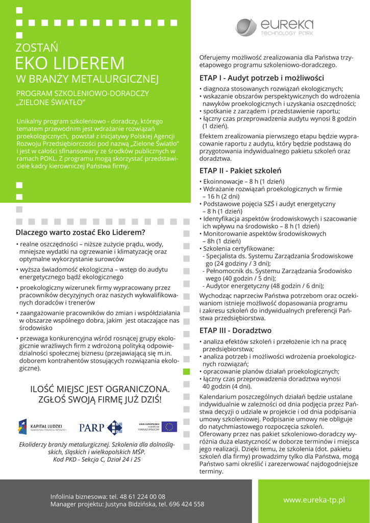 ZOSTAŃ EKO LIDEREM W BRANŻY METALURGICZNEJ Program szkoleniowo-doradczy „Zielone światło” Unikalny program szkoleniowo - doradczy, którego tematem przewodnim jest wdrażanie rozwiązań proekologicznych, powstał z inicjatywy Polskiej Agencji Rozwoju Przedsiębiorczości pod nazwą „Zielone Światło” i jest w całości sfinansowany ze środków publicznych w ramach POKL. Z programu mogą skorzystać przedstawiciele kadry kierowniczej Państwa firmy. Dlaczego warto zostać Eko Liderem? • realne oszczędności – niższe zużycie prądu, wody, mniejsze wydatki na ogrzewanie i klimatyzację oraz optymalne wykorzystanie surowców • wyższa świadomość ekologiczna – wstęp do audytu energetycznego bądź ekologicznego • proekologiczny wizerunek firmy wypracowany przez pracowników decyzyjnych oraz naszych wykwalifikowanych doradców i trenerów • zaangażowanie pracowników do zmian i współdziałania w obszarze wspólnego dobra, jakim jest otaczające nas środowisko • przewaga konkurencyjna wśród rosnącej grupy ekologicznie wrażliwych firm z wdrożoną polityką odpowiedzialności społecznej biznesu (przejawiającą się m.in. doborem kontrahentów stosujących rozwiązania ekologiczne). Ilość miejsc jest ograniczona. Zgłoś swoją Firmę już dziś! Ekoliderzy branży metalurgicznej. Szkolenia dla dolnośląskich, śląskich i wielkopolskich MŚP. Kod PKD - Sekcja C, Dział 24 i 25 Oferujemy możliwość zrealizowania dla Państwa trzyetapowego programu szkoleniowo-doradczego. ETAP I - Audyt potrzeb i możliwości • diagnoza stosowanych rozwiązań ekologicznych; • wskazanie obszarów perspektywicznych do wdrożenia nawyków proekologicznych i uzyskania oszczędności; • spotkanie z zarządem i przedstawienie raportu; • łączny czas przeprowadzenia audytu wynosi 8 godzin (1 dzień). Efektem zrealizowania pierwszego etapu będzie wypracowanie raportu z audytu, który będzie podstawą do przygotowania indywidualnego pakietu szkoleń oraz doradztwa. ETAP II - Pakiet szkoleń • Ekoinnowacje – 8 h (1 dzień) • Wdrażanie rozwiązań proekologicznych w firmie – 16 h (2 dni) • Podstawowe pojęcia SZŚ i audyt energetyczny – 8 h (1 dzień) • Identyfikacja aspektów środowiskowych i szacowanie ich wpływu na środowisko – 8 h (1 dzień) • Monitorowanie aspektów środowiskowych – 8h (1 dzień) • Szkolenia certyfikowane: - Specjalista ds. Systemu Zarządzania Środowiskowe go (24 godziny / 3 dni); - Pełnomocnik ds. Systemu Zarządzania Środowisko wego (40 godzin / 5 dni); - Audytor energetyczny (48 godzin / 6 dni); Wychodząc naprzeciw Państwa potrzebom oraz oczekiwaniom istnieje możliwość dopasowania programu i zakresu szkoleń do indywidualnych preferencji Państwa przedsiębiorstwa. ETAP III - Doradztwo • analiza efektów szkoleń i przełożenie ich na pracę przedsiębiorstwa; • analiza potrzeb i możliwości wdrożenia proekologicznych rozwiązań; • opracowanie planów działań proekologicznych; • łączny czas przeprowadzenia doradztwa wynosi 40 godzin (4 dni). Kalendarium poszczególnych działań będzie ustalane indywidualnie w zależności od dnia podjęcia przez Państwa decyzji o udziale w projekcie i od dnia podpisania umowy szkoleniowej. Podpisanie umowy nie obliguje do natychmiastowego rozpoczęcia szkoleń. Oferowany przez nas pakiet szkoleniowo-doradczy wyróżnia duża elastyczność w doborze terminów i miejsca jego realizacji. Dzięki temu, że szkolenia (dot. pakietu szkoleń dla firmy) prowadzimy tylko dla Państwa, mogą Państwo sami określić i zarezerwować najdogodniejsze terminy. Infolinia biznesowa: tel. 48 61 224 00 08 Manager projektu: Justyna Bidzińska, tel. 696 424 558 www.eureka-tp.pl