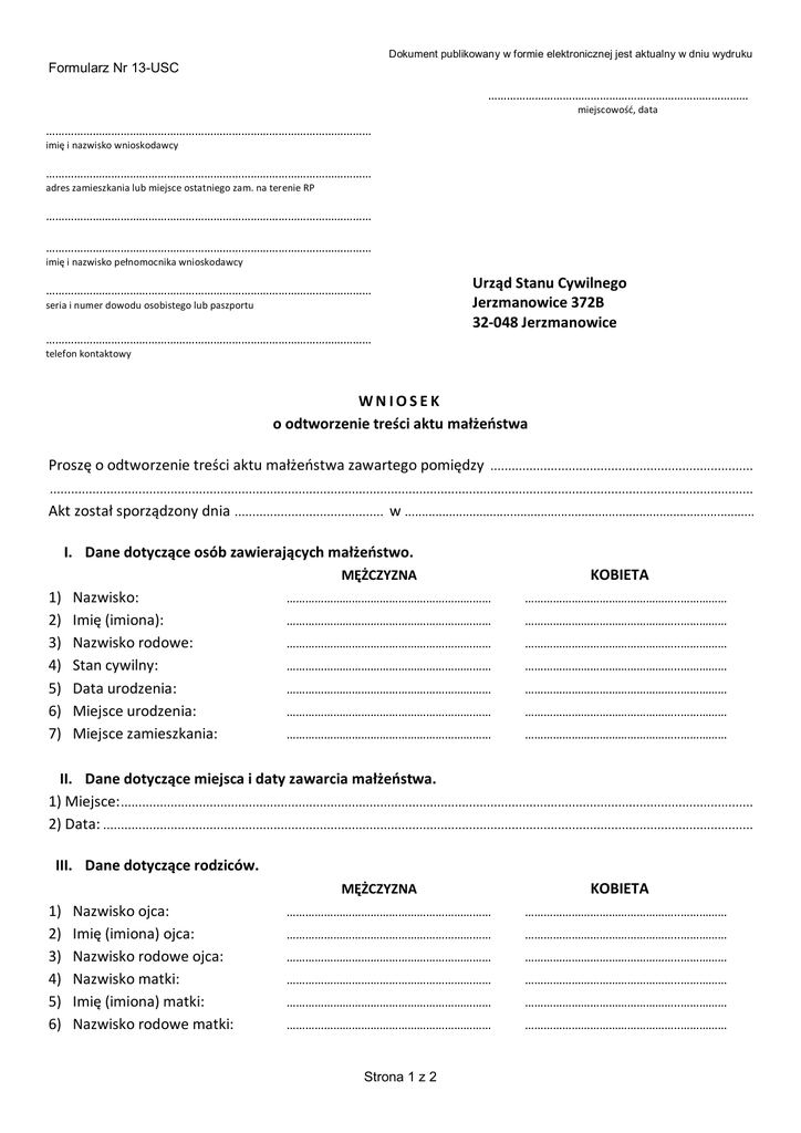 Dokument publikowany w formie elektronicznej jest aktualny w dniu wydruku Formularz Nr 13-USC ………………………………………………………………………… miejscowość, data …………………………………………………………………………………………… imię i nazwisko wnioskodawcy …………………………………………………………………………………………… adres zamieszkania lub miejsce ostatniego zam. na terenie RP …………………………………………………………………………………………… …………………………………………………………………………………………… imię i nazwisko pełnomocnika wnioskodawcy …………………………………………………………………………………………… seria i numer dowodu osobistego lub paszportu Urząd Stanu Cywilnego Jerzmanowice 372B 32-048 Jerzmanowice …………………………………………………………………………………………… telefon kontaktowy WNIOSEK o odtworzenie treści aktu małżeństwa Proszę o odtworzenie treści aktu małżeństwa zawartego pomiędzy .......................................................................... ...................................................................................................................................................................................................... Akt został sporządzony dnia .......................................... w ....................................................................................................... I. Dane dotyczące osób zawierających małżeństwo. MĘŻCZYZNA 1) 2) 3) 4) 5) 6) 7) Nazwisko: Imię (imiona): Nazwisko rodowe: Stan cywilny: Data urodzenia: Miejsce urodzenia: Miejsce zamieszkania: KOBIETA ………………………………………………………… …………………………………………..…………… ………………………………………………………… …………………………………………..…………… ………………………………………………………… …………………………………………..…………… ………………………………………………………… …………………………………………..…………… ………………………………………………………… …………………………………………..…………… ………………………………………………………… …………………………………………..…………… ………………………………………………………… …………………………………………..…………… II. Dane dotyczące miejsca i daty zawarcia małżeństwa. 1) Miejsce: .................................................................................................................................................................................. 2) Data: ....................................................................................................................................................................................... III. Dane dotyczące rodziców. MĘŻCZYZNA 1) 2) 3) 4) 5) 6) Nazwisko ojca: Imię (imiona) ojca: Nazwisko rodowe ojca: Nazwisko matki: Imię (imiona) matki: Nazwisko rodowe matki: KOBIETA ………………………………………………………… …………………………………………..…………… ………………………………………………………… …………………………………………..…………… ………………………………………………………… …………………………………………..…………… ………………………………………………………… …………………………………………..…………… ………………………………………………………… …………………………………………..…………… ………………………………………………………… …………………………………………..…………… Strona 1 z 2 Dokument publikowany w formie elektronicznej jest aktualny w dniu wydruku Formularz Nr 13-USC IV. Nazwiska noszone po zawarciu małżeństwa . 1) Mężczyzna: ............................................................................................................................................................................ 2) Kobieta: .................................................................................................................................................................................. 3) Dzieci: ..................................................................................................................................................................................... V. Dane dotyczące światków obecnych przy zawarciu małżeństwa. 1) Nazwisko i imię (imiona): ................................................................................................................................................... 2) Nazwisko i imię (imiona): ................................................................................................................................................... _________________________________ Sposób odbioru dokumentów: - w siedzibie USC, - na adres innego USC (miejscowość) ................................................................................................................................. - w polskiej placówce dyplomatycznej (miejscowość i kraj) .............................................................................................. ………………………………………………………………………… czytelny podpis wnioskodawcy OŚWIADCZENIE Oświadczam, że odpisu aktu małżeństwa nie posiadam oraz dotychczas nie