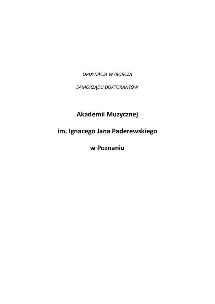 ORDYNACJA WYBORCZA SAMORZĄDU DOKTORANTÓW Akademii Muzycznej im. Ignacego Jana Paderewskiego w Poznaniu §1 Postanowienia ogólne 1. Wybory do organów Samorządu Doktorantów są powszechne, jawne i równe. 2. Czynne prawo wyborcze ma każdy Doktorant Akademii . 3. Bierne prawo wyborcze ma każdy Doktorant Akademii 4. Mandat członka organów Samorządu wygasa na skutek: a) zrzeczenia się mandatu, b) śmierci, c) utraty statusu Doktoranta, d) odwołanie przez organ, który danego członka powołał. 5. W przypadku wygaśnięcia mandatu przeprowadza się wybory uzupełniające. §2 Wybór Przewodniczącego Rady 1. Doktoranci ze swojego grona wybierają Przewodniczącego Rady. 2. Przewodniczącym Rady zostaje osoba, która uzyskała bezwzględną większość ważnie oddanych głosów za jej kandydaturą przy obecności co najmniej połowy Doktorantów. 3. Przewodniczący Rady powołuje Komisarza Wyborczego oraz przeprowadza głosowania w obrębie Doktorantów Akademii Muzycznej w Poznaniu. §3 Wybory Rady 1. Doktoranci spośród swego grona wybierają pozostałych ośmiu członków Rady. 2. Przewodniczący Rady składa Doktorantom swoją propozycję członków Rady. 3. Kandydaci na członków Rady wyrażają pisemną zgodę na swoją kandydaturę. 3. W przypadku nie przegłosowania zgłoszonych przez Przewodniczącego kandydatur, Doktoranci mogą zgłosić inne kandydatury. 4. Każdy z kandydatów na członka Rady musi uzyskać bezwzględną większość ważnie oddanych głosów przy obecności co najmniej połowy Doktorantów. §4 Wybór Komisarza Wyborczego 1. Przewodniczący Rady wybiera spośród Doktorantów Komisarza Wyborczego, który prowadzi. głosowania w obrębie Doktorantów oraz Samorządu Doktorantów Akademii Muzycznej w Poznaniu. 2. Kandydat na Komisarza Wyborczego wyraża zgodę na swoją kandydaturę na piśmie. §5 Wybór Sądu Koleżeńskiego 1. Sąd Koleżeński jest organem posiadającym uprawnienia dyscyplinarne wobec doktorantów Akademii Muzycznej im. Ignacego Jana Paderewskiego w Poznaniu. 2. Członków Sądu Koleżeńskiego wybiera Rada. 3. Kandydaci na członków Sądu Koleżeńskiego wyrażają zgodę na swoją kandydaturę na piśmie. 4. Sąd wybiera ze swojego grona Przewodniczącego Sądu Koleżeńskiego. 5. Do zadań Przewodniczącego Sądu Koleżeńskiego należy organizowanie pracy Sądu Koleżeńskiego, w szczególności wyznaczanie składów orzekających, ich przewodniczących, protokolantów oraz terminów rozpraw. 6. Sąd Koleżeński orzeka: a) w pierwszej instancji w składzie 3-osobowym, b) w drugiej instancji w składzie 6-osobowym. 7. Członek Sądu Koleżeńskiego, który rozpoznawał sprawę w pierwszej instancji, nie może być członkiem składu orzekającego w tej sprawie w drugiej instancji. §6 Wybór Przewodniczącego Zarządu 1. Rada, na pierwszym posiedzeniu, spośród swoich członków wybiera Przewodniczącego Zarządu. 2. Przewodniczącym Zarządu zostaje osoba, która uzyskała bezwzględną większość ważnie oddanych głosów przy obecności co najmniej połowy członków Rady. 3. Kandydat na Przewodniczącego Zarządu wyraża zgodę na swoją kandydaturę na piśmie. §7 Wybory Zarządu 1. Rada, spośród swoich członków wybiera pozostałych dwóch członków Zarządu. 2. Przewodniczący Zarządu składa Radzie propozycję kandydatur na członków Zarządu. 3. W przypadku nie przegłosowania zgłoszonych przez Przewodniczącego kandydatur, Rada może zgłosić inne kandydatury. 4. Każdy z kandydatów na członka Zarządu musi uzyskać bezwzględną większość ważnie oddanych głosów przy obecności co najmniej połowy członków Rady. 5. Każdy kandydat na członka Zarządu wyraża zgodę na swoją kandydaturę na piśmie. §8 Wybory na Wydziałach 1. Na wydziałach przeprowadza się jawne wybory: b) przedstawicieli Doktorantów w Radzie Wydziału, d) na członka Senatu Akademii. 2. W wyborach uczestniczą tylko Doktoranci będący uczestnikami studiów doktoranckich na danym wydziale. 3. Doktoranci wybierają swoich przedstawicieli w Radzie Wydziału w liczbie określonej przez Statut Akademii. 4. Doktoranci wybierają jednego kandydata na członka Senatu Akademii. 5. Wybory są ważne, gdy uczestniczyła w nich większość bezwzględna doktorantów. 6. Wybór kandydatów na członka Senatu Akademii wymaga uzyskania bezwzględnej większości ważnie oddanych głosów wśród Doktorantów. 7. W przypadku nie obsadzenia mandatów w pierwszej turze wyborów, przeprowadza się kolejne głosowania, do momentu obsadzenia wszystkich mandatów.