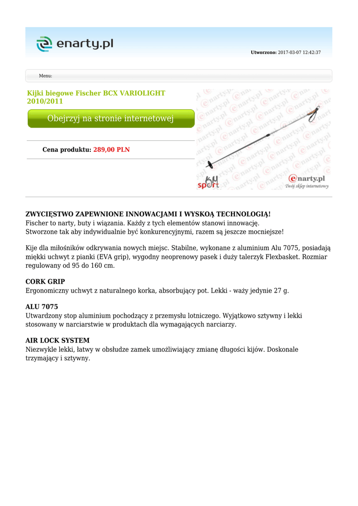 Utworzono: 2017-03-07 12:42:37 Menu: Kijki biegowe Fischer BCX VARIOLIGHT 2010/2011 Obejrzyj na stronie internetowej Cena produktu: 289,00 PLN ZWYCIĘSTWO ZAPEWNIONE INNOWACJAMI I WYSKOĄ TECHNOLOGIĄ! Fischer to narty, buty i wiązania. Każdy z tych elementów stanowi innowację. Stworzone tak aby indywidualnie być konkurencyjnymi, razem są jeszcze mocniejsze! Kije dla miłośników odkrywania nowych miejsc. Stabilne, wykonane z aluminium Alu 7075, posiadają miękki uchwyt z pianki (EVA grip), wygodny neoprenowy pasek i duży talerzyk Flexbasket. Rozmiar regulowany od 95 do 160 cm. CORK GRIP Ergonomiczny uchwyt z naturalnego korka, absorbujący pot. Lekki - waży jedynie 27 g. ALU 7075 Utwardzony stop aluminium pochodzący z przemysłu lotniczego. Wyjątkowo sztywny i lekki stosowany w narciarstwie w produktach dla wymagających narciarzy. AIR LOCK SYSTEM Niezwykle lekki, łatwy w obsłudze zamek umożliwiający zmianę długości kijów. Doskonale trzymający i sztywny. Rodzaj Typ Sezon Męskie BACK COUNTRY 2010/2011 Technologie CORK GRIP, ALU 7075, AIR LOCK SYSTEM Adres: www.erowery.pl [email protected] Adres: www.enarty.pl Telefon: 605 515 185, 34 361 16 71 Email: [email protected] Email: