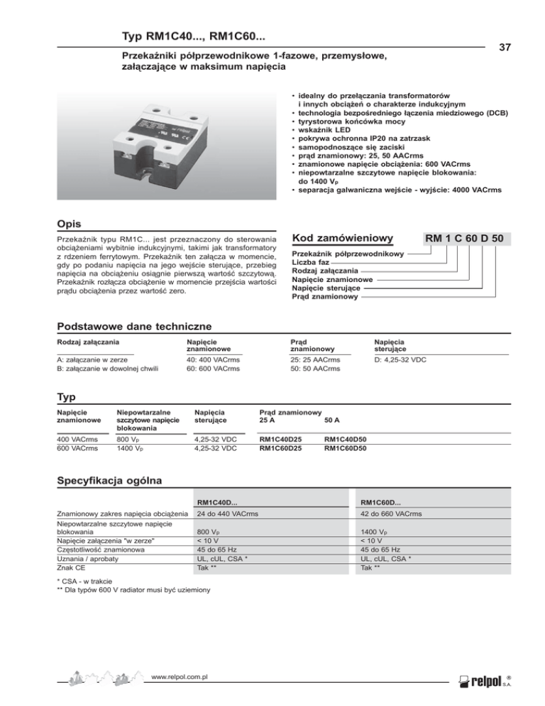 Typ RM1C40..., RM1C60... 37 Przekaźniki półprzewodnikowe 1-fazowe, przemysłowe, załączające w maksimum napięcia • idealny do przełączania transformatorów i innych obciążeń o charakterze indukcyjnym • technologia bezpośredniego łączenia miedziowego (DCB) • tyrystorowa końcówka mocy • wskaźnik LED • pokrywa ochronna IP20 na zatrzask • samopodnoszące się zaciski • prąd znamionowy: 25, 50 AACrms • znamionowe napięcie obciążenia: 600 VACrms • niepowtarzalne szczytowe napięcie blokowania: do 1400 Vp • separacja galwaniczna wejście - wyjście: 4000 VACrms Opis Przekaźnik typu RM1C... jest przeznaczony do sterowania obciążeniami wybitnie indukcyjnymi, takimi jak transformatory z rdzeniem ferrytowym. Przekaźnik ten załącza w momencie, gdy po podaniu napięcia na jego wejście sterujące, przebieg napięcia na obciążeniu osiągnie pierwszą wartość szczytową. Przekaźnik rozłącza obciążenie w momencie przejścia wartości prądu obciążenia przez wartość zero. Kod zamówieniowy RM 1 C 60 D 50 Przekaźnik półprzewodnikowy Liczba faz Rodzaj załączania Napięcie znamionowe Napięcie sterujące Prąd znamionowy Podstawowe dane techniczne Rodzaj załączania Napięcie znamionowe Prąd znamionowy Napięcia sterujące A: załączanie w zerze B: załączanie w dowolnej chwili 40: 400 VACrms 60: 600 VACrms 25: 25 AACrms 50: 50 AACrms D: 4,25-32 VDC Typ Napięcie znamionowe Niepowtarzalne szczytowe napięcie blokowania Napięcia sterujące Prąd znamionowy 25 A 50 A 400 VACrms 600 VACrms 800 Vp 1400 Vp 4,25-32 VDC 4,25-32 VDC RM1C40D25 RM1C60D25 RM1C40D50 RM1C60D50 Specyfikacja ogólna RM1C40D... RM1C60D... Znamionowy zakres napięcia obciążenia 24 do 440 VACrms 42 do 660 VACrms Niepowtarzalne szczytowe napięcie blokowania Napięcie załączenia "w zerze" Częstotliwość znamionowa Uznania / aprobaty Znak CE 800 Vp < 10 V 45 do 65 Hz UL, cUL, CSA * Tak ** 1400 Vp < 10 V 45 do 65 Hz UL, cUL, CSA * Tak ** * CSA - w trakcie ** Dla typów 600 V radiator musi być uziemiony www.relpol.com.pl 38 Typ RM1C40..., RM1C60... Schemat funkcjonalny Wejście sterujące Zakres napięcia sterującego Gwarantowane napięcie załączenia Gwarantowane napięcie wyłączenia 4,25 do 32 VDC 4 VDC 3 VDC Prąd wejściowy przy maksymalnym napięciu wejściowym Czas załączania Czas wyłączania 18 mA 14 ms 10 ms Wejœciowy obwód steruj¹cy Detektor szczytu Wejœcie steruj¹ce Zasilanie Wyjście mocy Znamionowy prąd obciążenia AC1 przy Ta = 25°C AC3 przy Ta = 25°C Minimalny prąd obciążenia Maks. prąd przeciążeniowy przy t=1s Maks. niepowtarzalny prąd chwilowy t=10ms Prąd upływu I2t dla bezpiecznika t=1-10ms Maks. narost prądu dI/dt Spadek napięcia na złączu przy prądzie znamionowym Maks. narost napięcia blokowania dV/dt RM1C...25 RM1C...50 25 Arms 10 Arms 150 mA 55 A 250 Ap < 3 mA < 310 A2s 100 A/µs 50 Arms 20 Arms 150 mA 125 A 600 Ap < 3 mA < 1800 A2s 100 A/µs 1,4 Vrms 2 kV/µs 1,4 Vrms 2 kV/µs Określenie rezystancji termicznej (prąd obciążenia w funkcji temperatury otoczenia) RM1C..25 RM1C..50 Rezystancja termiczna z³¹cze - otoczenie, R th j-a < 20,0 K/W Rezystancja termiczna z³¹cze - otoczenie, R th j-a < 20,0 K/W Rezystancja termiczna z³¹cze - obudowa, R th j-c < 0,80 K/W Rezystancja termiczna z³¹cze - obudowa, R th j-c < 0,50 K/W Rezystancja termiczna obudowa - radiator, R th c-s < 0,20 K/W Rezystancja termiczna obudowa - radiator, R th c-s < 0,20 K/W Maksymalna mo¿liwa temperatura obudowy, e 100 °C Maksymalna mo¿liwa temperatura obudowy, e 100 °C Maksymalna mo¿liwa temperatura z³¹cza, e 125 °C Maksymalna mo¿liwa temperatura z³¹cza, e 125 °C www.relpol.com.pl Typ RM1C40..., RM1C60... Dobór radiatora Aplikacje Porównaj wartość rezystancji termicznej wyznaczonej na podstawie prądu i temperatury pracy przekaźnika, znalezioną w tabeli i dobierz radiator o rezystancji termicznej niższej, najbliższej tej wartości. Radiator Radiator nie wymagany RHS 300 RHS 100 RHS 45A RHS 45B RHS 90 RHS 45A plus wentylator RHS 45B plus wentylator RHS 112 RHS 301 RHS 90 plus wentylator RHS 112 plus wentylator RHS 301 plus wentylator Skontaktuj się ze swoim dystrybutorem Skontaktuj się ze swoim dystrybutorem Rezystancja termiczna Dla mocy rozpraszanej --K/W K/W K/W K/W K/W K/W K/W K/W K/W K/W K/W K/W N/A >0W > 25 W > 60 W > 60 W > 60 W >0W >0W > 100 W > 70 W >0W >0W >0W > 0,25 K/W N/A --- N/A 5,00 3,00 2,70 2,00 1,35 1,25 1,20 1,10 0,80 0,45 0,40 0,25 Napięcie zasilania Napięcie wejścia sterującego Min. 1 okres Powtórne załączenie Minimalny czas możliwy do uzyskania pomiędzy kolejnymi stanami załączenia wyjścia przekaźnika wynosi 20 ms (dla 50 Hz), czyli czas trwania 1 okresu napięcia sieci. około 60 g Noryl GFN 1, czarny Aluminium Przekaźnik Śruba Moment obrotowy Zaciski wejścia sterującego Śruba Moment obrotowy Zaciski wyjściowe mocy Śruba Moment obrotowy Odmierzanie czasu Inicjowanie załączenia / przewodzenia. Napięcie sieci musi być obecne przynajmniej 1 okres przed pojawieniem się wejściowego sygnału sterującego. Napięcie wyjścia mocy Obudowa Waga Materiał obudowy Płytka podstawy 39 Napięcie wejścia sterującego M5 1,5-2,0 Nm M3 x 9 0,5 Nm Zabezpieczenie przed przepięciami Transformatory są urządzeniami stanowiącymi obciążenie typowo indukcyjne, jednak jak każde obciążenie posiadają także składową pojemnościową i czystą rezystancję. Oba rodzaje obciążenia stanowiące składową urojoną impedancji (pojemność i indukcyjność), charakteryzują się zdolnością do magazynowania energii. Dlatego też sterowanie takimi obciążeniami narzuca konieczność zabezpieczania obwodów wyjściowych łączników przed przepięciami poprzez zastosowanie zewnętrznego warystora. Średnica warystora ≤ 20 mm Napięcie warystora dla przekaźnika na napięcie 400 V SSR: 420 VAC (RV 04) Napięcie warystora dla przekaźnika na napięcie 600 V SSR: 625 VAC (RV 06) M5 x 9 2,4 N