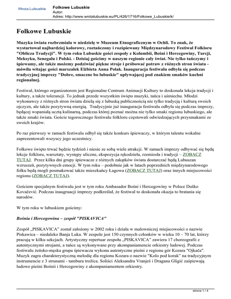 Folkowe Lubuskie Autor: Adres: http://www.wrotalubuskie.eu/PL/426/1716/Folkowe_Lubuskie/k/ Folkowe Lubuskie Muzyka świata rozbrzmiała w niedzielę w Muzeum Etnograficznym w Ochli. To znak, że wystartował najbardziej kolorowy, roztańczony i rozśpiewany Międzynarodowy Festiwal Folkloru "Oblicza Tradycji". W tym roku Lubuskie gości zespoły z Kolumbii, Bośni i Hercegowiny, Turcji, Meksyku, Senegalu i Polski. - Dzisiaj gościmy w naszym regionie cały świat. Nie tylko tańczymy i śpiewamy, ale także możemy podziwiać piękne stroje i próbować potraw z różnych stron świata mówiła witając gości marszałek Elżbieta Anna Polak. Inauguracja festiwalu odbyła się podczas tradycyjnej imprezy "Dobre, smaczne bo lubuskie" upływającej pod znakiem smaków kuchni regionalnej. Festiwal, którego organizatorem jest Regionalne Centrum Animacji Kultury to doskonała lekcja tradycji i kultury, a także tolerancji. To jednak przede wszystkim święto muzyki, tańca i uśmiechu. Młodzi wykonawcy z różnych stron świata dzielą się z lubuską publicznością nie tylko tradycją i kulturą swoich ojczyzn, ale także pozytywną energią. Tradycyjnie już inauguracja festiwalu odbyła się podczas imprezy, będącej wspaniałą ucztą kulinarną, podczas której poznać można nie tylko smaki regionu lubuskiego, ale także smaki świata. Goście tegorocznego festiwalu folkloru częstowali odwiedzających przysmakami ze swoich krajów. Po raz pierwszy w ramach festiwalu odbył się także konkurs śpiewaczy, w którym talentu wokalne zaprezentowali wszyscy jego uczestnicy. Folkowe święto trwać będzie tydzień i niesie ze sobą wiele atrakcji. W ramach imprezy odbywać się będą lekcje folkloru, warsztaty, występy uliczne, ekspozycja rękodzieła, rzemiosła i tradycji – ZOBACZ TUTAJ. Przez kilka dni grupy śpiewacze z różnych zakątków świata dostarczać będą Lubuszan wzruszeń, pozytywnych emocji. W tym roku – podobnie jak w latach poprzednich międzynarodowego folku będą mogli posmakować także mieszkańcy Łagowa (ZOBACZ TUTAJ) oraz innych miejscowości regionu (ZOBACZ TUTAJ). Gościem specjalnym festiwalu jest w tym roku Ambasador Bośni i Hercegowiny w Polsce Duško Kovačević. Podczas inaugruacji imprezy podkreślał, że festiwal to doskonała okazja to bratania się narodów. W tym roku w lubuskiem gościmy: Bośnia i Hercegowina – zespół "PISKAVICA" Zespół „PISKAVICA” został założony w 2002 roku i działa w malowniczej miejscowości o nazwie Piskawica – niedaleko Banja Luka. W zespole jest 150 czynnych członków w wieku 10 – 70 lat, którzy pracują w kilku sekcjach. Artystyczny repertuar zespołu „PISKAVICA” zawiera 17 choreografii z autentycznymi strojami, a tańce są wykonywane przy akompaniamencie orkiestry ludowej. Podczas festiwalu żeńsko-męska grupa śpiewacza wykona autentyczne pieśni z regionu gór Kozara "Ojkača". Muzyk zagra charakterystyczną melodię dla regionu Kozara o nazwie "Kolo pod korak” na tradycyjnym instrumencie z 3 strunami - tambura trožica. Soliści Aleksandra Vranješ i Dragana Gligić zaśpiewają ludowe pieśni Bośnii i Hercegowiny z akompaniamentem orkiestry. strona 1 / 4 Folkowe Lubuskie Autor: Adres: http://www.wrotalubuskie.eu/PL/426/1716/Folkowe_Lubuskie/k/ Kolumbia - zespół "ASOCIACION FOLCLORICA RAICES DE COLOMBIA" Stowarzyszenie "ASOCIACION FOLCLORICA RAICES DE COLOMBIA" powstało w mieście Tunja w czerwcu 1999 roku. Była to decyzja grupy doświadczonych muzyków i tancerzy, którzy postanowili się spotkać i stworzyć zespół, aby ratować i propagować folklor Kolumbii. Podróżowali oni po kraju i za granicą prezentując cenne tradycje zawarte w tańcu, śpiewie i muzyce regionu Boyacca i całej Kolumbii. Te wartości kultywuje główny choreograf zespołu Jose Luis Vega Cassalet. Dąży on poprzez wytrwałą pracę do zachowania folkloru kolumbijskiego i pokazania go wszystkim ludziom. Meksyk – zespół "Conjunto Artístico Saacbé Fuego Nuevo" Zespół „Conjunto Artístico Saacbé Fuego Nuevo” został założony w 2009 roku jako rezultat dużego zainteresowania historią i tradycją Ameryki Łacińskiej Grupa prezentuje tańce i pieśni, które opowiadają o historii Azteków i przybyciu hiszpańskich konkwistadorów. Jej członkami są Meksykanie – dorośli, młodzież oraz dzieci młodsze i starsze. Wkładają oni serca i dusze w swoje prezentacje. Tradycje ludowe i historyczne opowieści wyrażają poprzez pieśni, muzykę, tańce i teatr. Członkowie zespołu systematycznie współpracują z różnymi grupami artystycznymi z Meksyku. Obecnie „SAACBÉ” współpracuje z etnoantropologami, by połączyć stare tradycje i współczesne trendy. Grupa występowała w takich państwach jak: Tajwan, Korea, Kuba, Rosja, Polska i inne. Polska – “Mały Haśnik” Dziecięcy Zespół Regionalny Mały Haśnik został założony jesienią 1998 roku. W jego skład wchodzi ok. 70 uczniów szkoły podstawowej i gimnazjum ze wsi Żabnica, położonej w powiecie żywieckim. Młodych tancerzy łączy wspólna pasja - zamiłowanie do ludowego tańca, śpiewu oraz tradycji i zwyczajów Beskidu Żywieckiego. Kierownictwo zespołu przywiązuje szczególną wagę do pielęgnowania spuścizny ludowej, starając się zachować autentyczność stroju góralskiego oraz wykonywanych tańców i pieśni. W repertuarze zespołu znajdują się ludowe dziecięce zabawy i gry. „Mały Haśnik” prezentuje również bogaty repertuar śpiewu i tańców swojego regionu (obyrtka, koło, koń, siustany i hajduk). W programach zespołu bardzo często wykorzystywane są elementy dawnych zwyczajów i obrzędów. Członkowie zespołu są dumni z tradycji swoich ojców, dlatego podtrzymują wciąż żywe ludowe tradycje. „Mały Haśnik” jest kontynuatorem bogatej tradycji ludowej Beskidu Żywieckiego. Jest to region charakteryzujący się dużą melodyjnością pieśni, różnorodnością tańca,