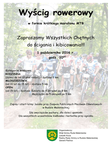 Wyścig rowerowy w formie krótkiego maratonu MTB Zapraszamy Wszystkich Chętnych do ścigania i kibicowania!!! 1 października 2016 r. godz. 1000 Kategorie wiekowe: RODZINNA (dzieci do lat 10 plus rodzic) – dystans 2 km MŁODZIEŻOWA (od 10 lat do 15 lat) – dystans 5 km OPEN (od 15 lat) – dystans: Kobiety do 4 okrążeń po 5 km Mężczyźni do 5 okrążeń po 5 km Zapisy i start lotny: boisko przy Zespole Publicznych Placówek Oświatowych w Rudzie Malenieckiej Dla zwycięzców puchary, dla dzieci upominki Dla wszystkich uczestników kiełbaska i herbatka przy ognisku Organizatorzy: Wójt Gminy Ruda Maleniecka Leszek Kuca Radny Rady Gminy w Rudzie Malenieckiej Gerard Pachuc