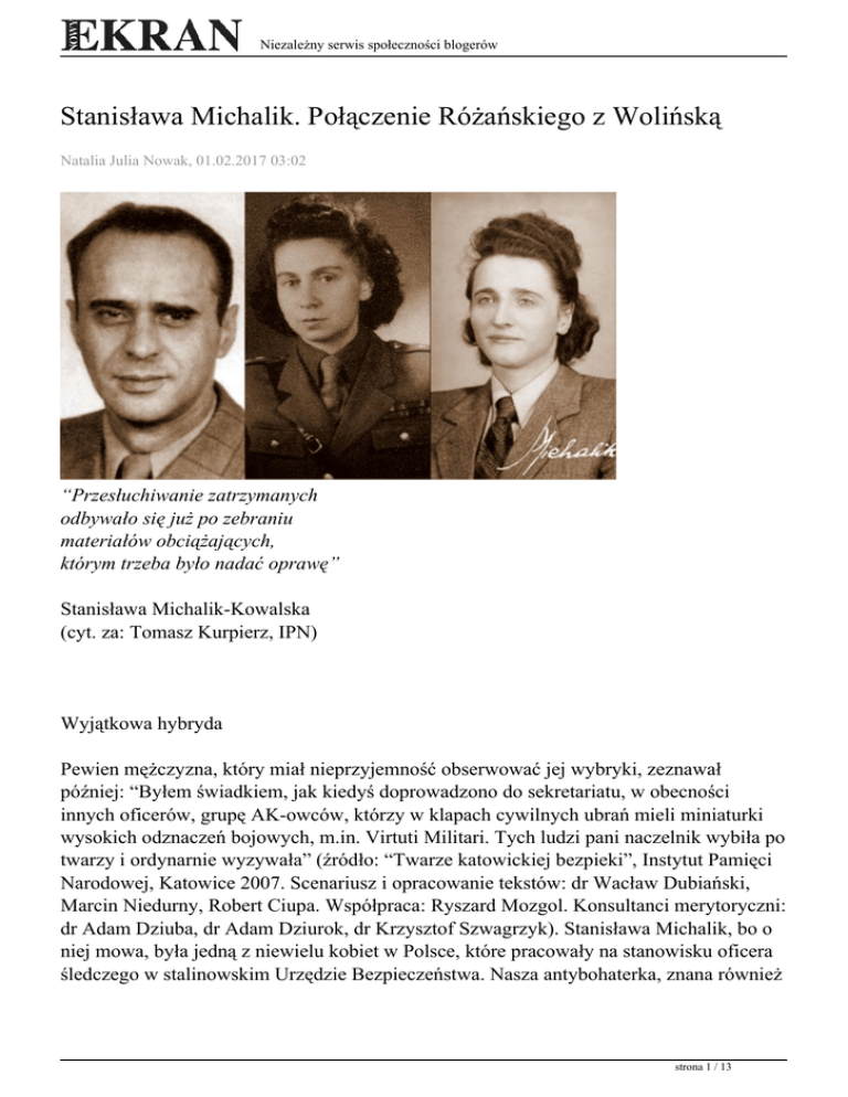 Niezależny serwis społeczności blogerów Stanisława Michalik. Połączenie Różańskiego z Wolińską Natalia Julia Nowak, 01.02.2017 03:02 “Przesłuchiwanie zatrzymanych odbywało się już po zebraniu materiałów obciążających, którym trzeba było nadać oprawę” Stanisława Michalik-Kowalska (cyt. za: Tomasz Kurpierz, IPN) Wyjątkowa hybryda Pewien mężczyzna, który miał nieprzyjemność obserwować jej wybryki, zeznawał później: “Byłem świadkiem, jak kiedyś doprowadzono do sekretariatu, w obecności innych oficerów, grupę AK-owców, którzy w klapach cywilnych ubrań mieli miniaturki wysokich odznaczeń bojowych, m.in. Virtuti Militari. Tych ludzi pani naczelnik wybiła po twarzy i ordynarnie wyzywała” (źródło: “Twarze katowickiej bezpieki”, Instytut Pamięci Narodowej, Katowice 2007. Scenariusz i opracowanie tekstów: dr Wacław Dubiański, Marcin Niedurny, Robert Ciupa. Współpraca: Ryszard Mozgol. Konsultanci merytoryczni: dr Adam Dziuba, dr Adam Dziurok, dr Krzysztof Szwagrzyk). Stanisława Michalik, bo o niej mowa, była jedną z niewielu kobiet w Polsce, które pracowały na stanowisku oficera śledczego w stalinowskim Urzędzie Bezpieczeństwa. Nasza antybohaterka, znana również strona 1 / 13 Niezależny serwis społeczności blogerów jako “Stanisława Michalik-Kowalska” i “Stanisława Kowalska”, nie tylko została oficerem śledczym, ale także dochrapała się funkcji naczelnika Wydziału Śledczego Wojewódzkiego Urzędu Bezpieczeństwa Publicznego w Katowicach. Lecz to tylko część jej przewinień. Gdy zakończyła pracę w ubecji, znalazła zatrudnienie w olsztyńskiej Prokuraturze Wojewódzkiej, gdzie nie zależało jej na rzetelnym prowadzeniu spraw, tylko na imputowaniu winy podejrzanym. Później, jakby nigdy nic, robiła karierę jako radca prawny i adwokat. Oto wyjątkowa hybryda, indywiduum łączące w sobie najgorsze cechy Józefa Różańskiego i Heleny Wolińskiej! Stanisława Michalik - osoba bezwzględna, impulsywna i antyspołeczna - jest postacią mało znaną. Uważam wszakże, iż jej przypadek zasługuje na szczególne nagłośnienie. SPLAMIONY ŻYCIORYS Jedynym, jak dotąd, biogramem obejmującym całe życie Stanisławy Michalik-Kowalskiej jest artykuł Tomasza Kurpierza zatytułowany “Stanisława Kowalska z d. Michalik (1919-1998), naczelnik Wydziału Śledczego WUBP w Katowicach, prokurator Prokuratury Wojewódzkiej w Olsztynie, adwokat”. Materiał wchodzi w skład periodyku “Aparat represji w Polsce Ludowej 1944-1989” (1/2/2005, Rzeszów) wydawanego przez Instytut Pamięci Narodowej - Komisję Ścigania Zbrodni przeciwko Narodowi Polskiemu. Pisząc o Michalik, będę więc się opierać na tym jednym źródle. Funkcjonariuszka UB, o której rozmawiamy, nie posiada notki biograficznej w Wikipedii, nie pamiętają o niej również popularni publicyści historyczni. Dlatego tak cenny jest rocznik naukowy “Aparat represji…”, który można pobrać ze strony internetowej IPN-u (Ipn.gov.pl). Miejmy nadzieję, że to dopiero początek badań nad tym wątkiem peerelowskiej historii. ~*~*~*~*~*~ Zgodnie z ustaleniami Tomasza Kurpierza, Stanisława Michalik wywodziła się ze środowisk socjalistycznych. Urodziła się 19 czerwca 1919 roku w Drohobyczu, a największy wpływ na jej etatystyczny światopogląd wywarł ojczym - Piotr Michalik, członek PPS, z zawodu górnik. Matka Stanisławy, Wiktoria z domu Zając, trudniła się krawiectwem i posiadała, przynajmniej w latach 30. XX wieku, własny zakład krawiecki. W roku 1935 rodzina Michalików przeprowadziła się do Sierszy koło Trzebini. Dwa lata później nasza antybohaterka, ukończywszy siedem klas gimnazjum, przerwała edukację i podjęła pracę w warsztacie swojej matki. Ubóstwo, w jakim żyli Michalikowie, spowodowało, że Stanisława, wzorem swojego ojczyma, przystała do socjalistów. W latach 1935-1936 należała do Organizacji Młodzieży Towarzystwa Uniwersytetu Robotniczego, działała na terenie Sierszy i Gór Luszowskich. Z ruchem socjalistycznym strona 2 / 13 Niezależny serwis społeczności blogerów związali się także jej bracia - Jan i Mieczysław. Gdy armia niemiecka wkroczyła do Polski, przyszła ubeczka kontynuowała działalność polityczną, przez co od końca 1939 roku musiała się ukrywać przed gestapo. Okupanci dopadli Stanisławę jesienią 1941 roku w pobliżu Wielunia, ale aresztantka szybko im uciekła i wyjechała do odległego Sosnowca. Tam przez niecałe dwa lata mieszkała u córki jakiegoś PPS-owca. W lipcu 1943 roku Michalik przeniosła się do Radzionkowa, lecz już miesiąc później wróciła do Sosnowca w obawie przed spodziewaną denuncjacją. W styczniu 1944 roku kobieta ponownie została zatrzymana przez Niemców. Więziono ją w Tarnowskich Górach, Bytomiu i Wadowicach, aż w końcu uwolniono 25 stycznia 1945 roku. Nie wiadomo, kiedy Stanisława Michalik przeobraziła się z socjalistki w komunistkę. Jest pewne, że wstąpiła do PPR niedługo po wyjściu z hitlerowskiej niewoli. W szeregach peerelowskiej partii rządzącej pozostawała aż do końca jej istnienia. Jednakże czas na aktywną działalność partyjną znalazła dopiero po zakończeniu pracy w bezpiece. Tomasz Kurpierz pisze, że Michalik “była m.in. członkiem Wojewódzkiej Komisji Kontroli Partyjnej PZPR w Olsztynie, Wojewódzkiej Komisji Kontrolno-Rewizyjnej KW PZPR w Olsztynie, Komitetu Miejskiego PZPR w Olsztynie, egzekutywy POP przy Wojewódzkiej Radzie Adwokackiej. Pełniła również różne funkcje (m.in. członka Zarządu Powiatowego) w Lidze Kobiet (od 1981 r. w Lidze Kobiet Polskich), była członkiem Zarządu Powiatowego ZBoWiD, w 1980 r. wybrano ją na członka władz wojewódzkich Zrzeszenia Prawników Polskich w Suwałkach”. Za swoją lojalność dostała wiele państwowych odznaczeń. Wróćmy jednak do końcówki II wojny światowej. Już dwa dni po opuszczeniu więzienia Stanisława znalazła z