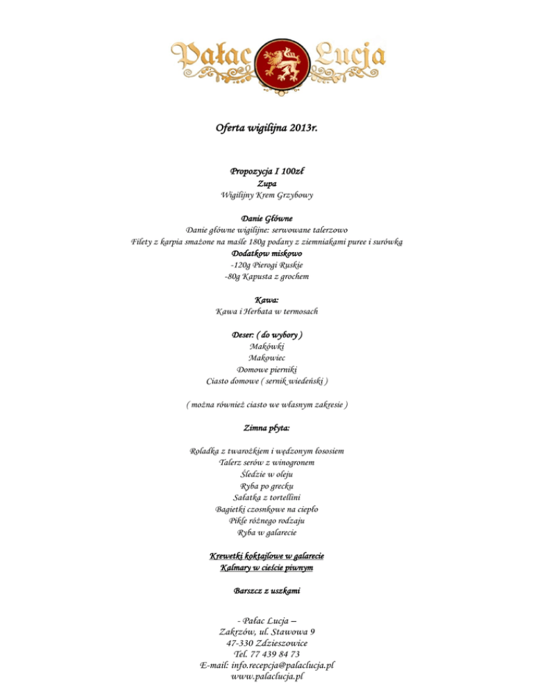Oferta wigilijna 2013r. Propozycja I 100zł Zupa Wigilijny Krem Grzybowy Danie Główne Danie główne wigilijne: serwowane talerzowo Filety z karpia smażone na maśle 180g podany z ziemniakami puree i surówką Dodatkow miskowo -120g Pierogi Ruskie -80g Kapusta z grochem Kawa: Kawa i Herbata w termosach Deser: ( do wybory ) Makówki Makowiec Domowe pierniki Ciasto domowe ( sernik wiedeński ) ( można również ciasto we własnym zakresie ) Zimna płyta: Roladka z twarożkiem i wędzonym łososiem Talerz serów z winogronem Śledzie w oleju Ryba po grecku Sałatka z tortellini Bagietki czosnkowe na ciepło Pikle różnego rodzaju Ryba w galarecie Krewetki koktajlowe w galarecie Kalmary w cieście piwnym Barszcz z uszkami - Pałac Lucja – Zakrzów, ul. Stawowa 9 47-330 Zdzieszowice Tel. 77 439 84 73 E-mail: [email protected] www.palaclucja.pl Propozycja II 70zł/os. Zupa: Barszcz wigilijny z uszkami Danie główne 2,Pstrąg smażony, podany z szaszłykiem ziemniaczano cukiniowym podany na sosie koperkowym Dodatkowo pólmiskowo 80g łazanki postne 120g pierogi z kapustą i grzybami Kawa: Kawa i Herbata w termosach Deser: ( do wybory ) Makówki Makowiec Domowe pierniki Ciasto domowe ( sernik wiedeński ) ( można również ciasto we własnym zakresie ) Zimna płyta: Talerz serów z winogronem Śledzie w oleju Ryba po grecku Pikle różnego rodzaju Sałatka jarzynowa Chleb, masło Kompot z suszonych owoców - Pałac Lucja – Zakrzów, ul. Stawowa 9 47-330 Zdzieszowice Tel. 77 439 84 73 E-mail: [email protected] www.palaclucja.pl Propozycja III 55zł/os. Zupa Wigilijna zupa owocowa Danie główne Filet z mintaja w panierce podany z ziemniaczanym puree i białą kapustą Dodatkowo półmiskowo 100g Kapusta z grzybami Kawa: Kawa i Herbata w termosach Deser: ( do wybory ) Makówki Makowiec Domowe pierniki Ciasto domowe ( sernik wiedeński ) ( można również ciasto we własnym zakresie ) Zimna płyta: Śledzie w oleju Ryba po grecku Pikle różnego rodzaju Sałatka jarzynowa Chleb, masło Napoje: Woda ( 6 zł – 1 l )i sok ( 8 zł 1 L ) w dzbankach Napoje gazowane 3 zł / szt Piwo Lane Lech 0,5 L – 5 zł 0,3 L – 4 zł Tyskie Klasyczne 0,5 L – 5 zł 0,3 L – 4 zł Alkohole: ( można również we własnym zakresie) Wódka Sobieski 0,5 L 35 zł Wódka De luxe, Krupnik 0,5 L 30 zł Wina wytrawne, półwytrawne, słodkie i półsłodkie cena zależy od rodzaju wina. - Pałac Lucja – Zakrzów, ul. Stawowa 9 47-330 Zdzieszowice Tel. 77 439 84 73 E-mail: [email protected] www.palaclucja.pl