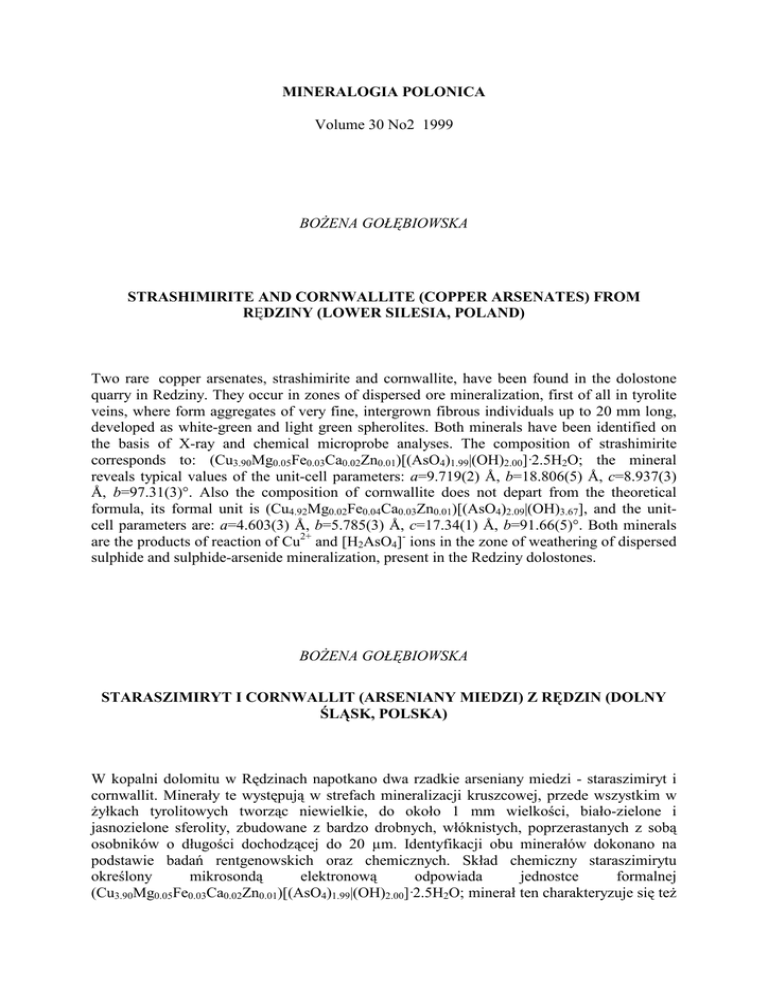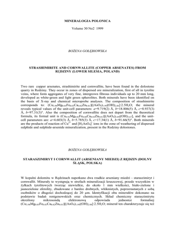 MINERALOGIA POLONICA Volume 30 No2 1999 BOśENA GOŁĘBIOWSKA STRASHIMIRITE AND CORNWALLITE (COPPER ARSENATES) FROM RĘDZINY (LOWER SILESIA, POLAND) Two rare copper arsenates, strashimirite and cornwallite, have been found in the dolostone quarry in Redziny. They occur in zones of dispersed ore mineralization, first of all in tyrolite veins, where form aggregates of very fine, intergrown fibrous individuals up to 20 mm long, developed as white-green and light green spherolites. Both minerals have been identified on the basis of X-ray and chemical microprobe analyses. The composition of strashimirite corresponds to: (Cu3.90Mg0.05Fe0.03Ca0.02Zn0.01)[(AsO4)1.99|(OH)2.00]·2.5H2O; the mineral reveals typical values of the unit-cell parameters: a=9.719(2) Å, b=18.806(5) Å, c=8.937(3) Å, b=97.31(3)°. Also the composition of cornwallite does not depart from the theoretical formula, its formal unit is (Cu4.92Mg0.02Fe0.04Ca0.03Zn0.01)[(AsO4)2.09|(OH)3.67], and the unitcell parameters are: a=4.603(3) Å, b=5.785(3) Å, c=17.34(1) Å, b=91.66(5)°. Both minerals are the products of reaction of Cu2+ and [H2AsO4]- ions in the zone of weathering of dispersed sulphide and sulphide-arsenide mineralization, present in the Redziny dolostones. BOśENA GOŁĘBIOWSKA STARASZIMIRYT I CORNWALLIT (ARSENIANY MIEDZI) Z RĘDZIN (DOLNY ŚLĄSK, POLSKA) W kopalni dolomitu w Rędzinach napotkano dwa rzadkie arseniany miedzi - staraszimiryt i cornwallit. Minerały te występują w strefach mineralizacji kruszcowej, przede wszystkim w Ŝyłkach tyrolitowych tworząc niewielkie, do około 1 mm wielkości, biało-zielone i jasnozielone sferolity, zbudowane z bardzo drobnych, włóknistych, poprzerastanych z sobą osobników o długości dochodzącej do 20 µm. Identyfikacji obu minerałów dokonano na podstawie badań rentgenowskich oraz chemicznych. Skład chemiczny staraszimirytu mikrosondą elektronową odpowiada jednostce formalnej określony (Cu3.90Mg0.05Fe0.03Ca0.02Zn0.01)[(AsO4)1.99|(OH)2.00]·2.5H2O; minerał ten charakteryzuje się teŜ typowymi wartościami stałych sieciowych: a=9.719(2) Å, b=18.806(5) Å, c=8.937(3) Å, b=97.31(3)°. Podobnie cornwallit nie odbiega chemicznie od składu teoretycznego, jego jednostka formalna jest następująca (Cu4.92Mg0.02Fe0.04Ca0.03Zn0.01)[(AsO4)2.09|(OH)3.67], a parametry komórki elementarnej są równe: a=4.603(3) Å, b=5.785(3) Å, c=17.34(1) Å, b=91.66(5)°. Obydwa minerały są produktami reakcji zachodzącej pomiędzy jonami Cu2+ i [H2AsO4]- obecnymi w strefie utleniania rozproszonej mineralizacji siarczkowej i siarczkowoarsenkowej znajdujących się w dolomitach rędzińskich. KRZYSTOF BAHRANOWSKI PILLARED MONTMORILLONITES DOPED WITH CATALYTICALLY ACTIVE TRANSITION METAL IONS PART 1. SYNTHESIS AND PHYSICO-CHEMICAL CHARACTERIZATION The paper summarizes authors’ experience in designing, preparation and characterization of Al., Ti-, and Zn-pillared montmorillonites doped with transition metal elements such as copper and vanadium. Various doping procedures are described and the resulting materials characterized with XRD, nitrogen adsorption studies, chemical analysis, CEC measurements, thermal analysis and ESR. Structural model of the Cu- or V-containing pillared clays are proposed, presenting the textural properties of the samples and location of transition metal dopants within the pillared clay structure. KRZYSTOF BAHRANOWSKI PODPIERANE MONTMORILLONITY DOTOWANE KATALITYCZNIE AKTYWNYMI METALAMI PRZEJŚCIOWYMI CZĘŚĆ 1. SYNTEZA I CHARAKTERYSTYKA FIZYKOCHEMICZNA Praca podsumowuje dorobek autora w zakresie projektowania, preparatyki i charakteryzowania montmorillonitów podpieranych glinem, tytanem i cyrkonem oraz dotowanych miedzią lub wanadem. Opisane zostały róŜnorodne procedury dotowania, a do charakterystyki fizykochemicznej preparatów wykorzystano metodę dyfrakcji rentgenowskiej, adsorpcję azotu, analizę chemiczną, pomiar pojemności wymiany kationów, analizę termiczną i spektroskopię EPR. Zaproponowano strukturalne modele podpieranego montmorillonitu dotowanego miedzią lub wanadem uwzględniające zarówno właściwości teksturalne próbek, jak i lokalizację centrów Cu i V w strukturze podpieranego minerału. KRZYSTOF BAHRANOWSKI PILLARED MONTMORILLONITES DOPED WITH CATALYTICALLY ACTIVE TRANSITION METAL IONS PART 2. CATALYTIC PROPERTIES Versatile catalytic properties of Cu- and V-doped Al.-, Ti-, and Zr-pillared montmorillonite clays are presented and the results related to the physico-chemical properties of the resulting materials. Examples of catalytic reactions include conversion of isopropanol, ammoxidation of m-xylene, selective catalytic reduction of NO with ammonia, oxidative dehydrogenation of propane, hydroxylation of phenol, and oxidation of toluene and xylenes with hydrogen peroxide. KRZYSTOF BAHRANOWSKI PODPIERANE MONTMORILLONITY DOTOWANE KATALITYCZNIE AKTYWNYMI METALAMI PRZEJŚCIOWYMI CZĘŚĆ 2. WŁAŚCIWOŚCI KATALITYCZNE Praca przedstawia róŜnorodne właściwości katalityczne montmorillonitów podpieranych Al, Ti i Zr oraz dotowanych miedzią lub wanadem. Wyniki testów katalitycznych odniesione są do właściwości fizykochemicznych otrzymanych katalizatorów. Przykłady reakcji katalitycznych obejmują konwersję izopropanolu, utleniającą amonolizę m-ksylenu, selektywną katalityczną redukcję NO amoniakiem, utleniające odwodornienie propanu, hydroksylację fenolu oraz utlenianie toluenu i ksylenów nadtlenkiem wodoru. MAREK MUSZYŃSKI, JERZY CZERNY, TADEUSZ LEŚNIAK FOOTWALL ENDOCONTACT ROCK FROM THE DIABASE SILL OF NIEDŹWIEDZIA GÓRA NEAR KRZESZOWICE A new exposure of the endocontact rock was found in the footwall of the diabase sill in Niedźwiedzia Góra near Krzeszowice. The rock reveals the apointersertal texture, fluidal and amygdaloidal structure, and encloses xenoliths derived from the basement of the intrusion. Its essential components include secondary minerals: adular, dolomite, siderite, smectite,