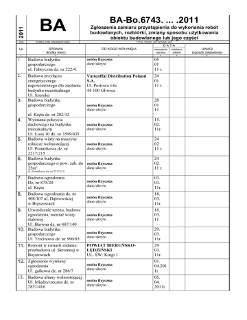 2011 ROK BA BA-Bo.6743. ... .2011 Zgłoszenia zamiaru przystąpienia do wykonania robót budowlanych, rozbiórki, zmiany sposobu użytkowania obiektu budowlanego lub jego części TYTUŁ TECZKI WG WYKAZU AKT SYMBOL KOM. ORGANIZACYJNEJ DATA Lp. SPRAWA (krótka treść) 1. 2. 1. 2. 3. 4. 5. 6. OD KOGO WPŁYNĘŁA wszczęcia sprawy ostatecz. załatw. UWAGI (sposób załatwienia) 3. 4. 5. 6. Budowa budynku gospodarczego ul. Fabryczna dz. nr 222/4. osoba fizyczna dane ukryto 05 01 11 r. Budowa przyłącza energetycznego napowietrznego dla zasilania budynku mieszkalnego Ul. Szeroka Budowa budynku gospodarczego Vattenffal Distribution Poland S.A. Ul. Portowa 14a 44-100 Gliwica 24 01 11 r. ul. Kręta dz. nr 202/32 Wymiana pokrycia dachowego na budynku mieszkalnym Ul. Lisia 10 dz. nr 3599/435 Budowa wiaty na maszyny rolnicze wolnostojącej Ul. Pomnikowa dz. nr 2217/215 Budowa budynku gospodarczego o pow. zab. do 25m2 osoba fizyczna dane ukryto 28 01 11 osoba fizyczna dane ukryto 15. 02. 11r. osoba fizyczna dane ukryto 24 02 11 r. osoba fizyczna dane ukryto 24 02 11 r. ul. Pomnikowa dz. nr 2217/215 7. Budowa ogrodzenia Dz. nr 875/20 ul. Kręta osoba fizyczna dane ukryto 03. 03. 11r. 8. Budowa ogrodzenia dz. nr 408/107 ul. Dąbrowskiej w Bojszowach osoba fizyczna dane ukryto 18. 03. 11r. Utwardzenie terenu, budowa ogrodzenia, montaż wiaty stalowej Ul. Barwna dz. nr 407/140 10. Budowa budynku gospodarczego Ul. Trzcinowa dz. nr 990/85 9. 11. Remont w ramach zadania: przebudowa ul. Skromnej w Bojszowach 12. Zgłoszenie wymiany ogrodzenia Ul. gaikowa dz. nr 286/7 13. Budowa altany wolnostojącej Ul. Międzyrzeczna dz. nr 2851/416 osoba fizyczna dane ukryto 18. 03. 11 osoba fizyczna dane ukryto 29. 03. 11r. POWIAT BIERUŃSKOLĘDZIŃSKI UL. ŚW. Kingi 1 29 03. 11r. osoba fizyczna dane ukryto 01. 04.201 1r. osoba fizyczna dane ukryto 05. 04. 2011r. 2011 ROK BA BA- Bo.6743. ... .2011 Zgłoszenia zamiaru przystąpienia do wykonania robót budowlanych, rozbiórki, zmiany sposobu użytkowania obiektu budowlanego lub jego części TYTUŁ TECZKI WG WYKAZU AKT SYMBOL KOM. ORGANIZACYJNEJ DATA Lp. SPRAWA (krótka treść) OD KOGO WPŁYNĘŁA wszczęcia sprawy ostatecz. załatw. UWAGI (sposób załatwienia) 1. 2. 3. 4. 5. 6. 14. Budowa wiaty wolnostojącej Ul. Chmielna dz. nr 745/64 osoba fizyczna dane ukryto 15. Zgłoszenie rozbiórki budynku gospodarczego Dz. nr 3642/433 ul. Międzyrzeczna Bojszowy 16. Zgłoszenie montażu pompy ciepła Ul. Dąbrowa dz. nr 181/18 osoba fizyczna dane ukryto osoba fizyczna dane ukryto 17. Budowa budynku mieszkalnego jednorodzinnego na dz. nr 1919/335 i 1920/335 przy ul. Międzyrzecznej w Bojszowach osoba fizyczna dane ukryto 18. Budowa przyłącza kanalizacyjnego i wodociągowego ul. Jedlińska 19. Remont budynku gospodarczego na działce nr 96 przy ul. Bratków w Bojszowach 20. Remont odcinka ulicy Gromadzkiej w Bojszowach uszkodzonej w wyniku powodzi w roku 2010 r 21. Remont odcinka ulicy Wałowej w Bojszowach uszkodzonej w wyniku powodzi w roku 2010 r 22. Remont odcinka ulicy Kłosowej w Bojszowach uszkodzonej w wyniku powodzi w roku 2010 r 23. Remont odcinka ulicy Strumykowej w Bojszowach uszkodzonej w wyniku powodzi w roku 2010 r 24. Budowa ogrodu zimowego ul. Społeczna dz. nr 629/14 25. Wymiana pokrycia dachowego w budynku mieszkalnym ul. Barwna dz. nr 484/38 osoba fizyczna dane ukryto 07. 04. 2011 r. 11. 04. 2011r. 15. 04. 2011r . 18. 04. 2011 r. osoba fizyczna dane ukryto 18. 04. 2011 r. Wójt Gminy Bojszowy Ul. Gaikowa 35 43-220 Bojszowy 18. 04. 2011 r. Wójt Gminy Bojszowy Ul. Gaikowa 35 43-220 Bojszowy 18. 04. 2011 r. Wójt Gminy Bojszowy Ul. Gaikowa 35 43-220 Bojszowy 18. 04. 2011 r. Wójt Gminy Bojszowy Ul. Gaikowa 35 43-220 Bojszowy 18. 04. 2011 r. osoba fizyczna dane ukryto 26. 04. 2011r. osoba fizyczna dane ukryto 27. 04. 2011 osoba fizyczna dane ukryto 29. 04. 2011 r. 26. Zgłoszenie wykonania oczyszczalni ul. Rolnicza dz. nr 1186/64 06. 04. 2011 r. 2011 ROK BA BA-Bo.6743. ... .2011 Zgłoszenia zamiaru przystąpienia do wykonania robót budowlanych, rozbiórki, zmiany sposobu użytkowania obiektu budowlanego lub jego części TYTUŁ TECZKI WG WYKAZU AKT SYMBOL KOM. ORGANIZACYJNEJ DATA Lp. SPRAWA (krótka treść) OD KOGO WPŁYNĘŁA wszczęcia sprawy ostatecz. załatw. UWAGI (sposób załatwienia) 1. 2. 3. 4. 5. 6. 27. 28. 29. 30. 31. 32. Zgłoszenie rozbiórki niedokończonej budowy tartaku ze względu na zły stan techniczny ul. Gromadzka dz. nr 254 Zgłoszenie budowy ogrodzenia i utwardzenia terenu Dz. nr 704/46 Zgłoszenie wykonania ogrodzenia dz. nr 1165/85 35. 36. 37. 38. 39. 40. 9. 05. 2011 r. 10. 05. 2011 r. Zgłoszenie budowy wiaty, utwardzenia terenu ul. Siewna dz. nr 1165/85 osoba fizyczna dane ukryto 11. 05. 2011 r. Budowa studni do celów gospodarczych ul. Kreta dz. nr 875/20 osoba fizyczna dane ukryto 16. 05. 2011r. osoba fizyczna dane ukryto 17. 05. 2011 r. osoba fizyczna dane ukryto 17. 05. 2011 r. osoba fizyczna dane ukryto 18. 05. 2011 r. Zgłoszenie utwardzenia terenu Ul. Kręta dz. nr 846/20 osoba fizyczna dane ukryto 19. 05. 2011r. Budowa budynku gospodarczego o pow zabudowy do 25m2 osoba fizyczna dane ukryto 20. 05. 2011r. osoba fizyczna dane ukryto 13. 06. 2011 osoba fizyczna dane ukryto 21. 06. 2011 Budowa wiaty wolnostojącej Budowa ogrodzenia ul. Dąbrowa dz. nr 185/18 34. osoba fizyczna dane ukryto osoba fizyczna dane ukryto Ul. Dąbrowa dz. nr 182/18 33. osoba fizyczna dane ukryto 02 05 2011 r. Budowa wiaty ul. Jodłowa dz. nr 1098/140 Budowa ogrodzenia Ul. Dworzysko dz.nr 233/47 Budowa ogrodzenia Ul. Szeroka dz. nr 767/21 Budowa budynku gospodarczego o pow. Do 25m2 Ul. Grobla dz. nr 1261/94 Wymiana pokrycia dachu Ul. Gwarna dz. nr 208/90 osoba fizyczna dane ukryto osoba fizyczna dane ukryto 21. 06. 2011 29. 06. 2011 41. Modernizacja pompowni P9 Dz. nr 2822/350 Ul. Międzyrzeczna GMINA BOJSZOWY Ul. Gaikowa 35 43-220 Bojszowy 29. 06. 2011 42. Modernizacja pompowni P3 Dz. nr 1266/197 Ul. Międzyrzeczna GMINA BOJSZOWY Ul. Gaikowa 35 43-22