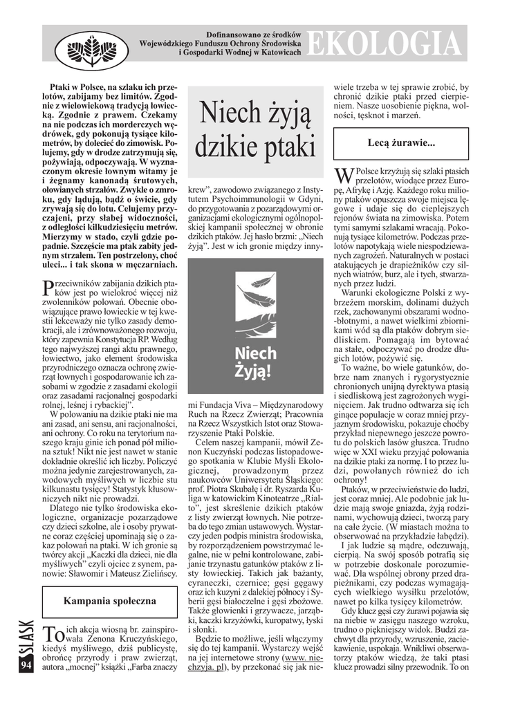 Ptakiw Polsce,na szlakuichprzelotów,zabijamybezlimitów.Zgodniez wielowiekowątradycjąłowiecką. Zgodnie z prawem. Czekamy na niepodczasichmorderczychwędrówek,gdypokonujątysiącekilometrów,bydoleciećdo zimowisk.Polujemy,gdyw drodzezatrzymująsię, pożywiają,odpoczywają.W wyznaczonymokresiełownymwitamyje i żegnamy kanonadą śrutowych, ołowianychstrzałów.Zwykleo zmroku,gdylądują,bądźo świcie,gdy zrywająsiędo lotu.Celujemyprzyczajeni, przy słabej widoczności, z odległościkilkudziesięciumetrów. Mierzymyw stado,czyligdziepopadnie.Szczęściemaptakzabityjednymstrzałem.Tenpostrzelony,choć uleci...i takskona w męczarniach. Niech żyją dzikie ptaki krew”, zawodowo związanego z Instytutem Psychoimmunologii w Gdyni, do przygotowania z pozarządowymi organizacjami ekologicznymi ogólnopolskiej kampanii społecznej w obronie dzikich ptaków. Jej hasło brzmi: „Niech żyją”. Jest w ich gronie między inny- rzeciwników zabijania dzikich ptaków jest po wielokroć więcej niż P zwolenników polowań. Obecnie obo- wiązujące prawo łowieckie w tej kwestii lekceważy nie tylko zasady demokracji, ale i zrównoważonego rozwoju, który zapewnia Konstytucja RP. Według tego najwyższej rangi aktu prawnego, łowiectwo, jako element środowiska przyrodniczego oznacza ochronę zwierząt łownych i gospodarowanie ich zasobami w zgodzie z zasadami ekologii oraz zasadami racjonalnej gospodarki rolnej, leśnej i rybackiej”. W polowaniu na dzikie ptaki nie ma ani zasad, ani sensu, ani racjonalności, ani ochrony. Co roku na terytorium naszego kraju ginie ich ponad pół miliona sztuk! Nikt nie jest nawet w stanie dokładnie określić ich liczby. Policzyć można jedynie zarejestrowanych, zawodowych myśliwych w liczbie stu kilkunastu tysięcy! Statystyk kłusowniczych nikt nie prowadzi. Dlatego nie tylko środowiska ekologiczne, organizacje pozarządowe czy dzieci szkolne, ale i osoby prywatne coraz częściej upominają się o zakaz polowań na ptaki. W ich gronie są twórcy akcji „Kaczki dla dzieci, nie dla myśliwych” czyli ojciec z synem, panowie: Sławomir i Mateusz Zielińscy. Kampaniaspołeczna ich akcja wiosną br. zainspirowała Zenona Kruczyńskiego, To kiedyś myśliwego, dziś publicystę, 94 obrońcę przyrody i praw zwierząt, autora „mocnej” książki „Farba znaczy mi Fundacja Viva – Międzynarodowy Ruch na Rzecz Zwierząt; Pracownia na Rzecz Wszystkich Istot oraz Stowarzyszenie Ptaki Polskie. Celem naszej kampanii, mówił Zenon Kuczyński podczas listopadowego spotkania w Klubie Myśli Ekologicz nej, pro wa dzo nym przez naukowców Uniwersytetu Śląskiego: prof. Piotra Skubałę i dr. Ryszarda Kuliga w katowickim Kinoteatrze „Rialto”, jest skreślenie dzikich ptaków z listy zwierząt łownych. Nie potrzeba do tego zmian ustawowych. Wystarczy jeden podpis ministra środowiska, by rozporządzeniem powstrzymać legalne, nie w pełni kontrolowane, zabijanie trzynastu gatunków ptaków z listy łowieckiej. Takich jak bażanty, cyraneczki, czernice; gęsi gęgawy oraz ich kuzyni z dalekiej północy i Syberii gęsi białoczelne i gęsi zbożowe. Także głowienki i grzywacze, jarząbki, kaczki krzyżówki, kuropatwy, łyski i słonki. Będzie to możliwe, jeśli włączymy się do tej kampanii. Wystarczy wejść na jej internetowe strony (www. niechzyja. pl), by przekonać się jak nie- wiele trzeba w tej sprawie zrobić, by chronić dzikie ptaki przed cierpieniem. Nasze uosobienie piękna, wolności, tęsknot i marzeń. Lecążurawie... Polsce krzyżują się szlaki ptasich W przelotów, wiodące przez Europę, Afrykę i Azję. Każdego roku milio- ny ptaków opuszcza swoje miejsca lęgowe i udaje się do cieplejszych rejonów świata na zimowiska. Potem tymi samymi szlakami wracają. Pokonują tysiące kilometrów. Podczas przelotów napotykają wiele niespodziewanych zagrożeń. Naturalnych w postaci atakujących je drapieżników czy silnych wiatrów, burz, ale i tych, stwarzanych przez ludzi. Warunki ekologiczne Polski z wybrzeżem morskim, dolinami dużych rzek, zachowanymi obszarami wodno-błotnymi, a nawet wielkimi zbiornikami wód są dla ptaków dobrym siedli skiem. Po ma ga ją im by to wać na stałe, odpoczywać po drodze długich lotów, pożywić się. To ważne, bo wiele gatunków, dobrze nam znanych i rygorystycznie chronionych unijną dyrektywa ptasią i siedliskową jest zagrożonych wyginięciem. Jak trudno odtwarza się ich ginące populacje w coraz mniej przyjaznym środowisku, pokazuje choćby przykład niepewnego jeszcze powrotu do polskich lasów głuszca. Trudno więc w XXI wieku przyjąć polowania na dzikie ptaki za normę. I to przez ludzi, po wo ła nych rów nież do ich ochrony! Ptaków, w przeciwieństwie do ludzi, jest coraz mniej. Ale podobnie jak ludzie mają swoje gniazda, żyją rodzinami, wychowują dzieci, tworzą pary na całe życie. (W miastach można to obserwować na przykładzie łabędzi). I jak ludzie są mądre, odczuwają, cierpią. Na swój sposób potrafią się w potrzebie doskonale porozumiewać. Dla wspólnej obrony przed drapieżnikami, czy podczas wymagających wielkiego wysiłku przelotów, nawet po kilka tysięcy kilometrów. Gdy klucz gęsi czy żurawi pojawia się na niebie w zasięgu naszego wzroku, trudno o piękniejszy widok. Budzi zachwyt dla przyrody, wzruszenie, zaciekawienie, uspokaja. Wnikliwi obserwatorzy ptaków wiedzą, że taki ptasi klucz prowadzi silny przewodnik. To on toruje drogę uformowanemu, najczęściej rodzinnemu stadu. W trakcie lotu ani przez chwilę nie przestaje „rozcinać” powietrza swoimi skrzydłami, omijając jego silne prądy w taki sposób, by stawiało jak najmniejszy opór, mocno z sobą zżytej ptasiej rodzinie. Taki klucz płynie sobie po niebie. Do czasu, aż zacznie zniżać lot. Największe niebezpieczeństwa czyhają na przelatujące stadami dzikie gęsi czy kaczki w okresie łownym, gdy docierają one do znanych sobie i ludziom miejsc
