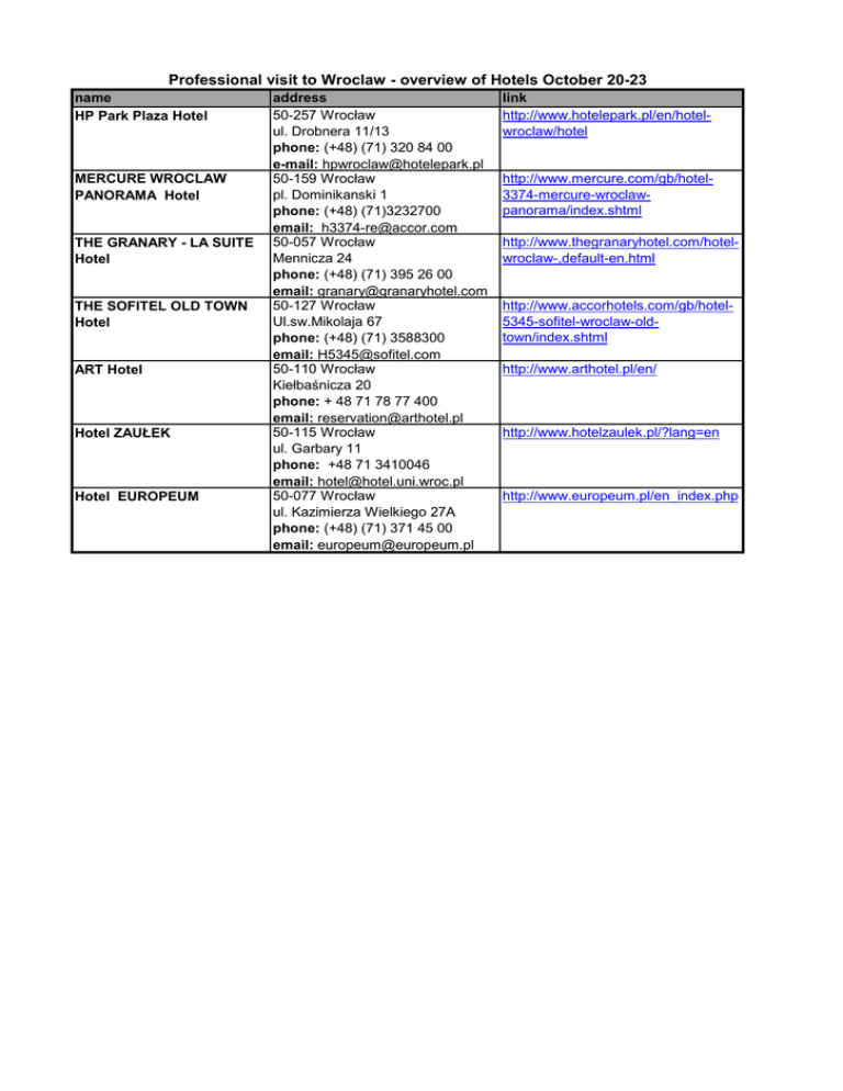 Professional visit to Wroclaw - overview of Hotels October 20-23 name HP Park Plaza Hotel MERCURE WROCLAW PANORAMA Hotel THE GRANARY - LA SUITE Hotel THE SOFITEL OLD TOWN Hotel ART Hotel Hotel ZAUŁEK Hotel EUROPEUM address 50-257 Wrocław ul. Drobnera 11/13 phone: (+48) (71) 320 84 00 e-mail: [email protected] 50-159 Wrocław pl. Dominikanski 1 phone: (+48) (71)3232700 email: [email protected] 50-057 Wrocław Mennicza 24 phone: (+48) (71) 395 26 00 email: [email protected] 50-127 Wrocław Ul.sw.Mikolaja 67 phone: (+48) (71) 3588300 email: [email protected] 50-110 Wrocław Kiełbaśnicza 20 phone: + 48 71 78 77 400 email: [email protected] 50-115 Wrocław ul. Garbary 11 phone: +48 71 3410046 email: [email protected] 50-077 Wrocław ul. Kazimierza Wielkiego 27A phone: (+48) (71) 371 45 00 email: [email protected] link http://www.hotelepark.pl/en/hotelwroclaw/hotel http://www.mercure.com/gb/hotel3374-mercure-wroclawpanorama/index.shtml http://www.thegranaryhotel.com/hotelwroclaw-,default-en.html http://www.accorhotels.com/gb/hotel5345-sofitel-wroclaw-oldtown/index.shtml http://www.arthotel.pl/en/ http://www.hotelzaulek.pl/?lang=en http://www.europeum.pl/en_index.php