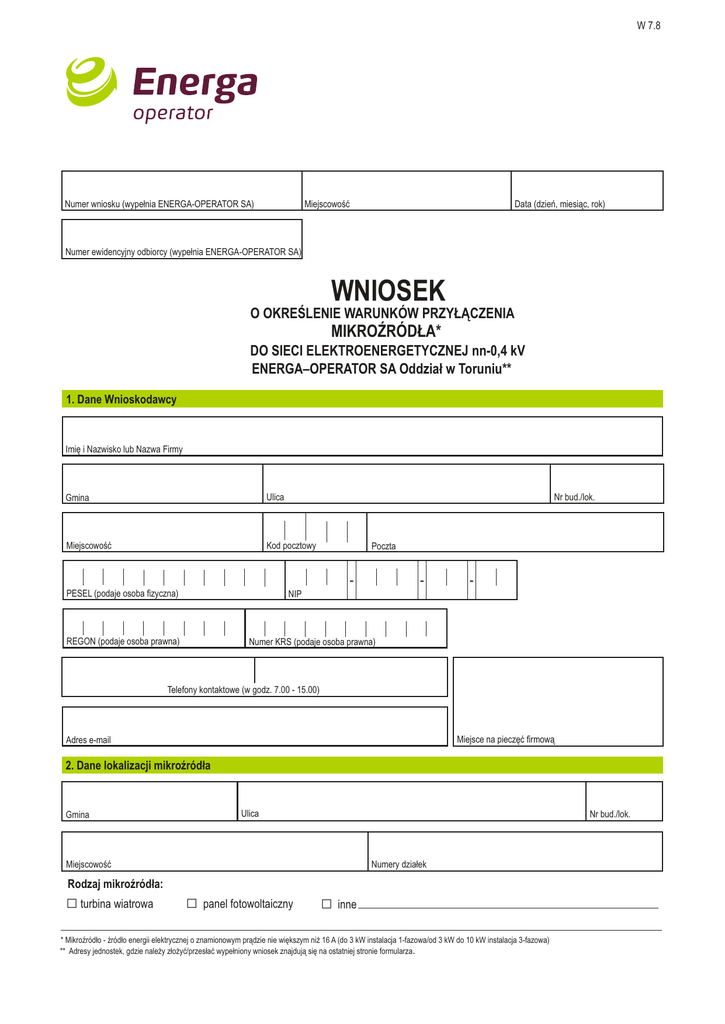 W 7.8 Miejscowość Numer wniosku (wypełnia ENERGA-OPERATOR SA) Data (dzień, miesiąc, rok) Numer ewidencyjny odbiorcy (wypełnia ENERGA-OPERATOR SA) WNIOSEK O OKREŚLENIE WARUNKÓW PRZYŁĄCZENIA MIKROŹRÓDŁA* DO SIECI ELEKTROENERGETYCZNEJ nn-0,4 kV ENERGA–OPERATOR SA Oddział w Toruniu** 1. Dane Wnioskodawcy Imię i Nazwisko lub Nazwa Firmy Gmina Ulica Miejscowość Kod pocztowy Nr bud./lok. Poczta PESEL (podaje osoba fizyczna) - - NIP REGON (podaje osoba prawna) Numer KRS (podaje osoba prawna) Telefony kontaktowe (w godz. 7.00 - 15.00) Miejsce na pieczęć firmową Adres e-mail 2. Dane lokalizacji mikroźródła Gmina Ulica Nr bud./lok. Numery działek Miejscowość Rodzaj mikroźródła: □ turbina wiatrowa □ panel fotowoltaiczny □ inne * Mikroźródło - źródło energii elektrycznej o znamionowym prądzie nie większym niż 16 A (do 3 kW instalacja 1-fazowa/od 3 kW do 10 kW instalacja 3-fazowa) ** Adresy jednostek, gdzie należy złożyć/przesłać wypełniony wniosek znajdują się na ostatniej stronie formularza. 3. Wniosek dotyczy: □ przyłączenia mikroźródła do projektowanego obiektu □ przyłączenia mikroźródła bezpośrednio do sieci elektroenergetycznej □ przyłączenia mikroźródła do istniejącego obiektu (aktualna moc przyłączeniowa kW, nr umowy Lokalizacja układu pomiarowo-rozliczenowego: Typ instalacji: □ jednofazowa lub nr licznika □ w miejscu ogólnie dostępnym □ trójfazowa ) □ w miejscu ogólnie niedostępnym 4. Moc i energia Moc mikroźródła kW Przewidywana roczna produkcja energii elektrycznej kWh Przewidywany termin rozpoczęcia poboru/dostarczania energii elektrycznej: Data 5. Dodatkowe uwagi Wnioskodawcy Oświadczenie Oświadczam, że dane przedstawione w niniejszym WNIOSKU odpowiadają stanowi faktycznemu. Oświadczam, że wyrażam zgodę na przetwarzanie moich danych osobowych, zgodnie z ustawą, z dnia 29 sierpnia 1997 r. o ochronie danych osobowych (Dz. U. Nr 133, poz. 883, tekst jednolity: Dz. U. z 2004 r. Nr 101, poz 926, z późn. zm.), przez ENERGA-OPERATOR SA w celu określenia warunków przyłączenia, zawarcia umowy o przyłączenie do sieci oraz realizacji przyłączenia do sieci elektroenergetycznej. Przyjmuję jednocześnie do wiadomości, ze mam prawo żądania informacji o zakresie przetwarzania moich danych osobowych, prawo dostępu do treści tych danych, uzupełnienia, uaktualnienia i sprostowania danych, gdy są niekompletne, nieaktualne lub nieprawdziwe. Oświadczam, że wyrażam zgodę na publikowanie przez ENERGA-OPERATOR SA informacji dotyczących mojej siedziby lub miejsca zamieszkania, lokalizacji przyłączenia, mocy przyłączeniowej, daty wydania warunków przyłączenia, zawarcia umowy o przyłączenie do sieci i rozpoczęcia dostarczania energii elektrycznej. Oświadczam, że wyrażam zgodę na przesyłanie dokumentów zawierających moje dane osobowe drogą pocztową. ENERGA-OPERATOR SA nie ponosi odpowiedzialności za utracone w tym przypadku dane. Odbiór warunków przyłączenia i projektu umowy o przyłączenie: □ proszę przesłać pocztą na adres*: □ odbiorę osobiście W przypadku nie odebrania warunków przyłączenia w terminie 7 dni od daty powiadomienia, zostaną one wysłane na adres widniejący we wniosku. Podpis Wnioskodawcy 6. Załączniki Dokument potwierdzający tytuł prawny WNIOSKODAWCY do korzystania z obiektu lub nieruchomości, w którym będą używane urządzenia, instalacje lub sieci elektryczne należące do WNIOSKODAWCY. Plan zabudowy na mapie sytuacyjno-wysokościowej lub za zgodą ENERGA–OPERATOR SA szkic sytuacyjny, określający usytuowanie przyłączanego mikroźródła. względem istniejącej sieci oraz usytuowanie sąsiednich obiektów. Parametry techniczne, charakterystykę ruchową i eksploatacyjną przyłączanych urządzeń, instalacji lub sieci w tym specyfikację techniczną mikroźródła. Planowany elektryczny schemat wewnętrzny obiektu uwzględniający przyłączenie mikroźródła. Dodatkowe załączniki □ upoważnienie do reprezentowania Wnioskodawcy (jeżeli Wnioskodawcę reprezentuje inna jednostka) □ inne W przypadku, gdy informacje podane przez WNIOSKODAWCĘ, w tym dokumenty dołączone do WNIOSKU, są niepełne, źle wypełnione, niejasne, nieczytelne, z a w i e r a j ą b ł ę d y, s ą n i e z g o d n e z z a k r e s e m i t p . l u b g d y i s t n i e j e p o t r z e b a i c h uzupełnienia o dodatkowe informacje, złożony WNIOSEK nie jest Wnioskiem w rozumieniu ustawy - Prawo energetyczne i w związku z tym nie będzie rozpatrzony. Dane adresowe jednostek rozpatrujących wnioski o określenie warunków przyłączenia do sieci elektroenergetycznej: ENERGA-OPERATOR SA Oddział w Toruniu, Ul. Gen Bema 128, 87-100 Toruń * podać w przypadku, gdy adres jest inny niż w punkcie 1. wniosku