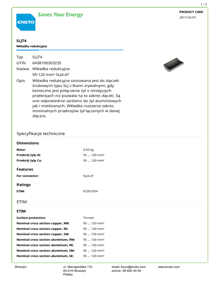 1/2 PRODUCT CARD 2017-03-07 SLJT4 Wkładka redukcyjna Typ SLJT4 GTIN 6438100303235 Nazwa Wkładka redukcyjna 95-120 mm² SLJ4.47 Opis Wkładka redukcyjna stosowana jest do złączek śrubowych typu SLJ z łbami zrywalnymi, gdy konieczne jest połączenie żył o mniejszych przekrojach niż pozwala na to zakres złączki. Są one odpowiednie zarówno do żył aluminiowych jak i miedzianych. Wkładka rozszerza zakres minimalnych przekrojów żył łączonych w danej złączce. Specyfikacje techniczne Dimensions Masa: Przekrój żyły Al: Przekrój żyły Cu: 0.03 kg 95 ... 120 mm² 95 ... 120 mm² Features For connector: SLJ4.47 Ratings ETIM: EC001054 ETIM ETIM Surface protection: Nominal cross section copper, RM: Nominal cross section copper, RE: Nominal cross section copper, SM: Nominal cross section aluminium, RM: Nominal cross section aluminium, RE: Nominal cross section aluminium, SM: Nominal cross section aluminium, SE: Straszyn Tinned 95 ... 120 mm² 95 ... 120 mm² 95 ... 120 mm² 95 ... 120 mm² 95 ... 120 mm² 95 ... 120 mm² 95 ... 120 mm² ul. Starogardzka 17a 83-010 Straszyn Polska email: [email protected] phone: 58 692 40 00 www.ensto.com 2/2 Material conductor: Straszyn Aluminium/copper ul. Starogardzka 17a 83-010 Straszyn Polska email: [email protected] phone: 58 692 40 00 www.ensto.com